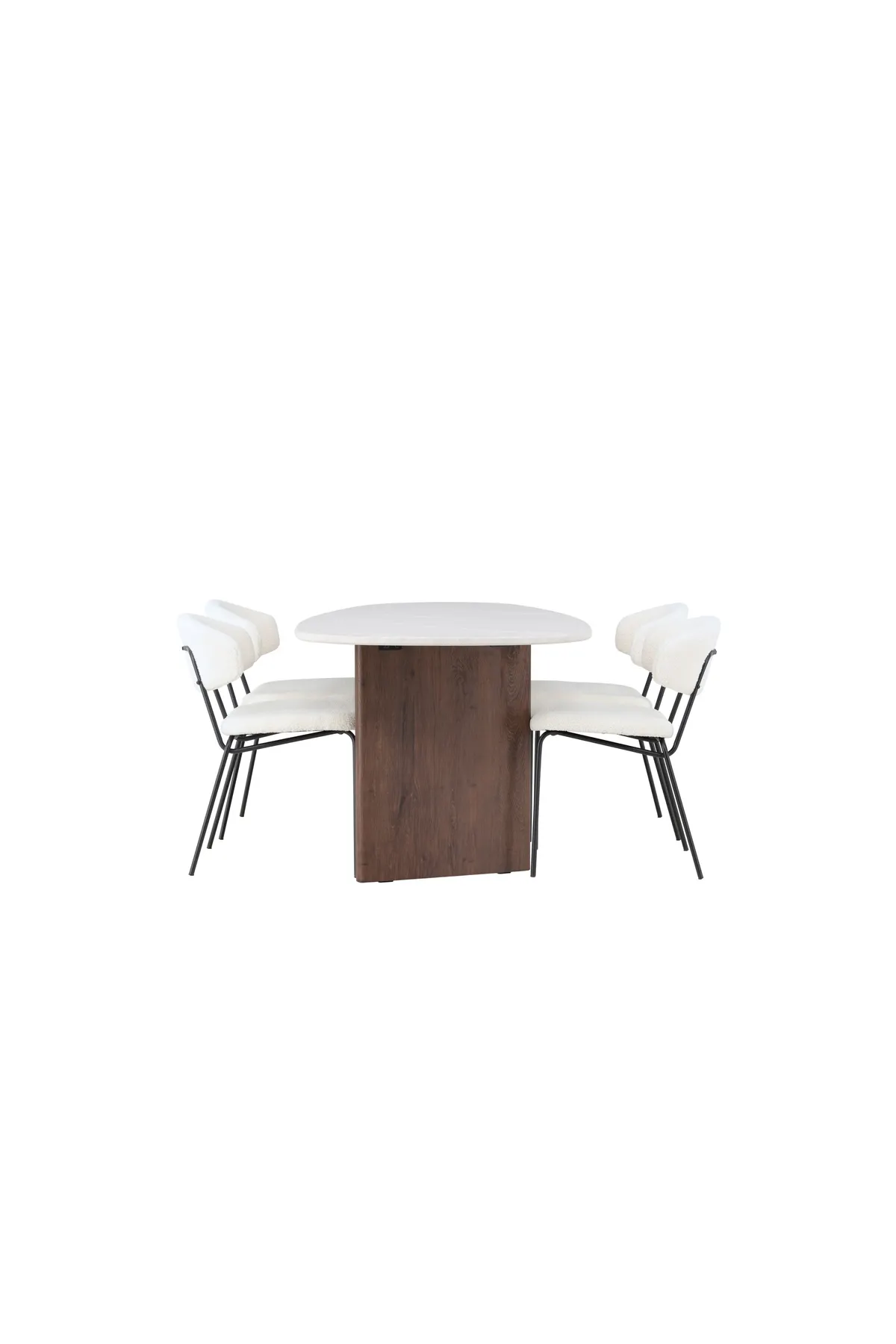 Richten Sie Ihr Zuhause in einem modernen und einzigartigen Stil mit einer geschmackvollen Essgruppe im skandinavischen Design ein, die durch ihr durchdachtes Design und ihre trendige Aufteilung besticht! Unser ovaler Esstisch Grönvik hat eine unregelmäßige Tischplatte aus hellgrauem MDF mit Marmoroptik. Das saubere und stilvolle Aussehen der Tischplatte bildet einen schönen Kontrast zu den beiden dünnen Holzscheiben in einem dunklen Braunton, die den Tisch tragen und dem Mittelpunkt eine moderne und einzigartige Note verleihen. Abmessungen des Tisches: 180×75 cm.
