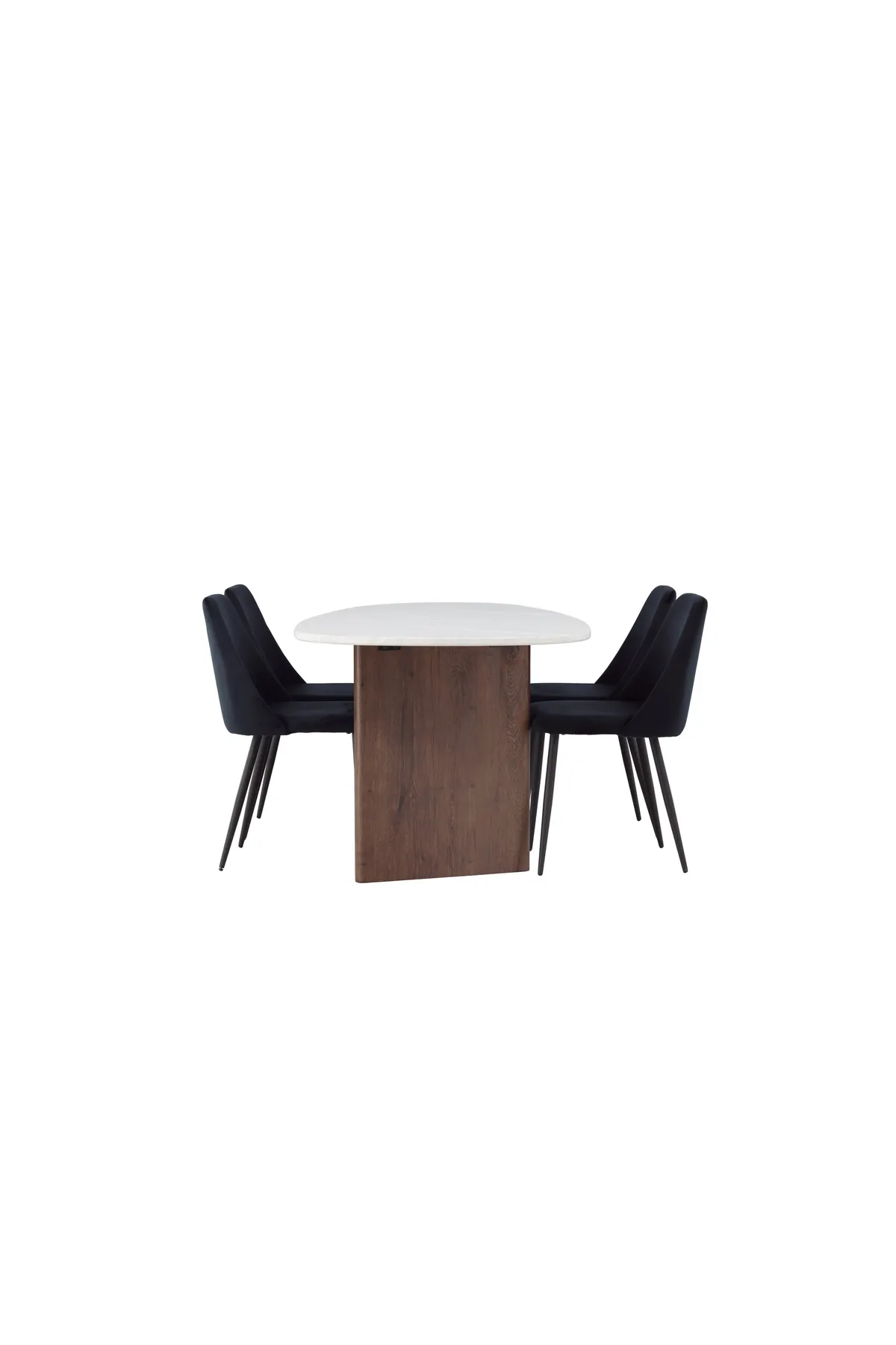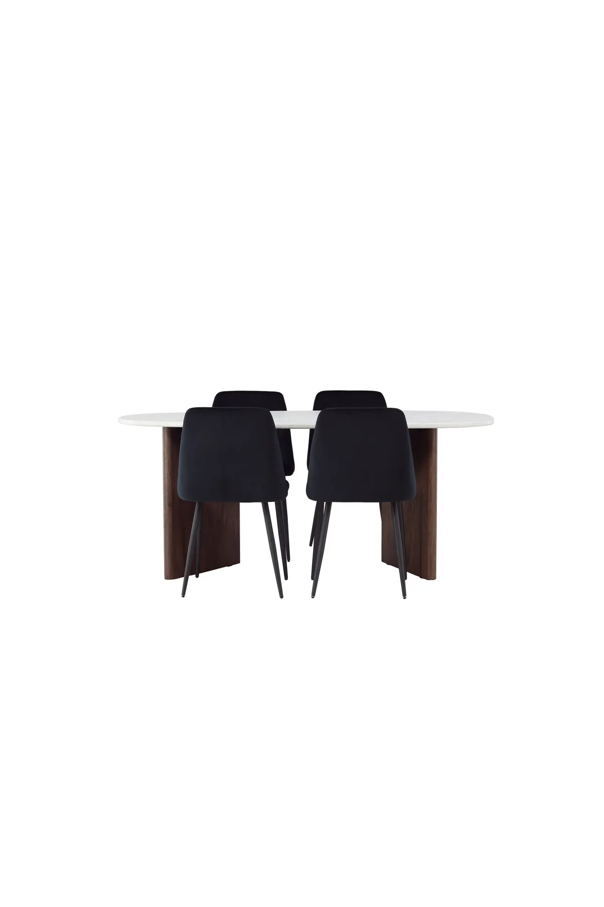 Das Esstischset, das Ihre Einrichtung mit seinem skandinavischen Design und seiner außergewöhnlichen Handwerkskunst aufwertet. Dieses Esstischset ist das, wovon Sie geträumt haben, und es wird schnell zum Mittelpunkt in Ihrem Zuhause werden! Unser ovaler Esstisch Grönvik verfügt über eine unregelmäßige Tischplatte aus hellgrauem MDF in Betonoptik, die Ihrer Einrichtung eine einzigartige Note verleiht. Die dünnen dunkelbraunen Holzplatten, die den Tisch tragen, verleihen ihm einen eleganten und stabilen Touch. Mit diesem Tisch schaffen Sie schnell eine Umgebung, die Stil und Charme ausstrahlt. Abmessungen: 180×75 cm.