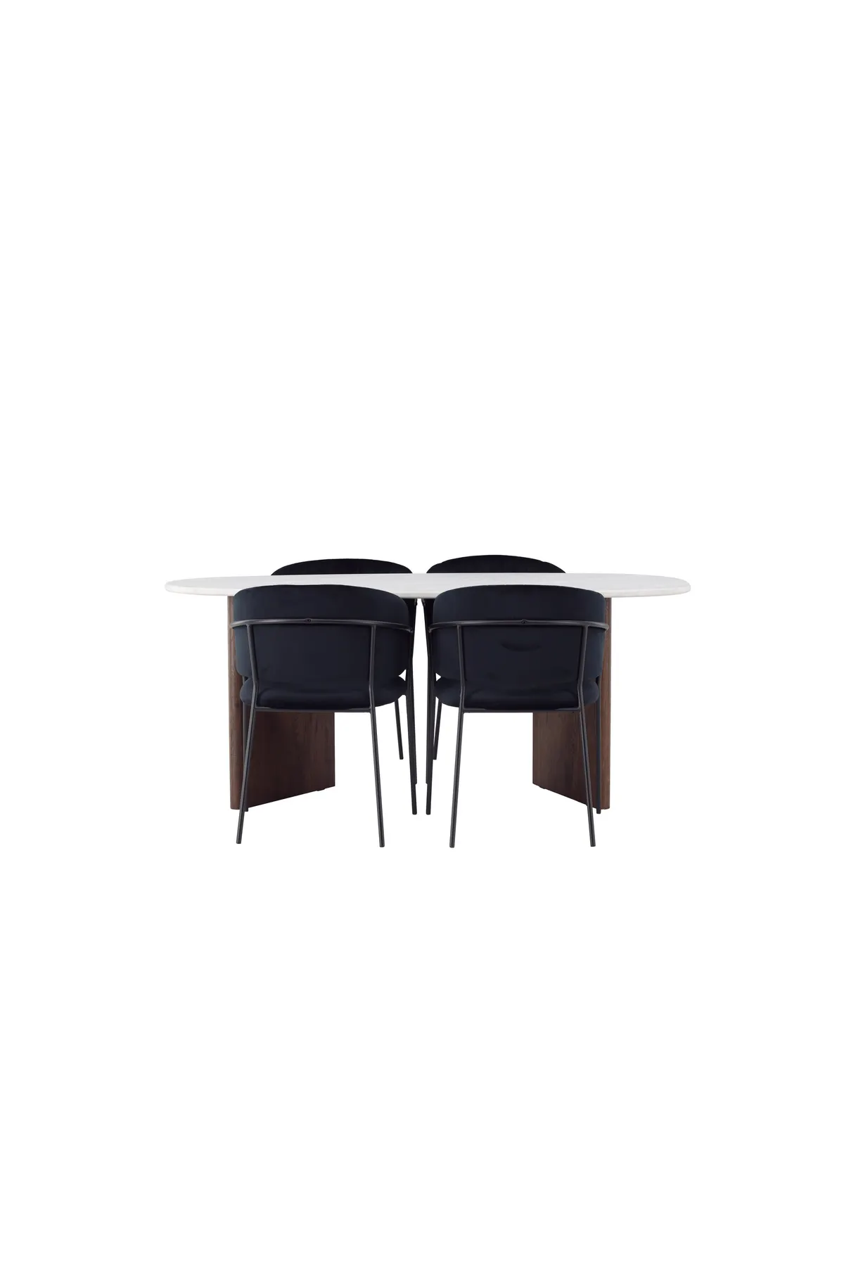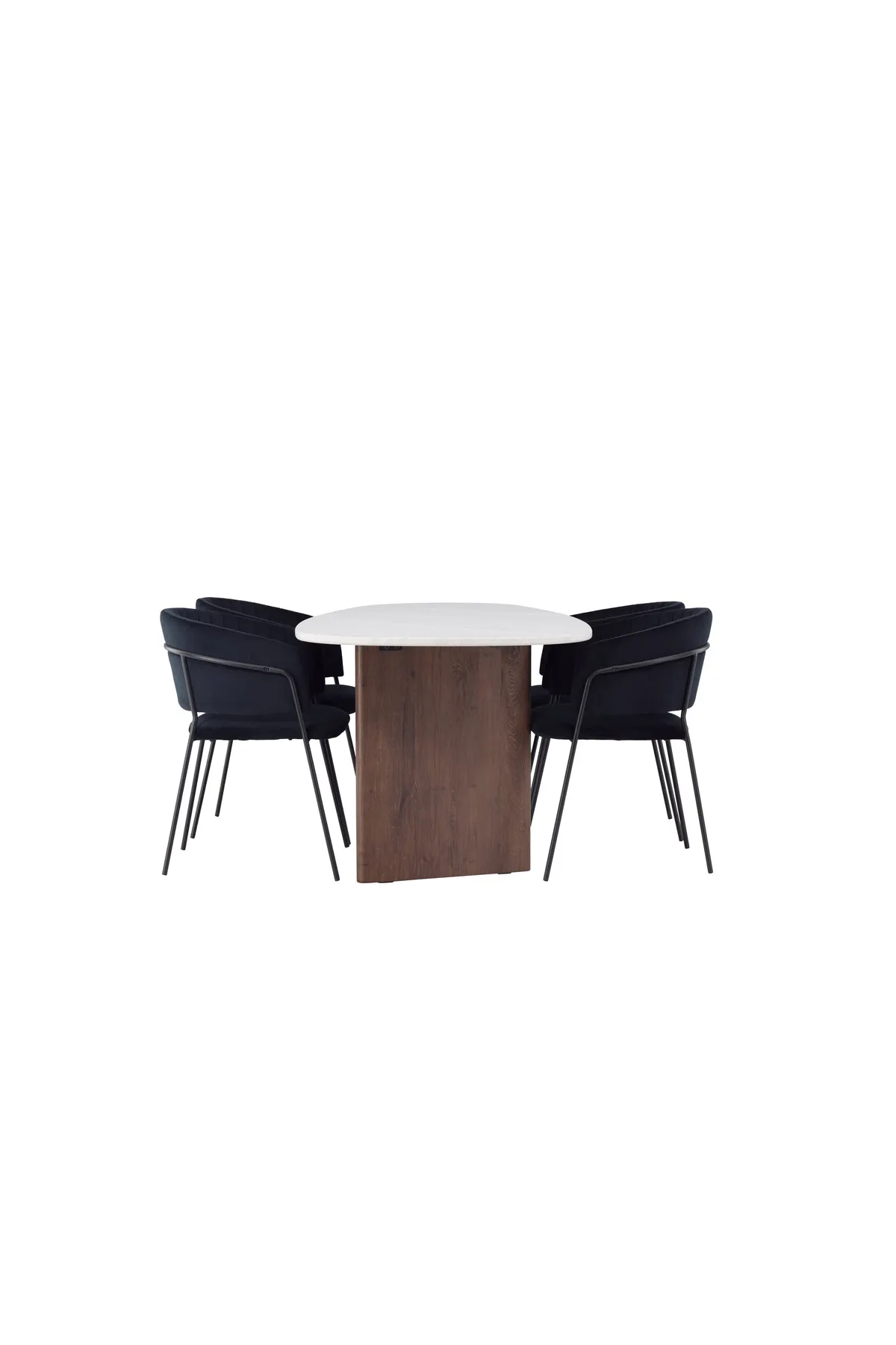 Wir stellen Ihnen eine zauberhafte Essgruppe vor, die Stil und Komfort auf die bestmögliche Art und Weise verbindet! Unser ovaler Esstisch, Grönvik, hat eine unregelmäßige Tischplatte aus hellgrauem MDF mit Marmoroptik. Die Struktur des Tisches besteht aus zwei dünnen Holzplatten in einem modernen dunkelbraunen Farbton, die die schöne Tischplatte tragen. Diese Elemente schaffen ein perfektes Gleichgewicht zwischen Eleganz und Natürlichkeit und verleihen der Essgruppe eine einzigartige und exklusive Note. Abmessungen des Tisches: 180x75cm.
