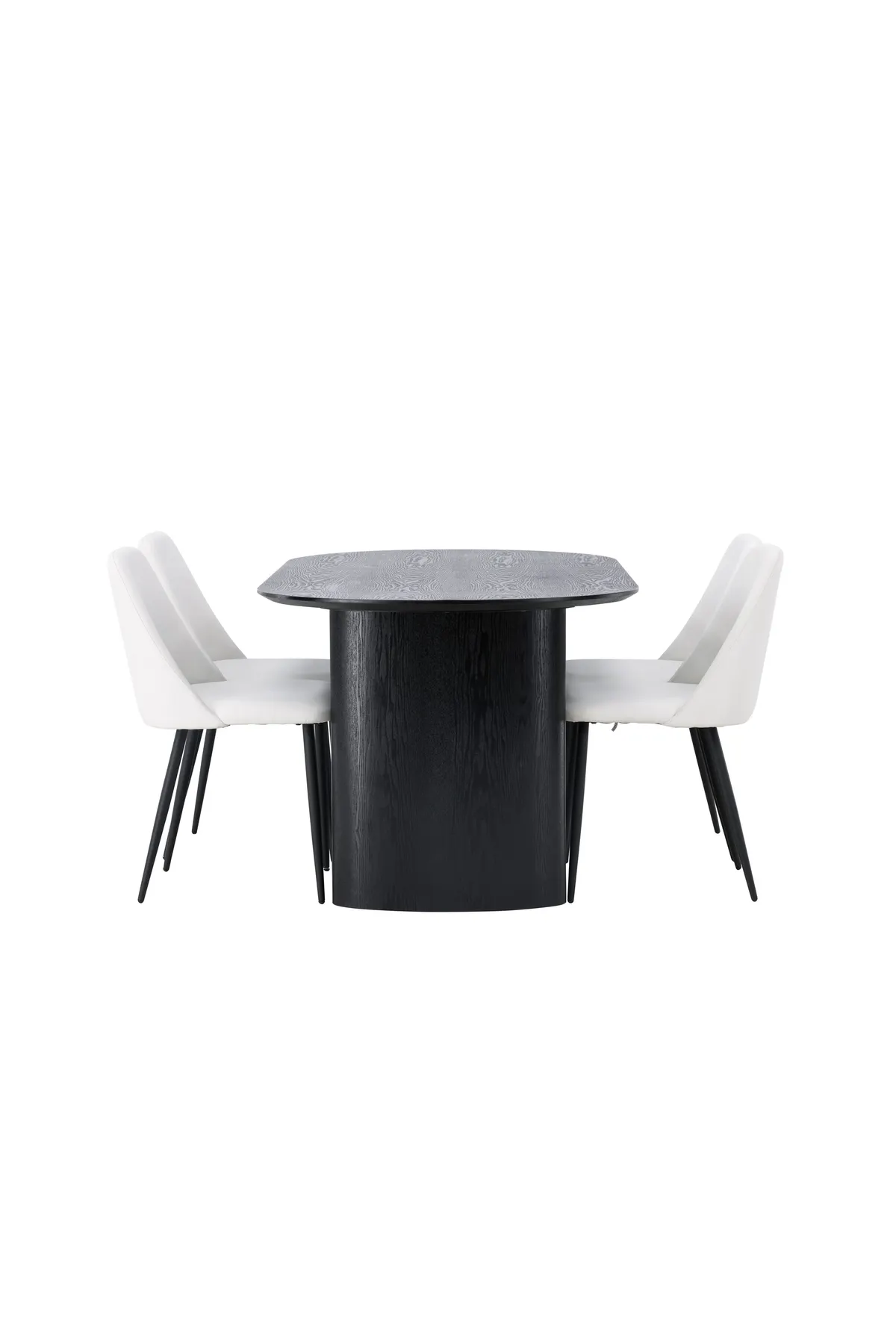 Das passt zusammen! Der ovale Esstisch Isolde in schwarzer Farbe hat ein modernes Design mit einer ovalen Tischplatte aus MDF und einem robusten Gestell, das einen stabilen Eindruck vermittelt. Das lebendige Material gibt dem Blickfang eine schöne Bewegung. Hier in stilvoller Kombination mit weißen Esszimmerstühlen aus der Serie Night. Der Stuhl hat eine vollgepolsterte Sitzfläche aus weißem PU-Polster, die sich ebenso luxuriös wie elegant anfühlt, und die Beine sind aus schwarzem Stahl. Die Sitzfläche ist für zusätzlichen Komfort ebenfalls gepolstert. Gehen Sie keine Kompromisse zwischen Stil und Komfort ein! Abmessungen des Tisches: 180x75cm.