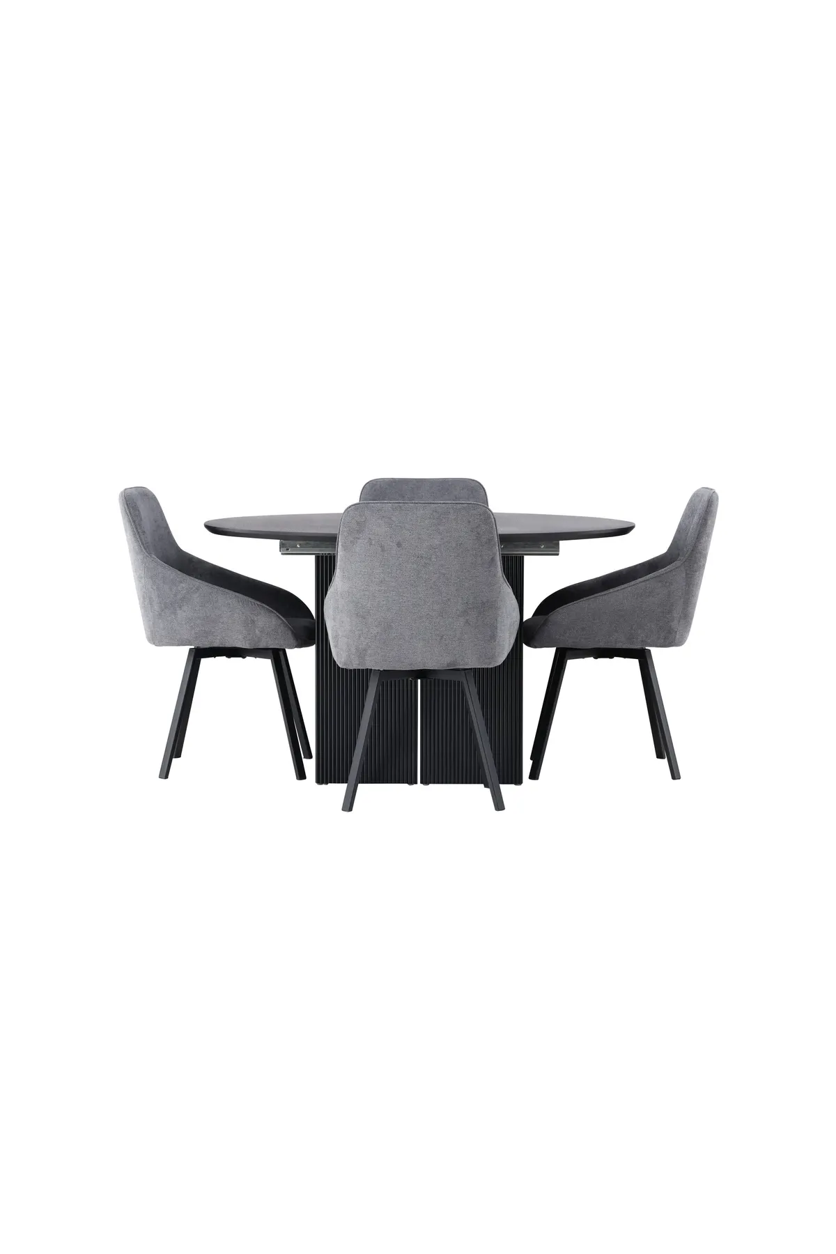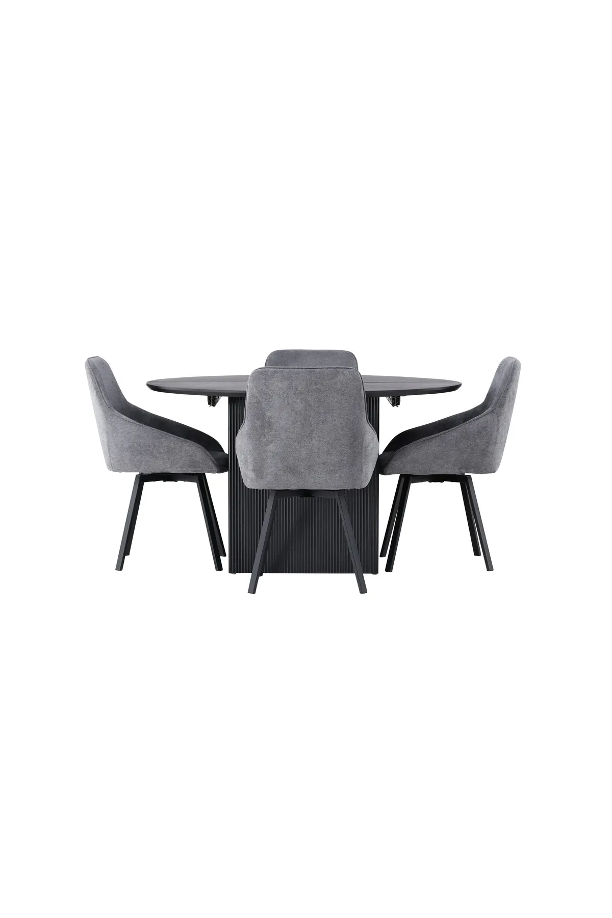Hier haben wir den schwarzen Esstisch Matilda mit unseren wunderschönen grauen Esszimmerstühlen Rosie kombiniert. Diese Stühle im skandinavischen Design haben voll gepolsterte Sitze mit integrierten Armlehnen aus grauem Stoff und leicht ausgestellte Stuhlbeine aus schwarzem Metall. Die weiche Sitzfläche ist für zusätzlichen Komfort gepolstert, so dass Sie lange und angenehme Mahlzeiten mit Leichtigkeit genießen können.
