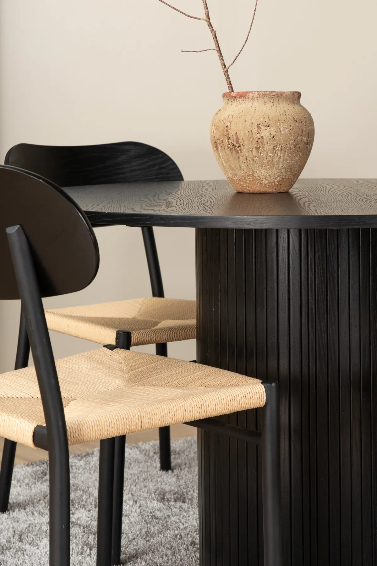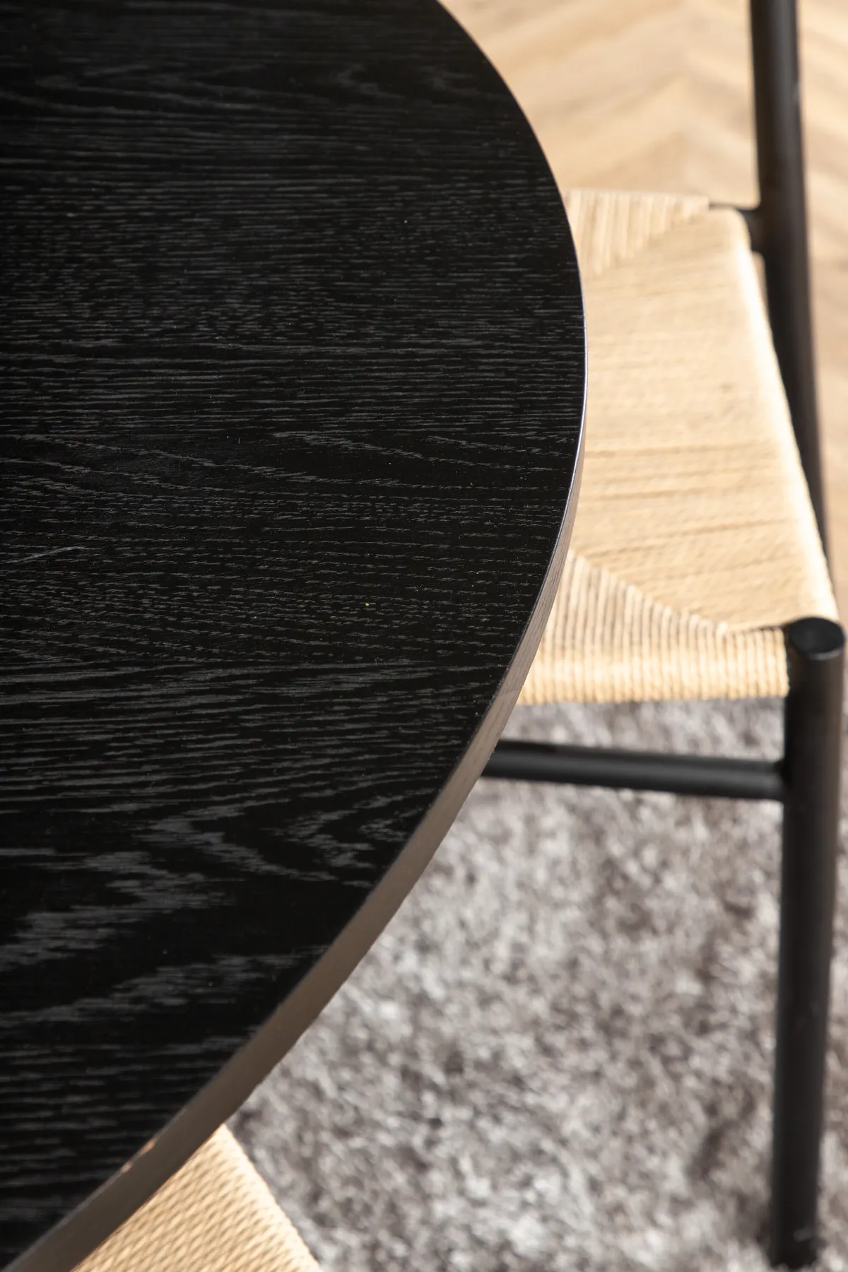 Eine köstlich passende Essgruppe in modernem Design – was will man mehr? Rund um unseren runden Esstisch Bianca schaffen Sie eine wunderbare Gemeinschaft, bei der niemand Gefahr läuft, an den Rand zu geraten. Die Tischplatte ist aus MDF gefertigt und hat ein zylinderförmiges Gestell in robuster Ausführung und Rippenoptik. Die durchgehend schwarze Farbe ist ebenso zeitlos wie stilvoll und lässt sich gut mit anderen Einrichtungen kombinieren. Tischabmessungen: Durchmesser: 110cm, Höhe: 74cm. Kombiniert hier mit 4 Polly Esszimmerstühlen in schwarzer Farbe mit Stuhlbeinen aus Metall und naturfarbenen Sitzflächen aus Seilen. Abmessungen der Stühle: Höhe: 88cm, Sitzhöhe: 47cm, Breite: 42cm, Tiefe: 55cm. Genießen Sie alle Mahlzeiten des Tages!