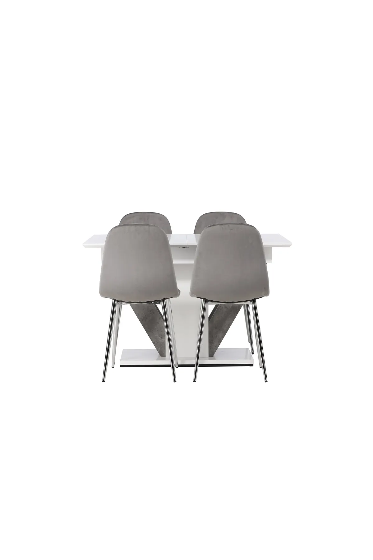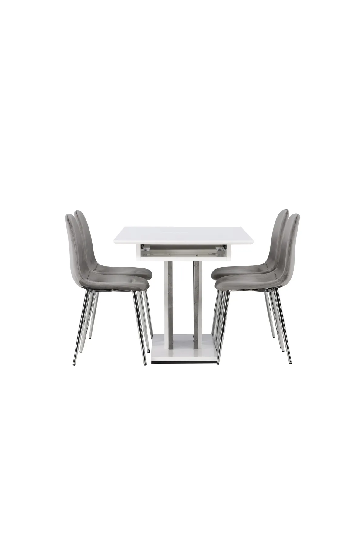 Zusammen mit dem ausziehbaren Esstisch bieten wir unsere hellgrauen Esszimmerstühle aus der Eva-Serie an. Diese Stühle haben ein vollgepolstertes Design mit einer leicht abgerundeten Rückenlehne und einer Sitzfläche aus luxuriösem Samtstoff. Die schönen hellgrauen Metallbeine verleihen dem Esstischset einen modernen Touch und machen es zu einem charmanten Mittelpunkt in Ihrem Zuhause. Verleihen Sie Ihrem Wohnzimmer mit diesem Esstischset den Stil, den es verdient!