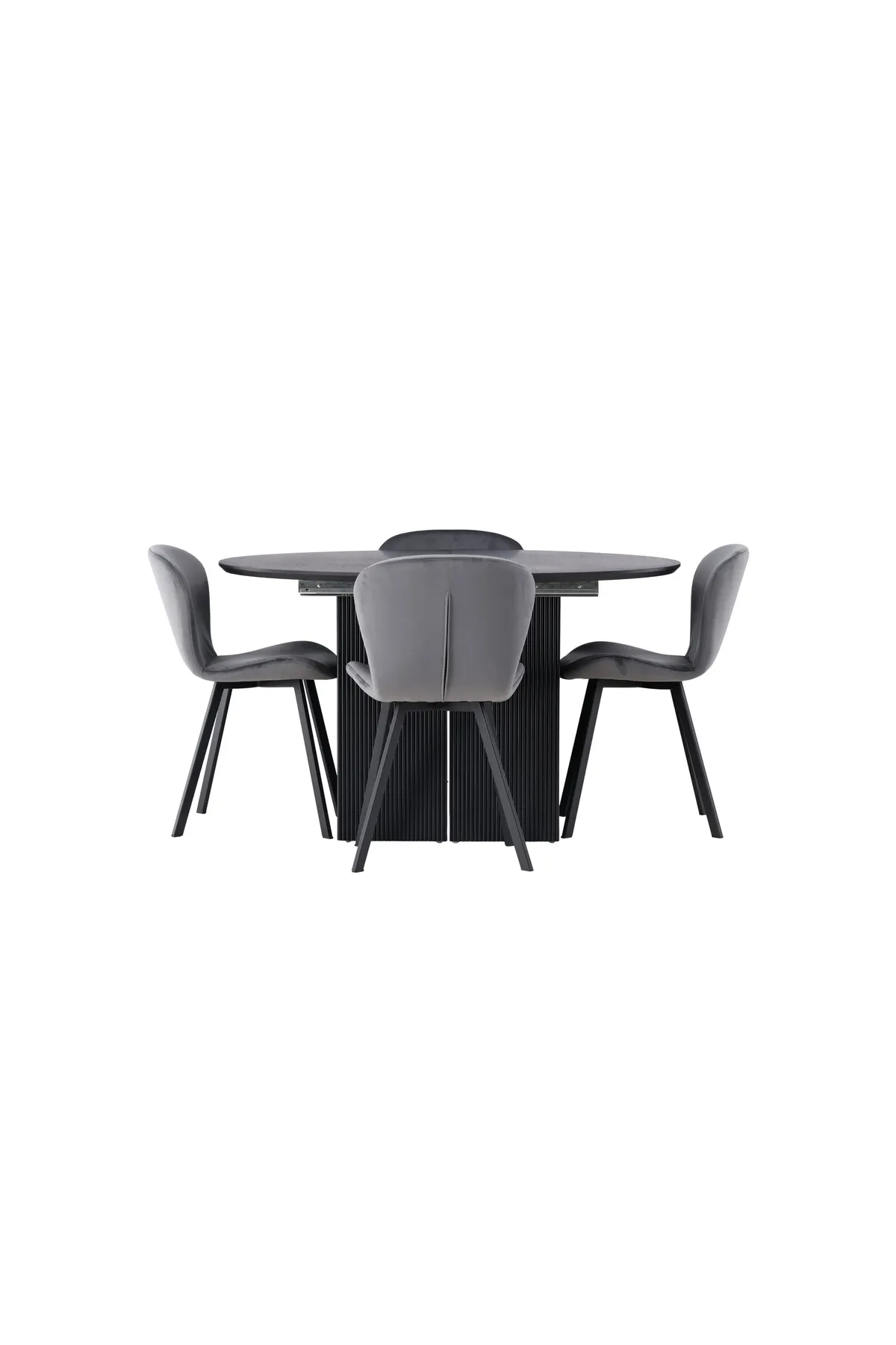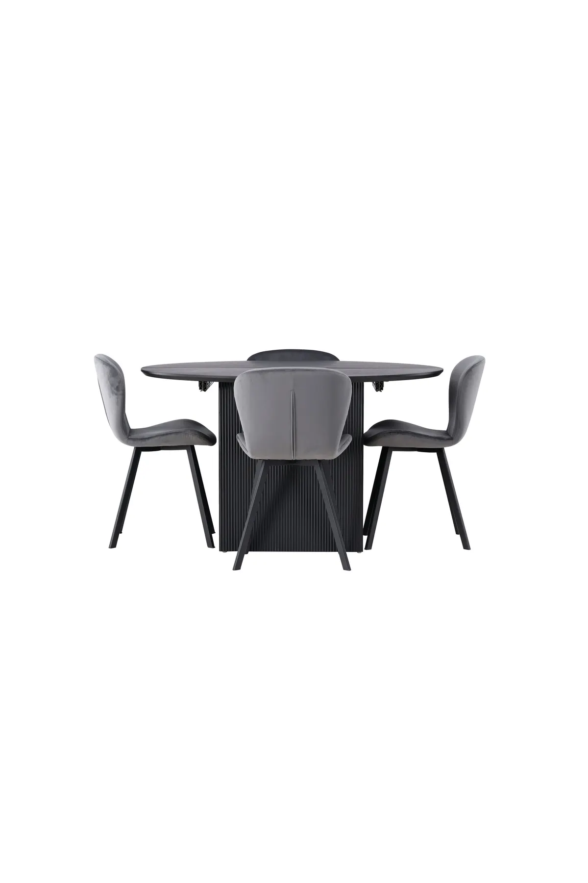 Um ein komplettes Esstisch-Set zu schaffen, haben wir den Esstisch mit den eleganten Stühlen aus der Lilja-Serie kombiniert. Mit ihrer geschmeidigen, abgerundeten Form und den Sitzen aus grauem Polyestergewebe bietet Lilja einen bequemen und stilvollen Sitzplatz. Die leicht ausgestellten schwarzen Stuhlbeine aus Metall verleihen dem Gesamteindruck einen modernen und eleganten Touch.