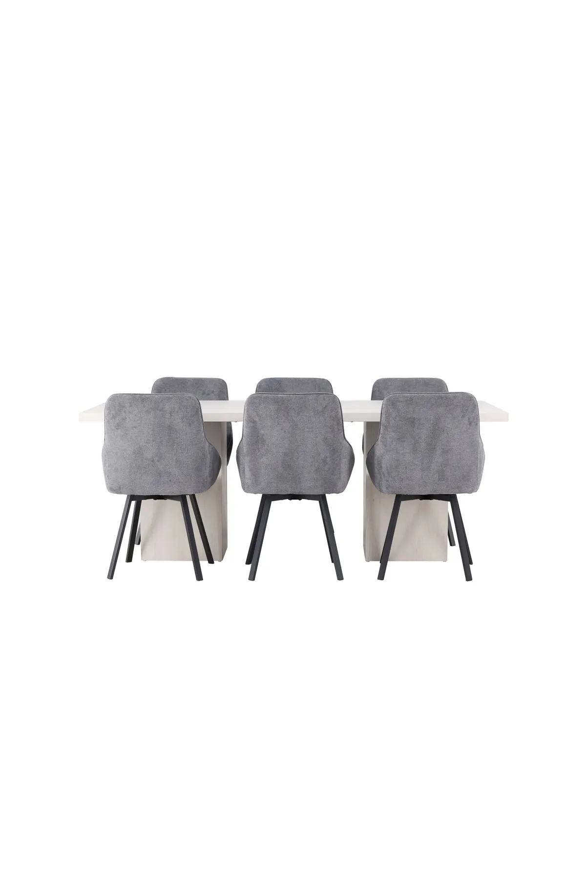 Hier, in perfekter Kombination, unsere grauen Esszimmerstühle aus der Serie Rosie. Das skandinavische Design des Stuhls ist eine Augenweide, mit einem voll gepolsterten Sitz und integrierten Armlehnen aus grauem Stoff. Die Stuhlbeine aus schwarzem Metall sind leicht nach außen gebogen und verleihen Ihrer Einrichtung ein luftiges Gefühl. Der gepolsterte Sitz bietet wunderbaren Komfort, so dass Sie jeden Moment Ihrer Mahlzeit genießen können.