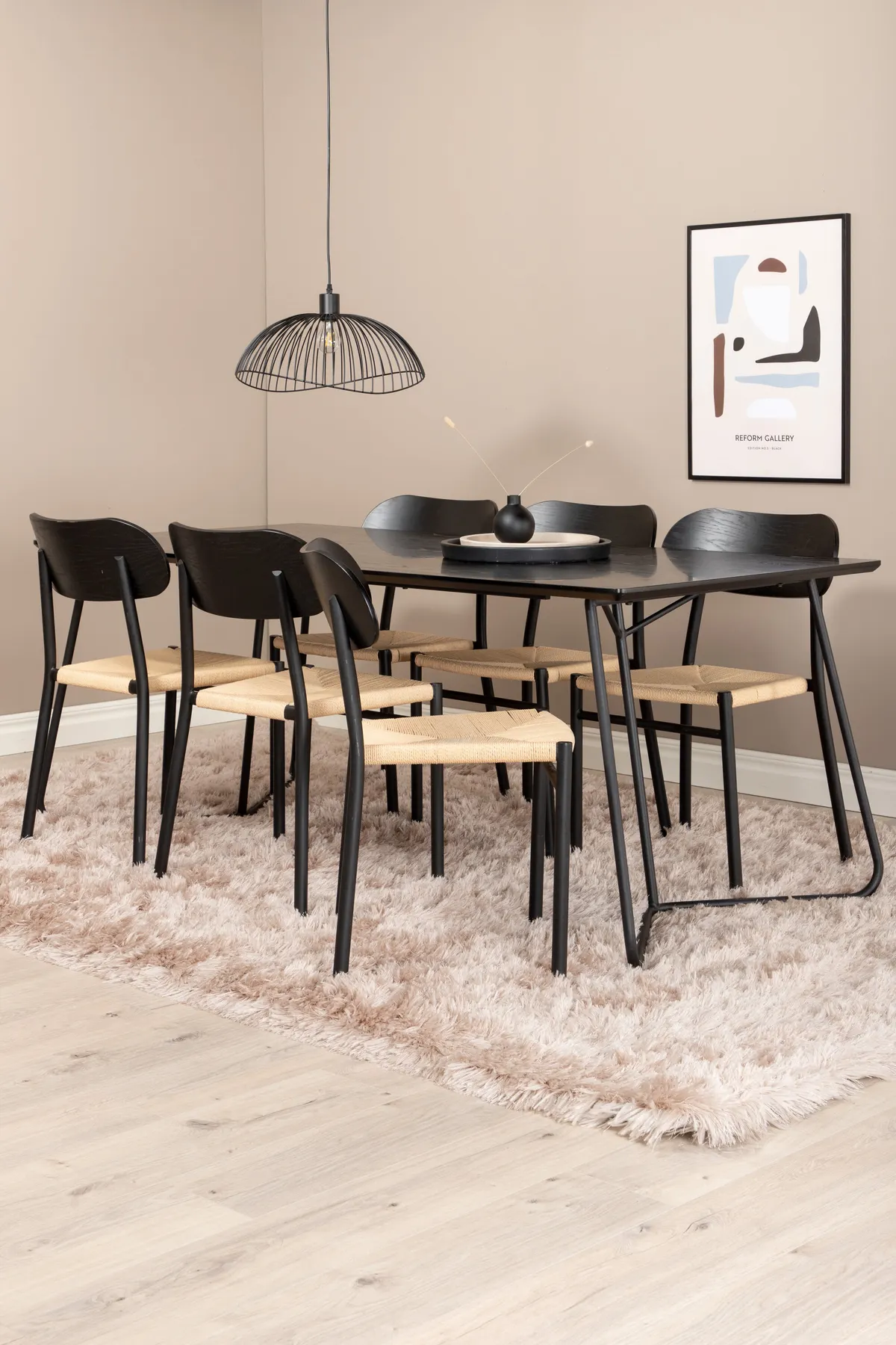 Eine trendige Essgruppe, die sich hervorragend für das Wohnzimmer eignet! Esstisch Petra hat ein gut durchdachtes Design mit skandinavischen Formen, die ein stilvolles Gefühl, schmale, leicht ausgestellte Beine aus Eisen und eine Tischplatte aus schwarzem MDF mit Furnier geben. Maße des Tisches: Länge: 190cm, Breite: 90cm, Höhe: 75cm. Hier in perfekter Kombination mit 6 Esszimmerstühlen aus der Serie Polly. Die Stuhlbeine sind aus schwarzem Metall und die köstlichen naturfarbenen Sitze aus Seilen. Abmessungen der Stühle: Höhe: 88cm, Sitzhöhe: 47cm, Breite: 42cm, Tiefe: 55cm. Lassen Sie diese schön aufeinander abgestimmte Essgruppe mit modernem Feeling zu einem natürlichen Treffpunkt in Ihrem Zuhause werden.