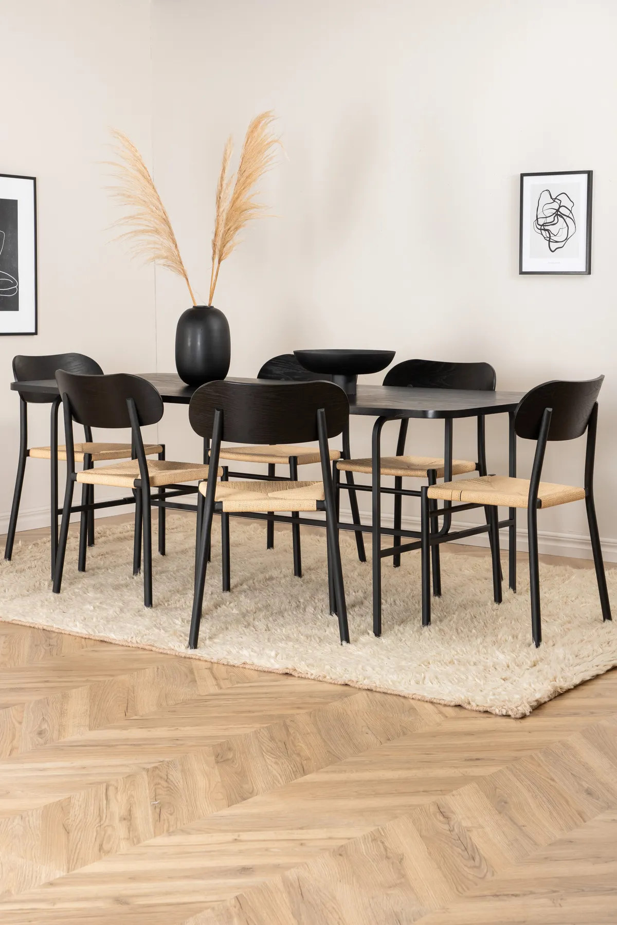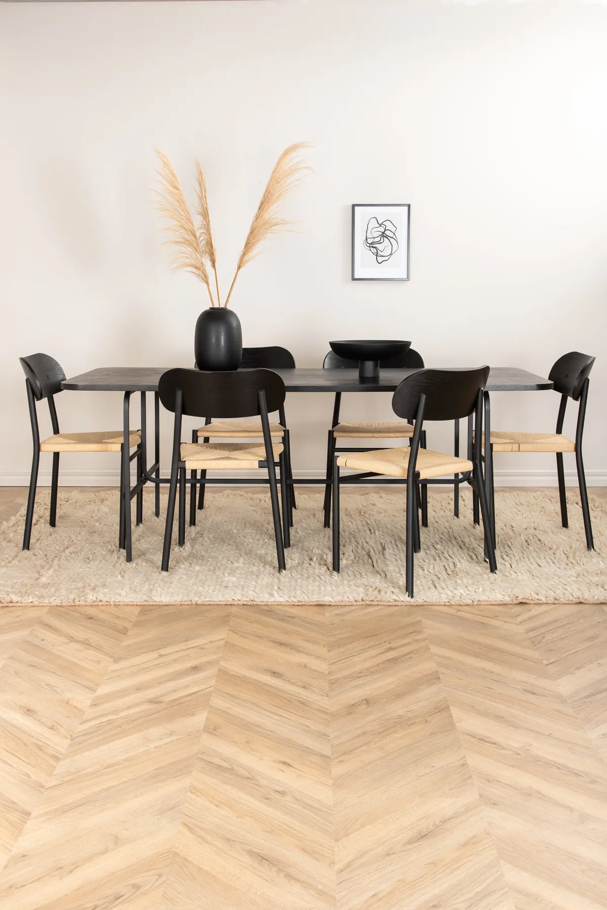 Eine köstlich passende Essgruppe in modernem Design! Hier wird unser beliebter Esstisch mit köstlichen Esszimmerstühlen aus der Serie Polly kombiniert. Der Tisch hat eine Deckplatte aus schwarzem MDF mit Furnier und schwarze Tischbeine aus Metall – ein klassischer rechteckiger Esstisch mit leicht abgerundeten Ecken. Tischabmessungen: Länge: 200cm, Breite: 90cm, Höhe: 74cm. Zusätzlich gibt es 6 Polly Esszimmerstühle mit Stuhlbeinen aus schwarzem Metall und Sitz aus naturfarbenem Seil. Abmessungen der Stühle: Höhe: 88cm, Sitzhöhe: 47cm, Breite: 42cm, Tiefe: 55cm. Lassen Sie das Herz Ihres Zuhauses durch Ihre neue, auffällige Essgruppe geprägt sein.