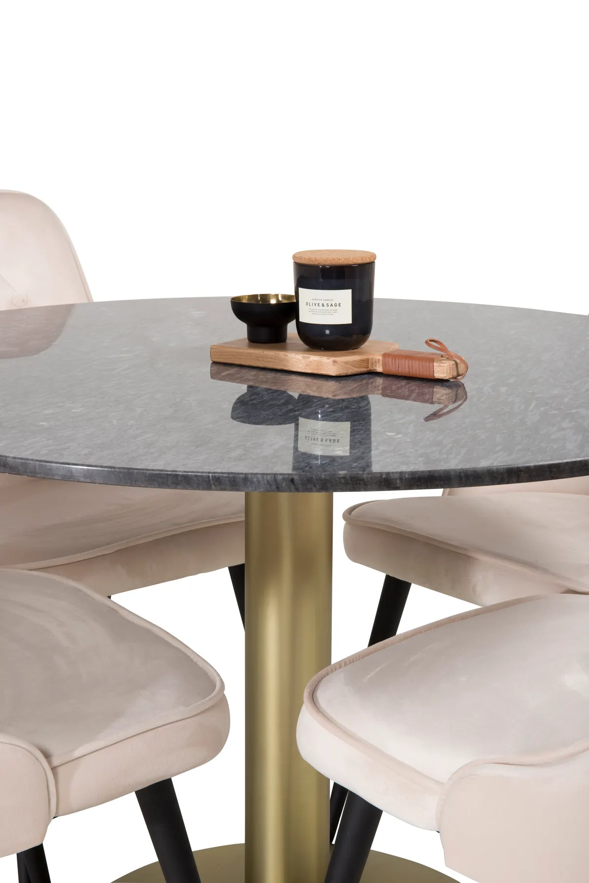 Esstisch Estelle in schlankem Design, dazu beigefarbene Esszimmerstühle Velvet – die perfekte Kombination für alle, die eine trendige Essgruppe wünschen. Der hohe Sitzkomfort der Stühle lädt zu langen und schönen Momenten der Geselligkeit ein!
