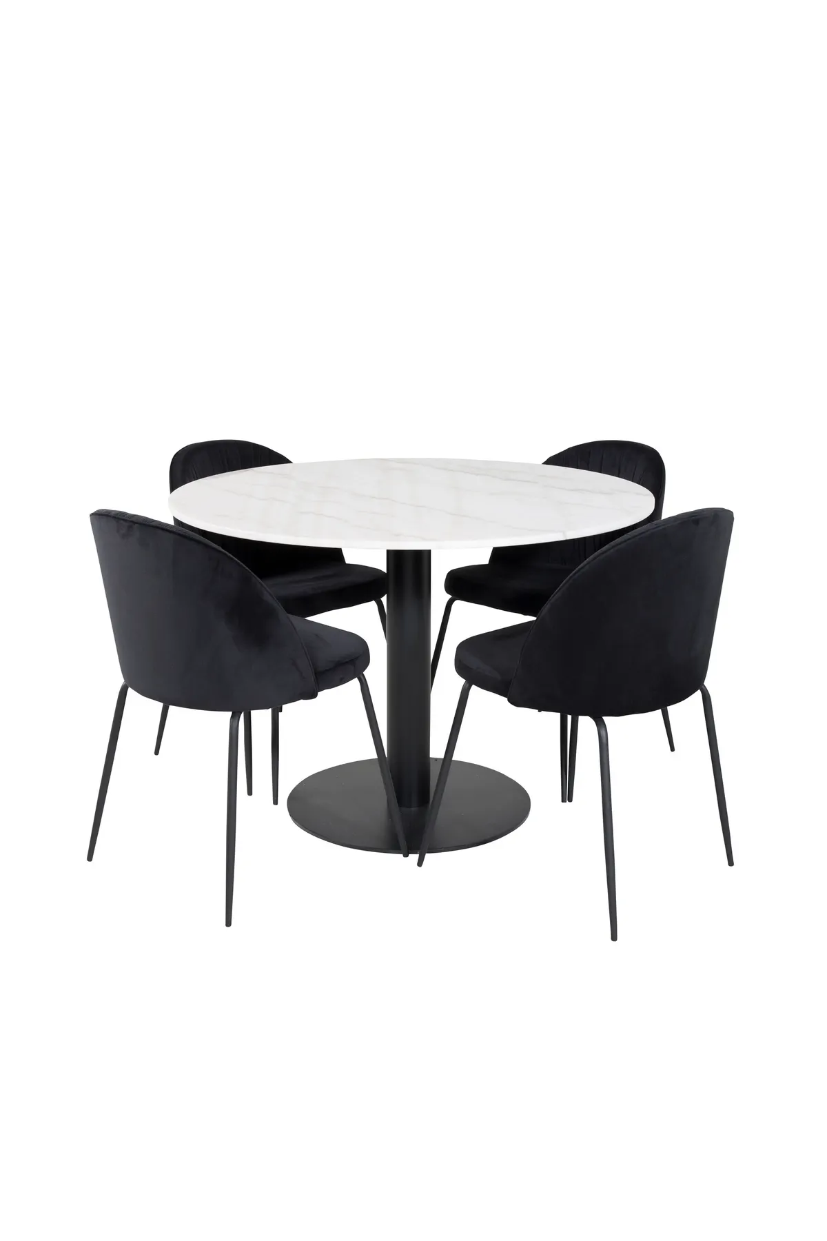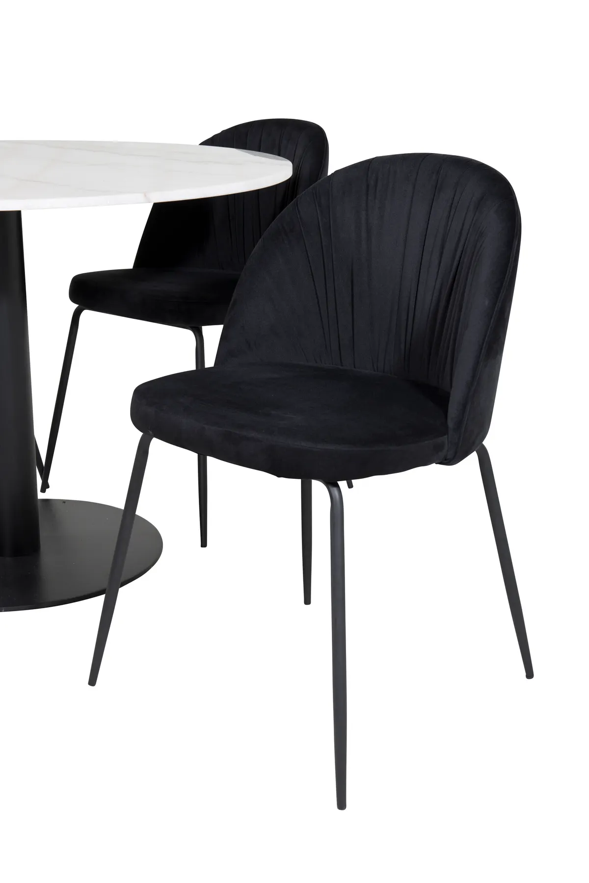 Unser runder Esstisch Estelle in schönem Marmor zusammen mit köstlichen Esszimmerstühlen aus der Serie Wrinkles. Verkleiden Sie Ihre Essgruppe mit anderen Dekorationen rundherum, sowohl für den Alltag als auch für eine Party geeignet!