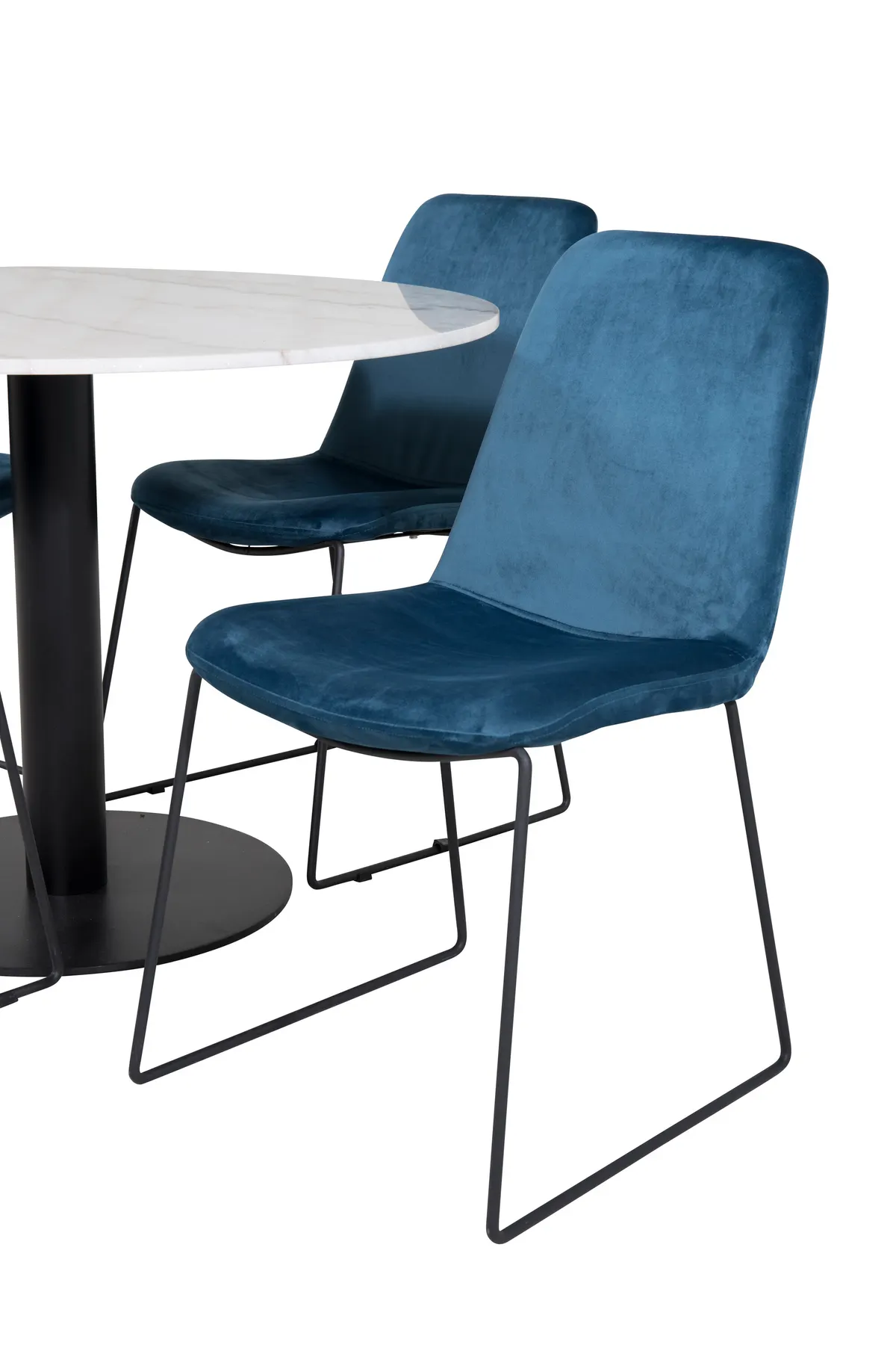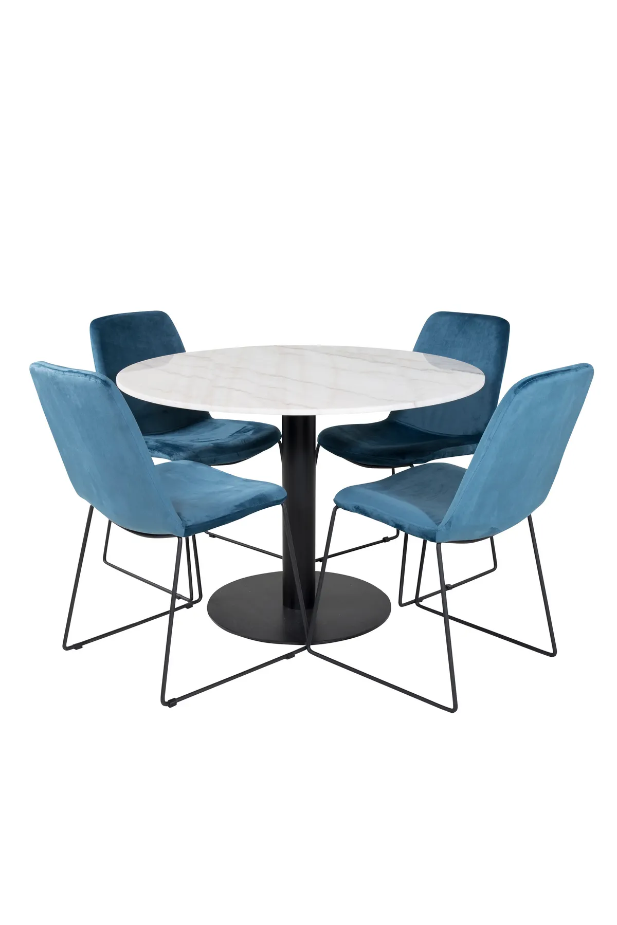 Wow! Unsere trendigen und schönen Esszimmerstühle Muce in blauem Samt werden hier mit unserem runden Esstisch Estelle in schönem Marmor kombiniert. Diese Kombination ist wie geschaffen für alle, die sich nach einer Essgruppe sehnen!
