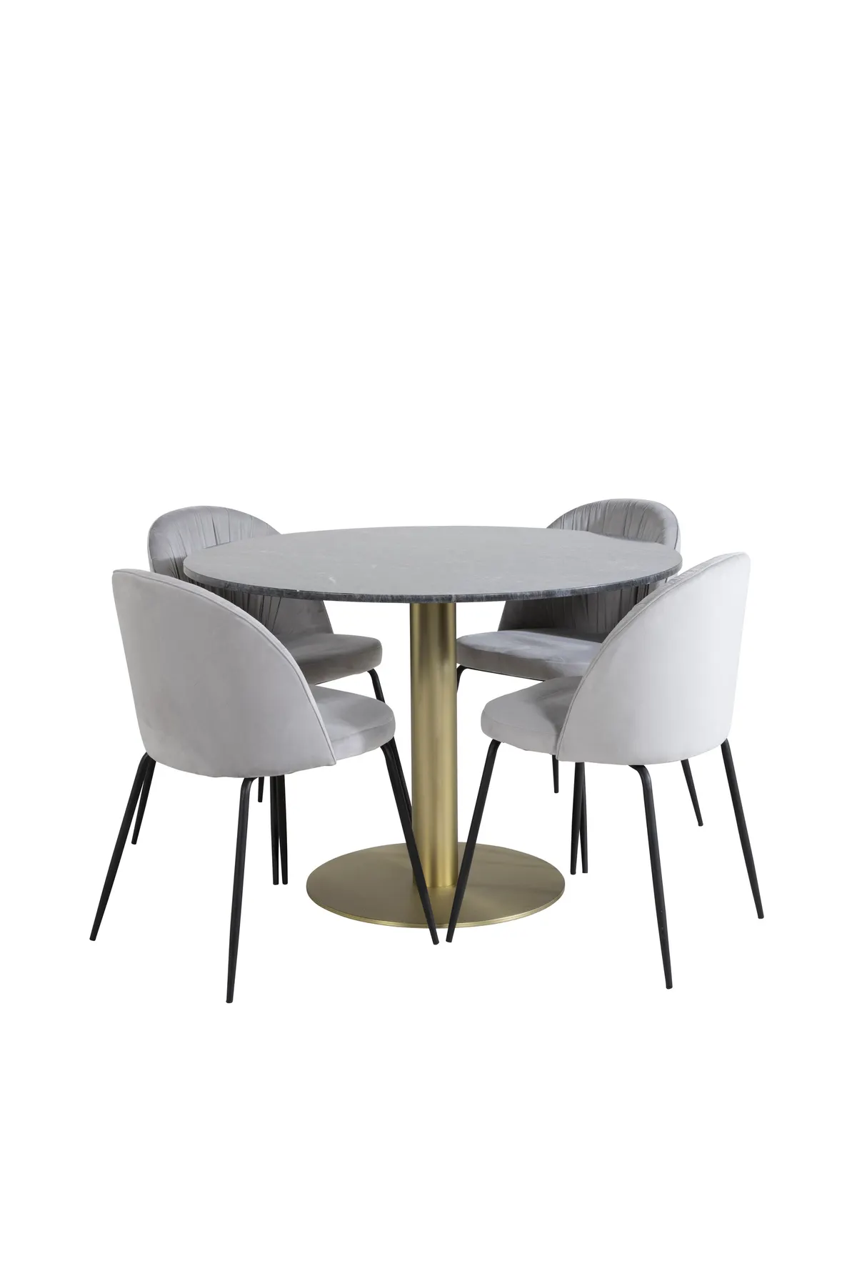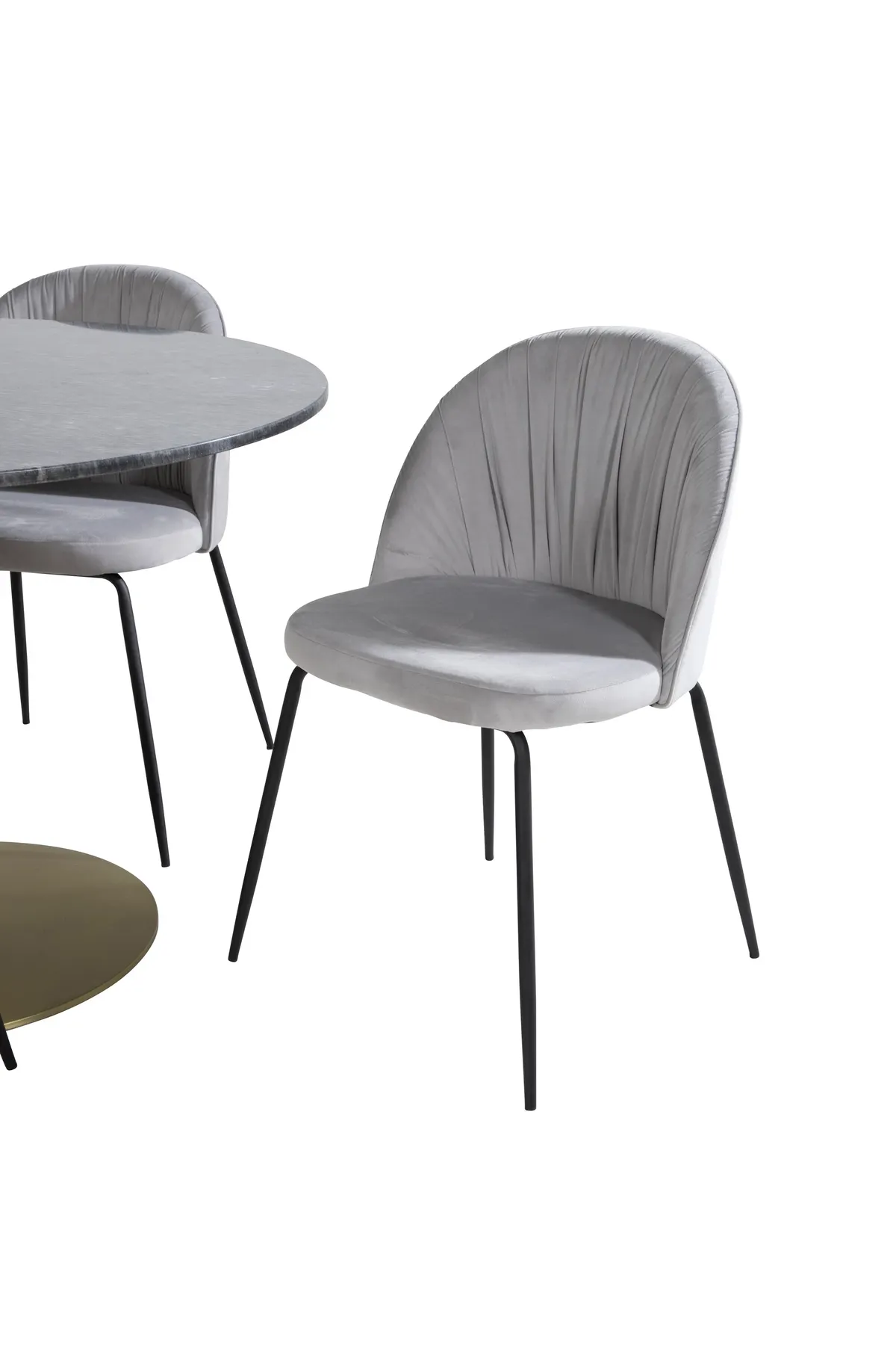 Esstisch Estelle in schlankem Design, zusammen mit stilvollen grauen Esszimmerstühlen Wrinkles – die perfekte Kombination für diejenigen, die eine trendige Lebensmittelgruppe wollen.