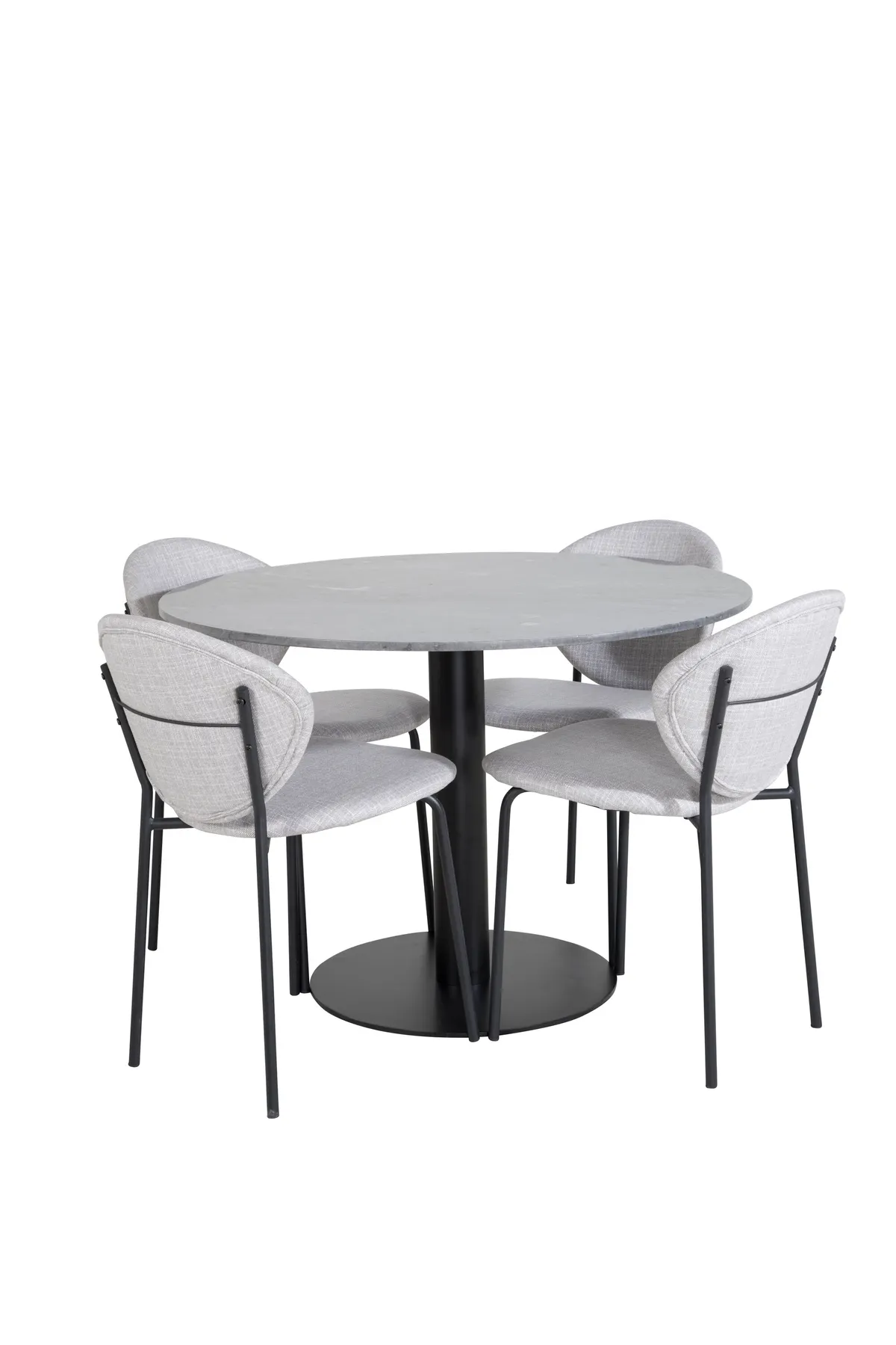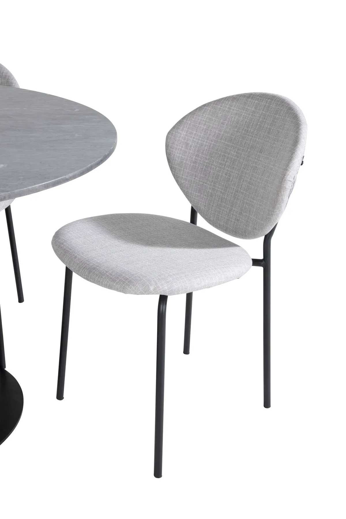 Der elegante Esstisch aus schönem Marmor der Serie Estelle zusammen mit den freundlichen Esszimmerstühlen der Serie Vault – eine Essgruppe, die zu vielen schönen geselligen Momenten einlädt.