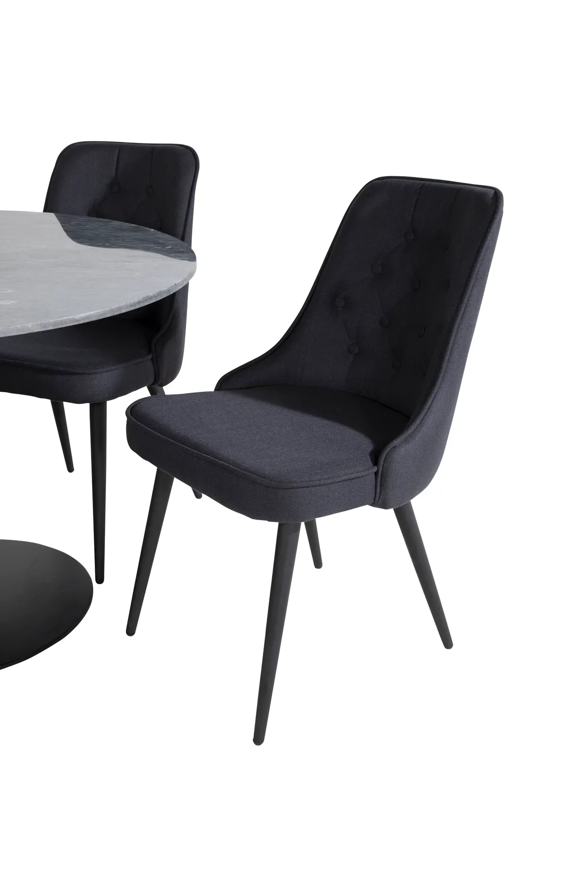 Esstisch Estelle mit einer Tischplatte aus schönem Marmor, zusammen mit den schönen Stühlen aus der Velvet-Serie. Die Stühle sind robust und gut gewachsen – hier sitzt man gerne lange und genießt die Gesellschaft von guten Freunden!