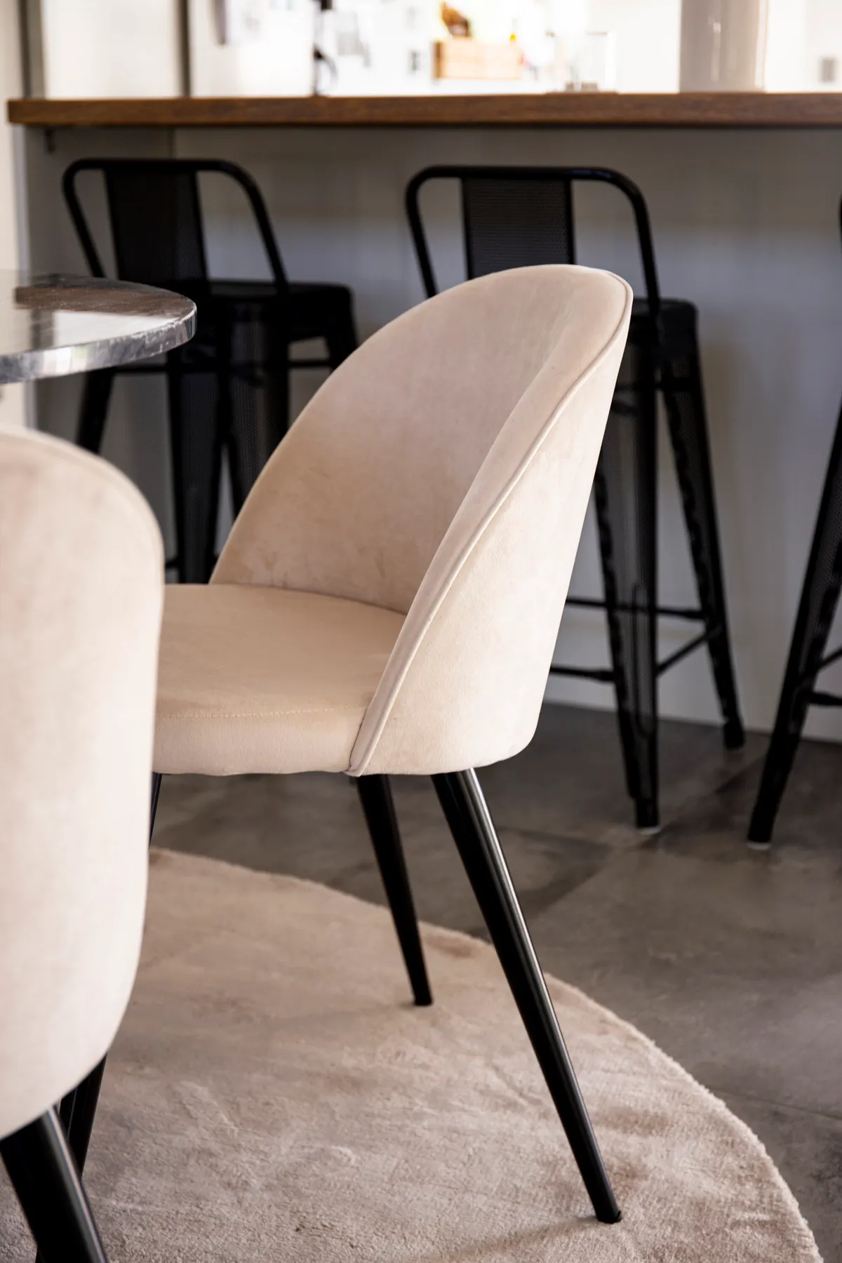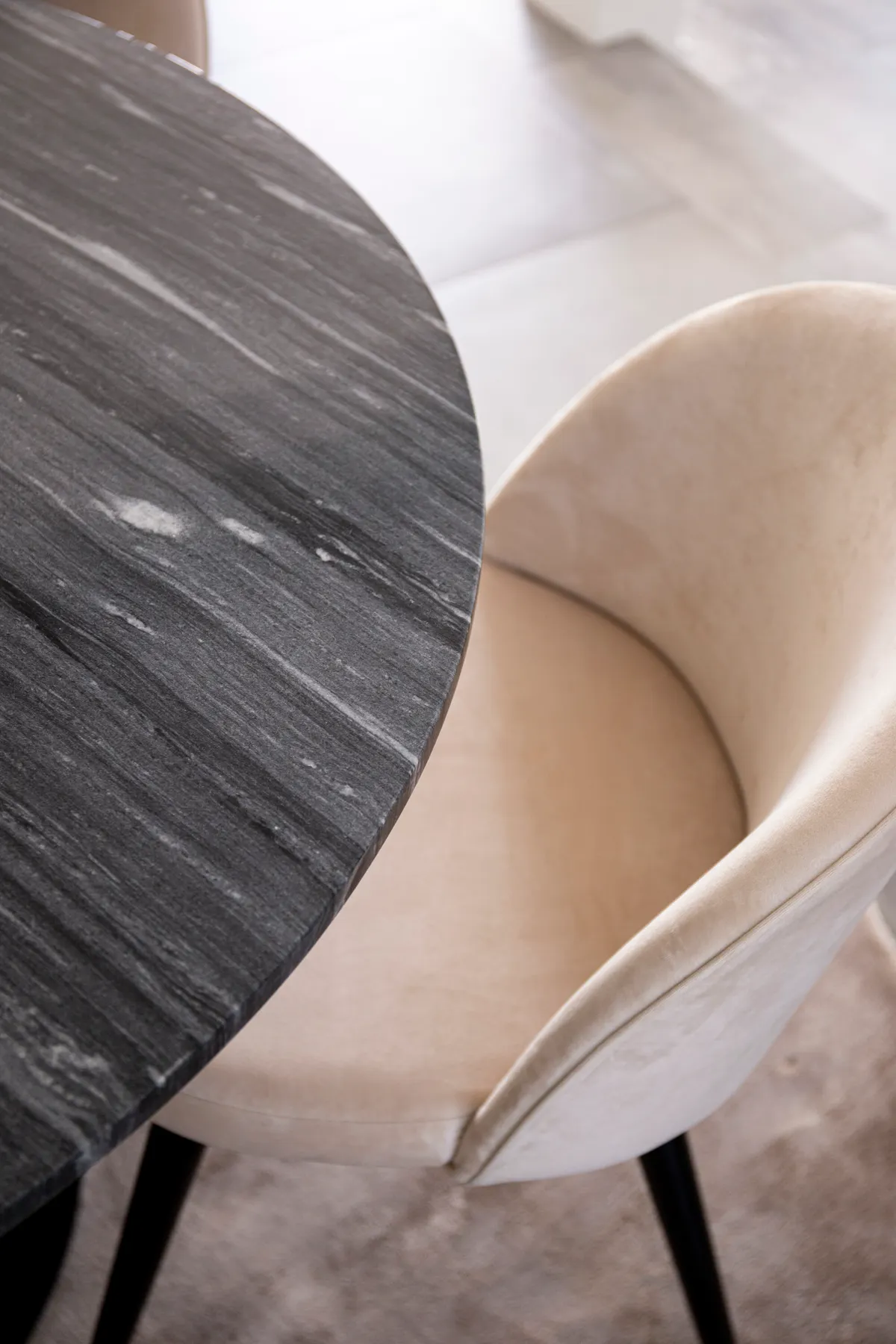 Unser eleganter Esstisch Estelle in schönem Marmor wird hier mit unseren stilvollen beigen Stühlen Velvet kombiniert. Schaffen Sie eine luxuriöse Essgruppe, nach der man sich nach Hause sehnt!
