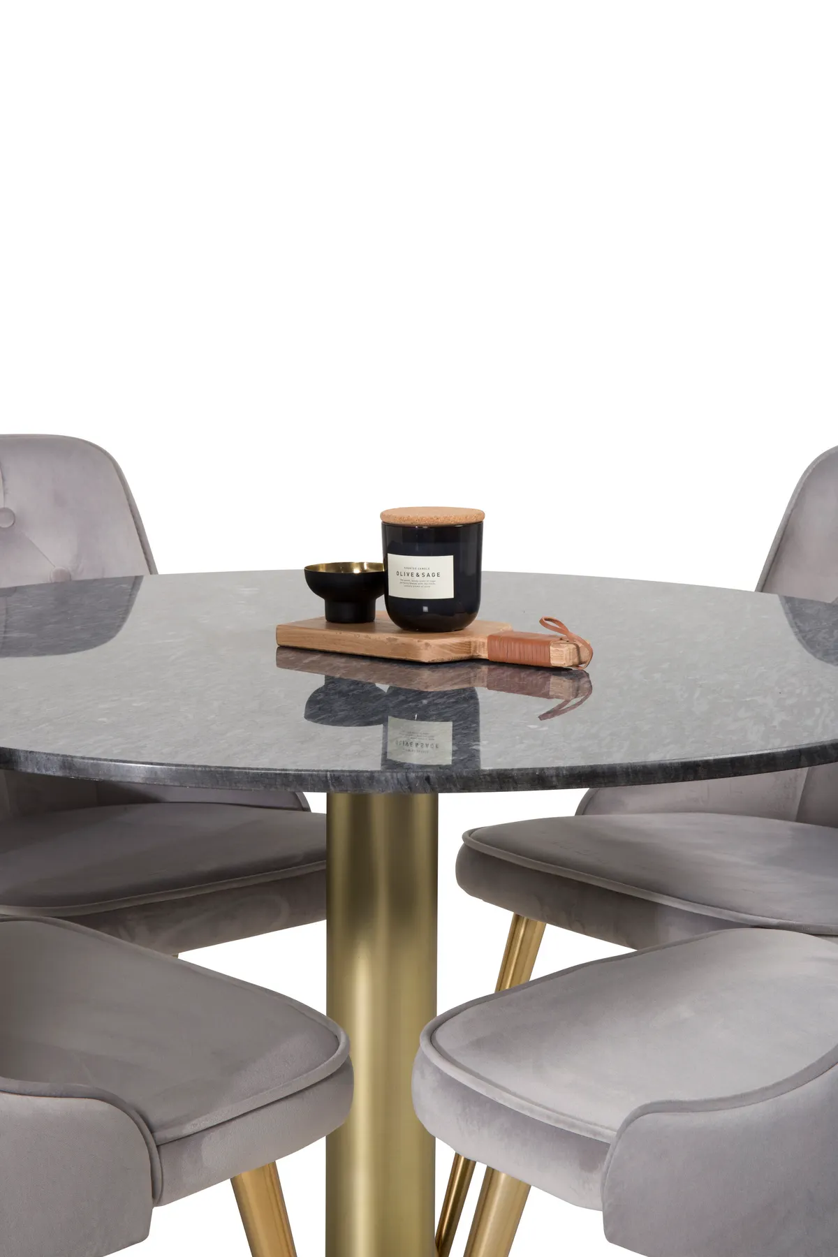 Unser eleganter Marmor-Esstisch zusammen mit bequemen Esszimmerstühlen der Serie Velvet. Hier erhalten Sie eine Essgruppe, die direkt Luxus und Eleganz ausstrahlt. Veredeln Sie Ihre Essgruppe mit anderen Dekorationen rundherum, sowohl für den Alltag als auch für eine Party!