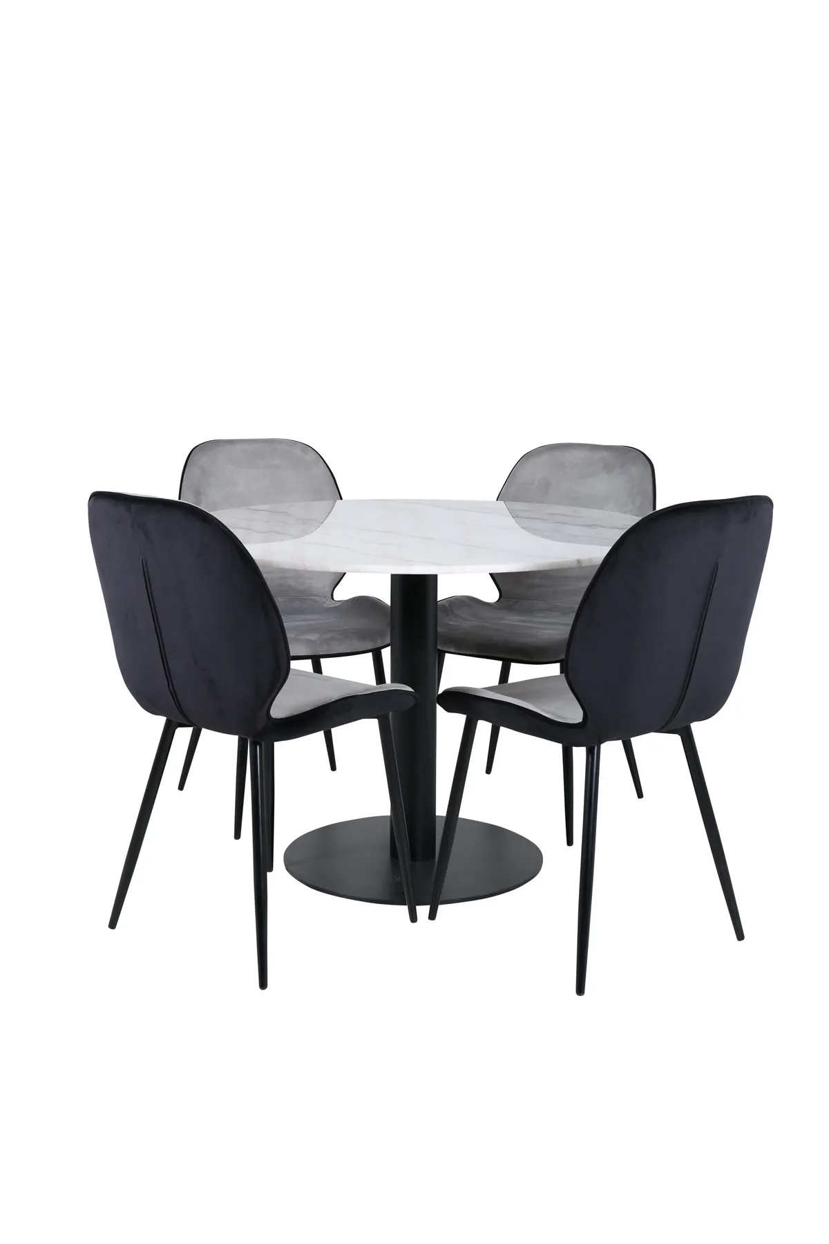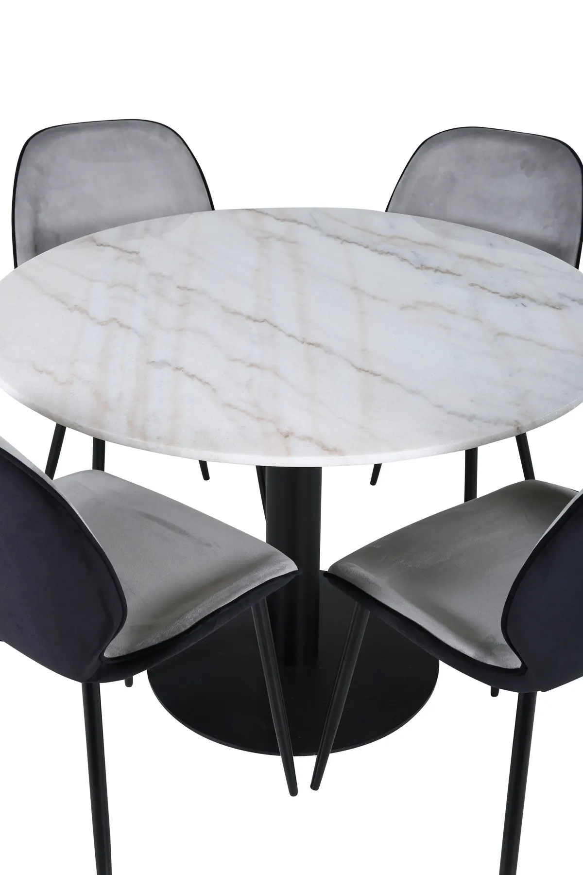 Ein runder Esstisch ist ideal, um eine einladende Atmosphäre zu schaffen – hier landet niemand am Rande! Unser runder Esstisch Estelle ist sowohl elegant als auch praktisch. Der Tisch hat eine glänzende Tischplatte aus weißem, gesprenkeltem Marmor und ein zylindrisches Untergestell aus schwarzem Metall. Hier zusammen mit 4 Esszimmerstühlen aus der Serie Emma. Die Stühle haben ein figürliches und stilvolles Design mit einem Sitz aus hellgrauem Samt und einer Rückenlehne aus schwarzem Samt sowie Stuhlbeinen aus Eisen. Einladend und stilvoll dekoriert!