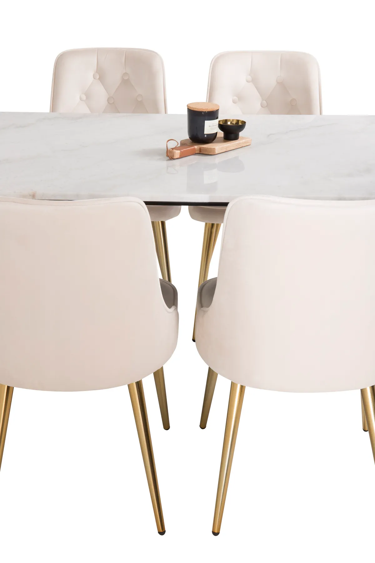 Unser schöner Marmor-Esstisch zusammen mit bequemen Esszimmerstühlen der Serie Velvet. Hier bekommen Sie eine Essgruppe, die direkt Luxus und Eleganz ausstrahlt. Verkleiden Sie Ihre Essgruppe mit anderen Dekorationen rundherum, sowohl für den Alltag als auch für eine Party!
