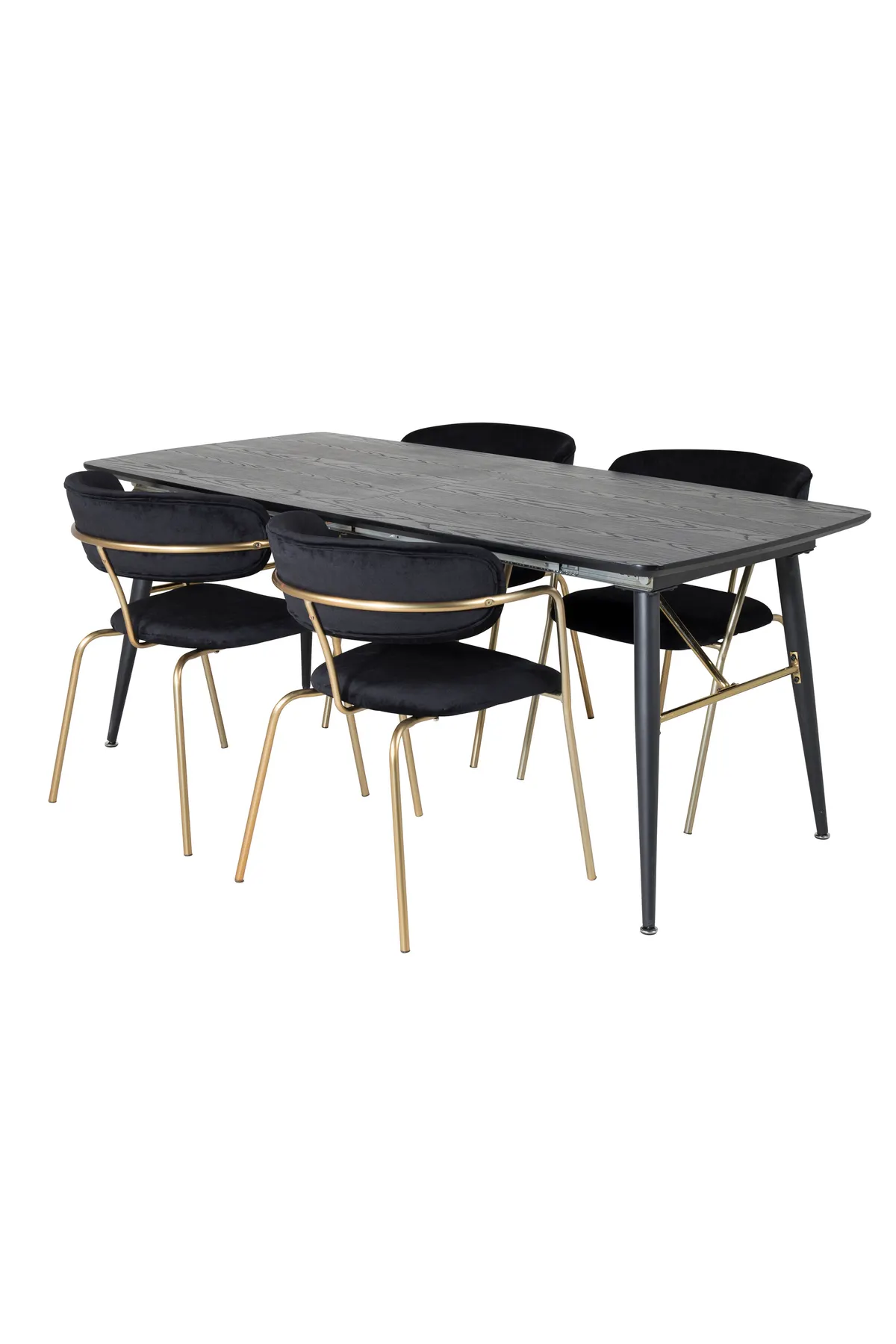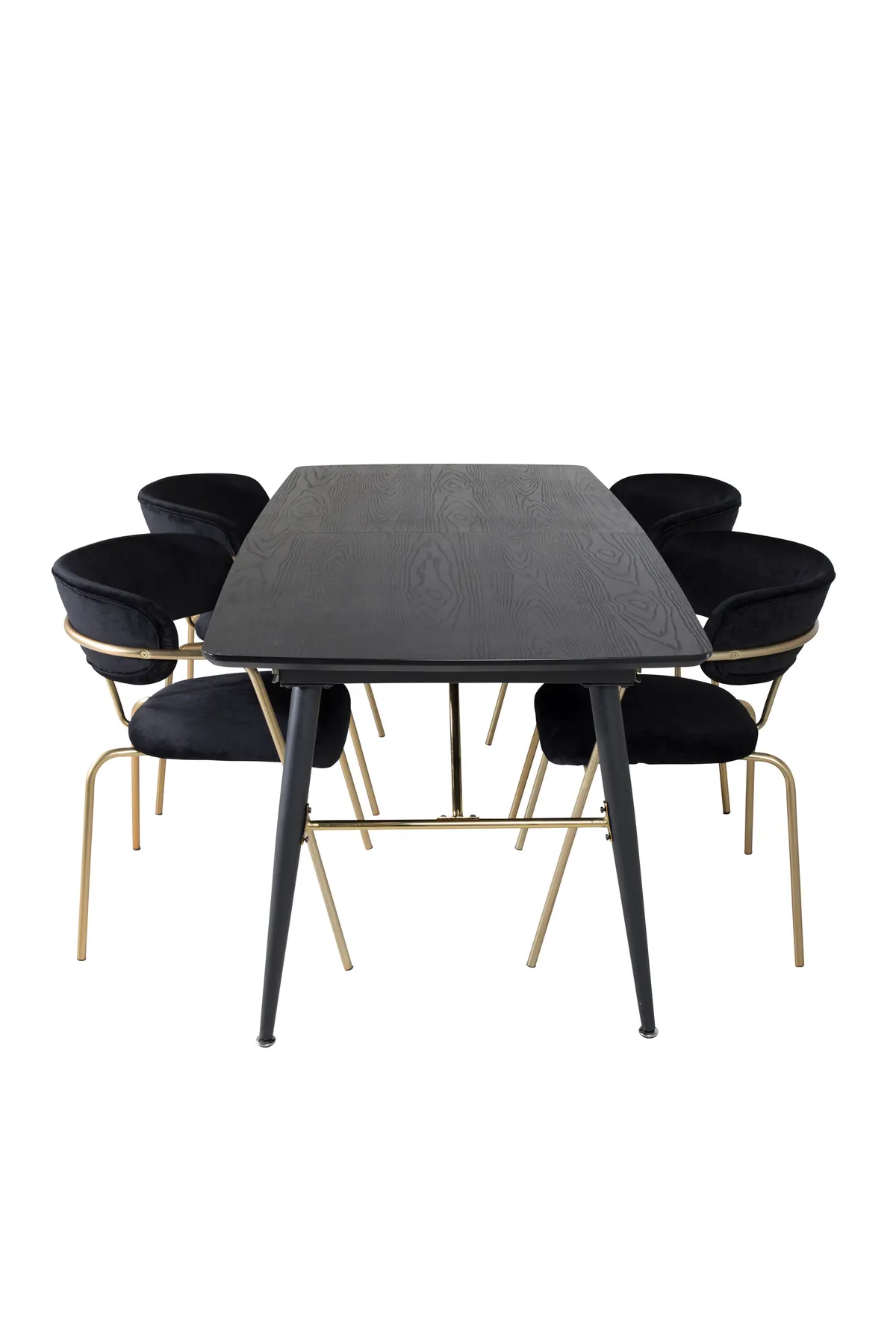 Der ausziehbare Esstisch Gold und die Esszimmerstühle Arrow werden hier auf köstliche Weise mit den luxuriösen Details aus Messing kombiniert. Lassen Sie Ihr Zuhause von Ihrer neuen auffälligen Essgruppe prägen!