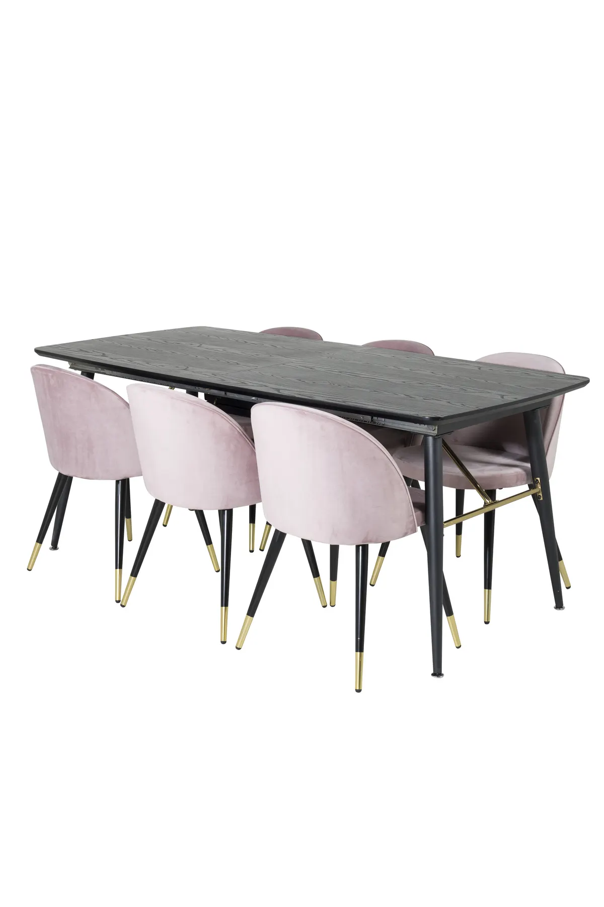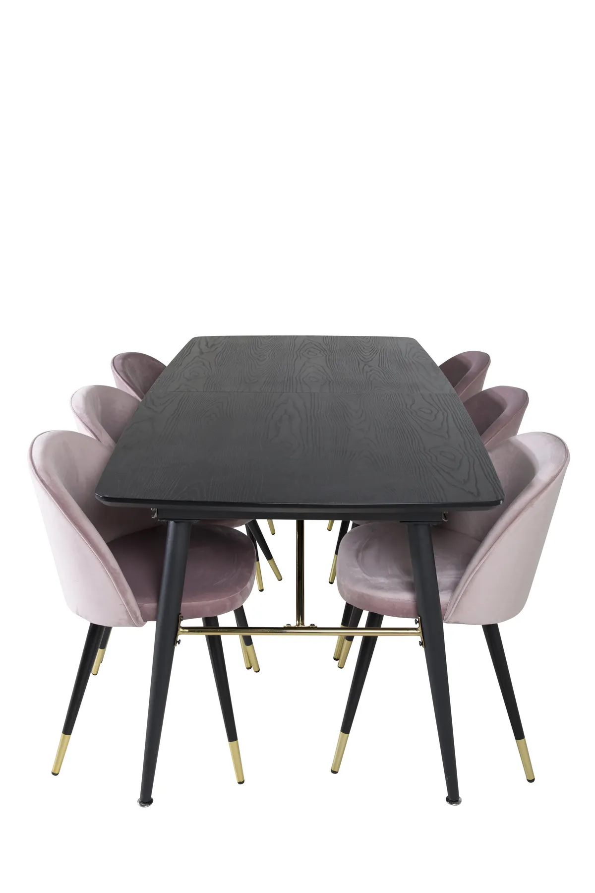 Modern und luxuriös. Die Kombination aus unserem ausziehbaren Esstisch der Serie Gold und unseren bequemen rosafarbenen Esszimmerstühlen Velvet schafft eine Essgruppe, die Lust auf Zuhause macht.