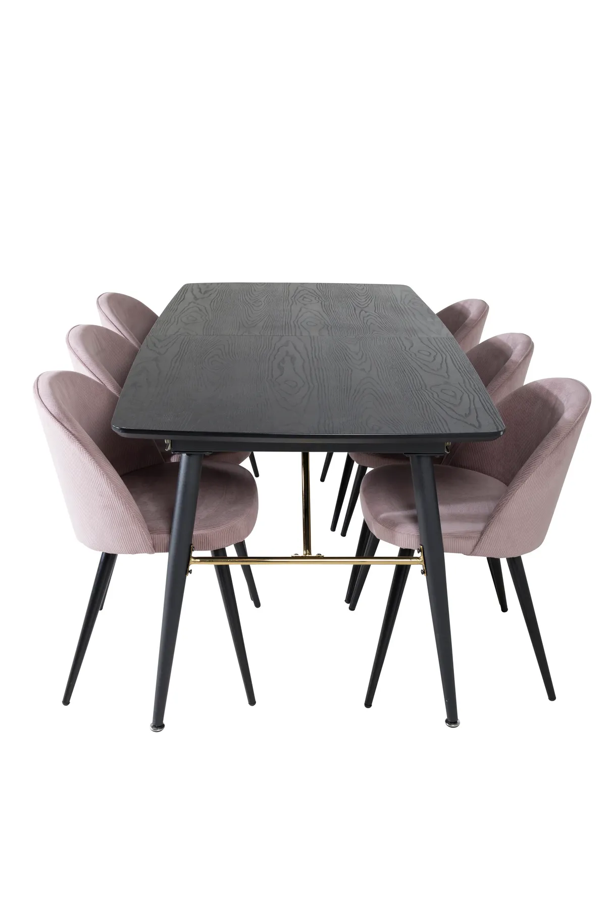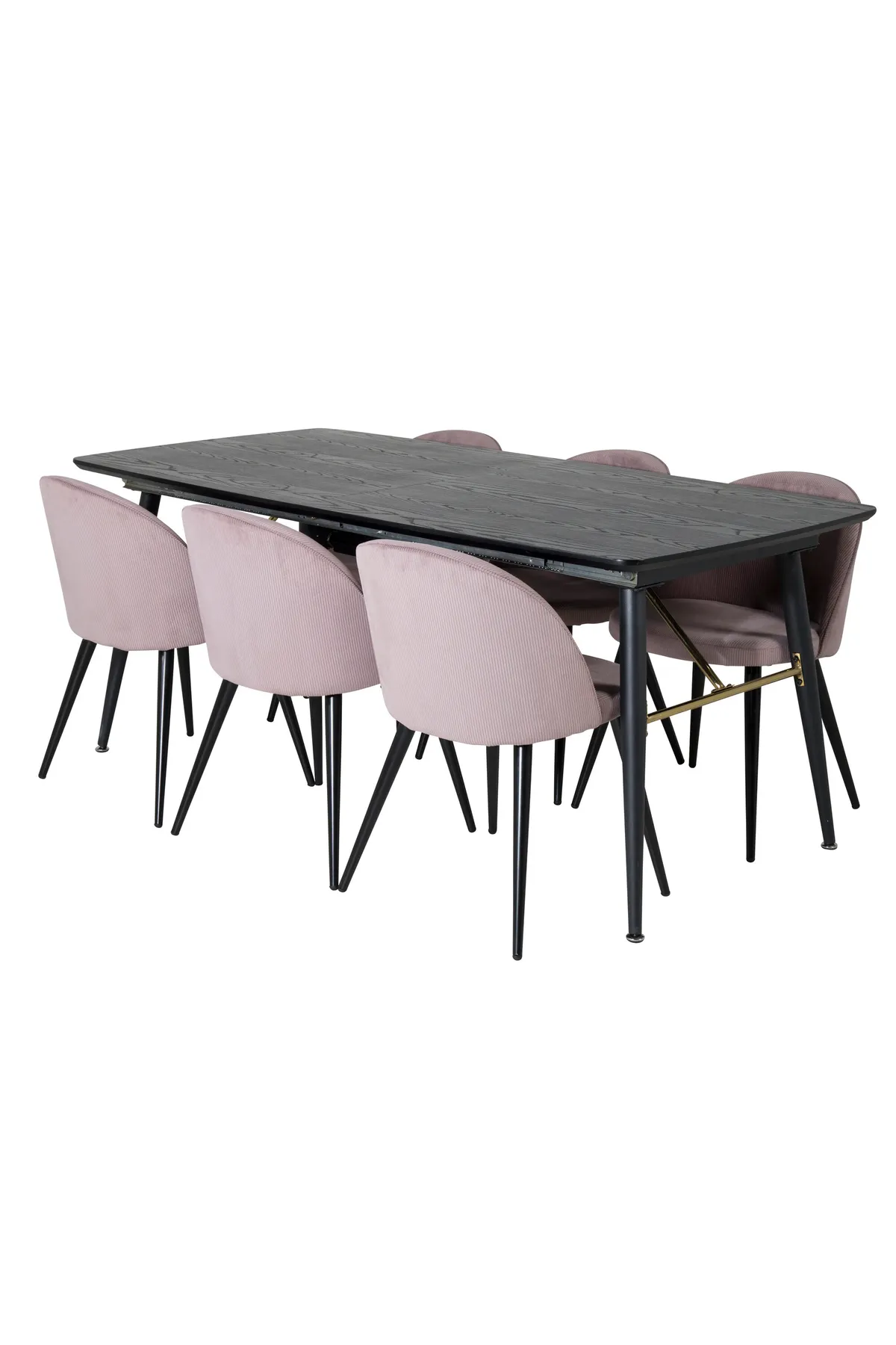 Modern und elegant. Die Kombination aus unserem ausziehbaren Esstisch der Serie Gold und unseren weichen grauen Esszimmerstühlen Velvet schafft eine Essgruppe, die Lust auf Zuhause macht.