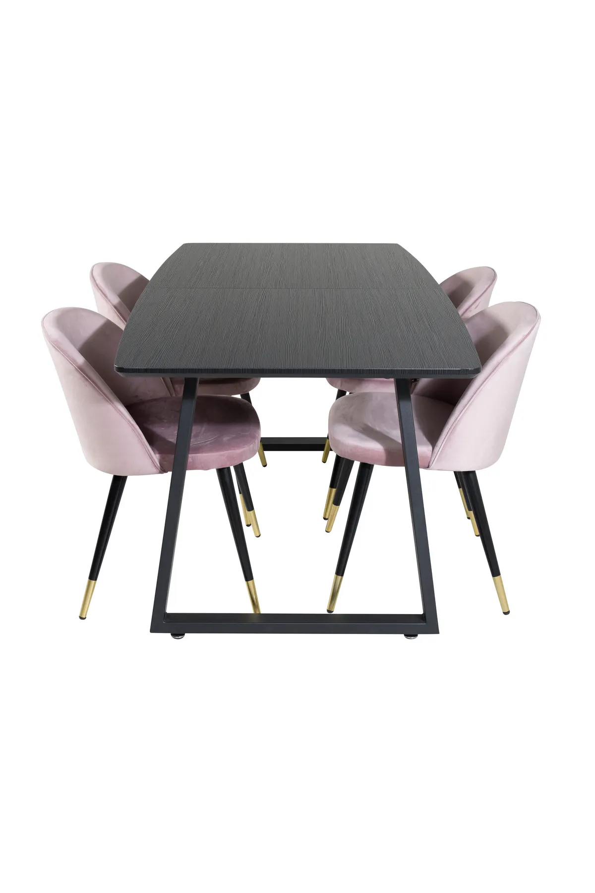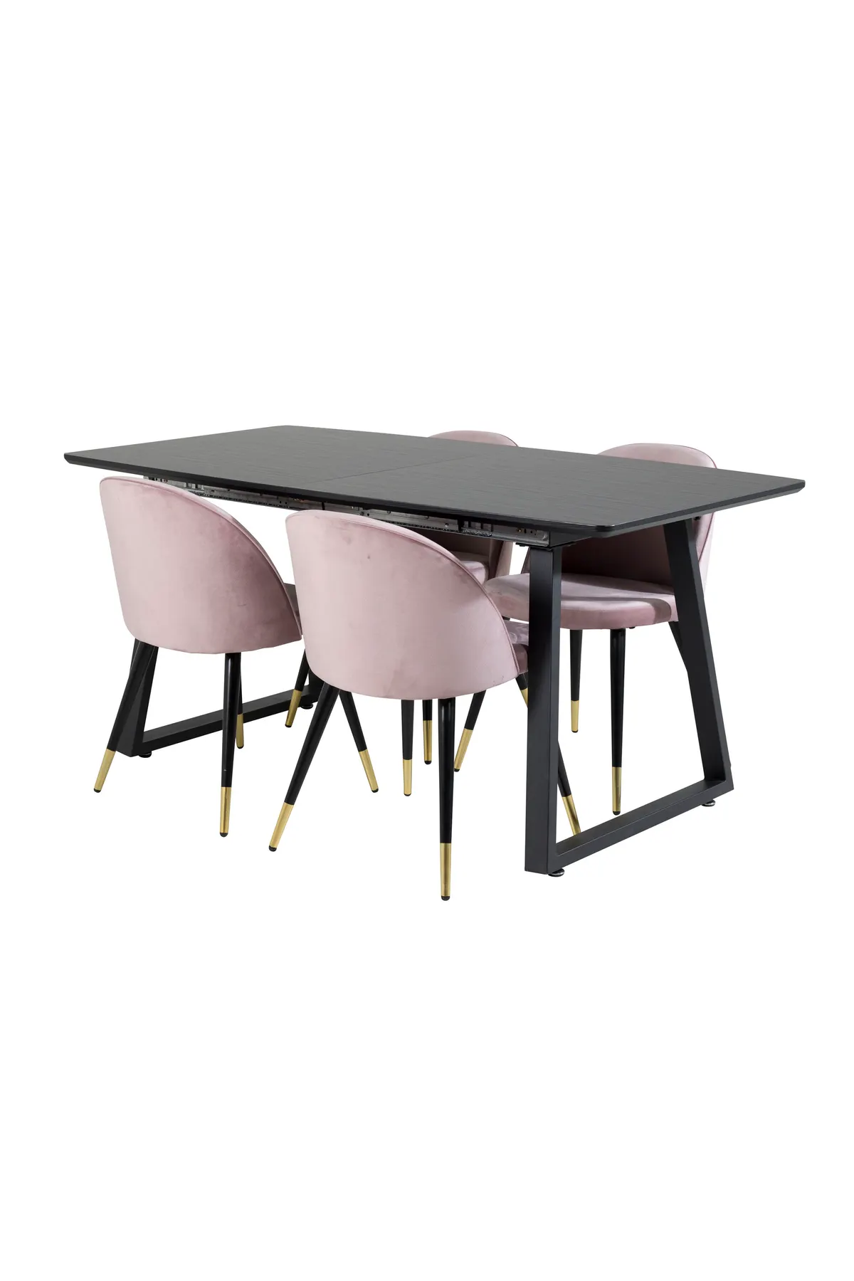Esstisch Inca zusammen mit Esszimmerstühlen der Serie Velvet – bequem, gemütlich und einladend! Schöne Farben, die Platz im Raum schaffen und zu vielen schönen geselligen Momenten einladen.
