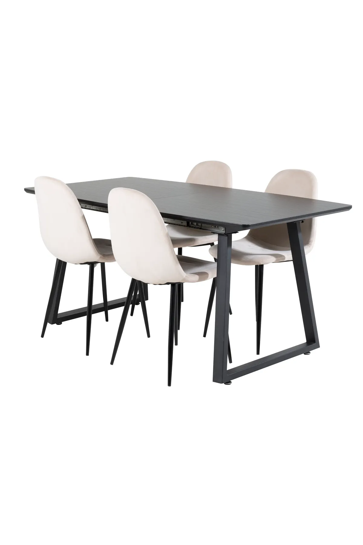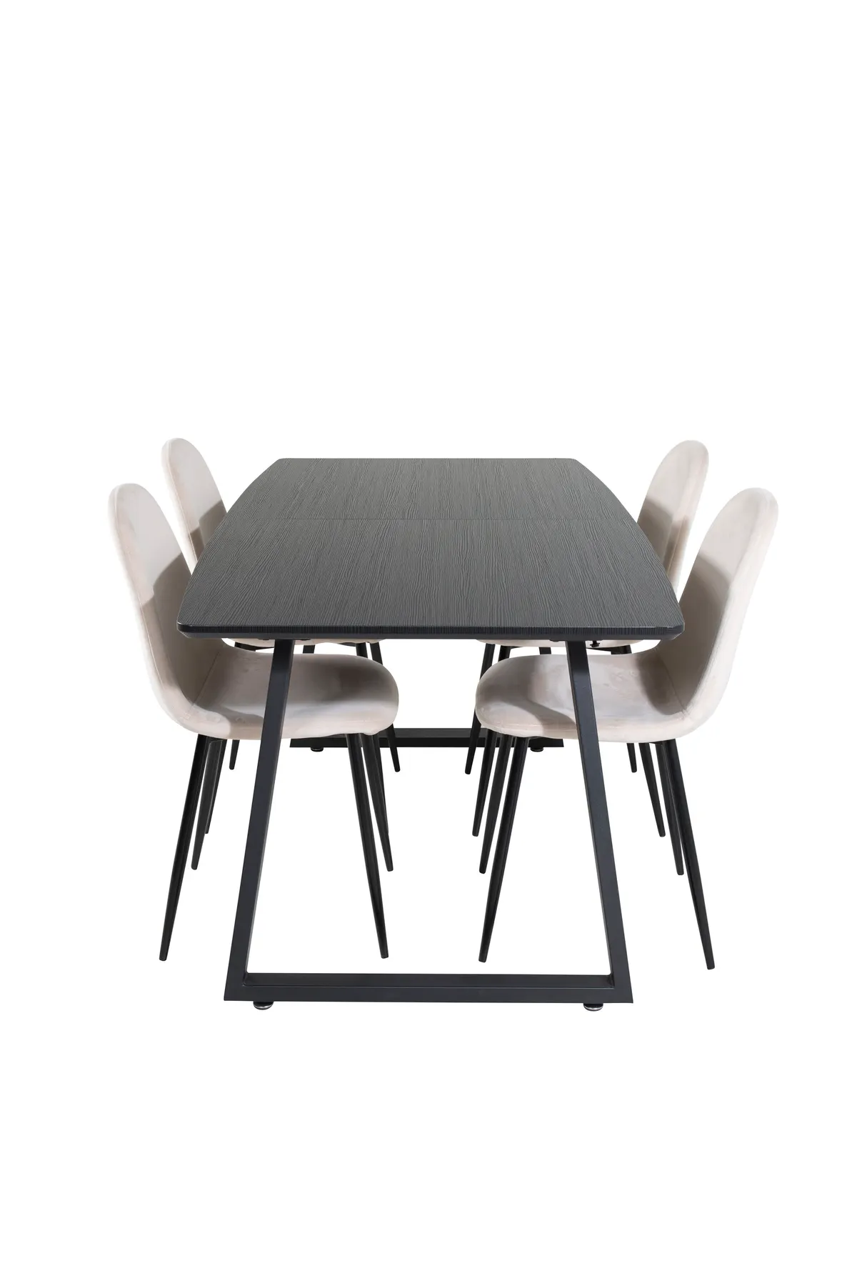 Unser beliebter Esstisch Inca in eleganter schwarzer Tischplatte wird perfekt mit den bequemen Samtstühlen der Serie Polar kombiniert. Eine stilvolle Essgruppe in zeitloser Farbskala und mit modernem Feeling – ist für einen gemütlichen Alltag ebenso gut geeignet wie für ein schönes Festmahl.