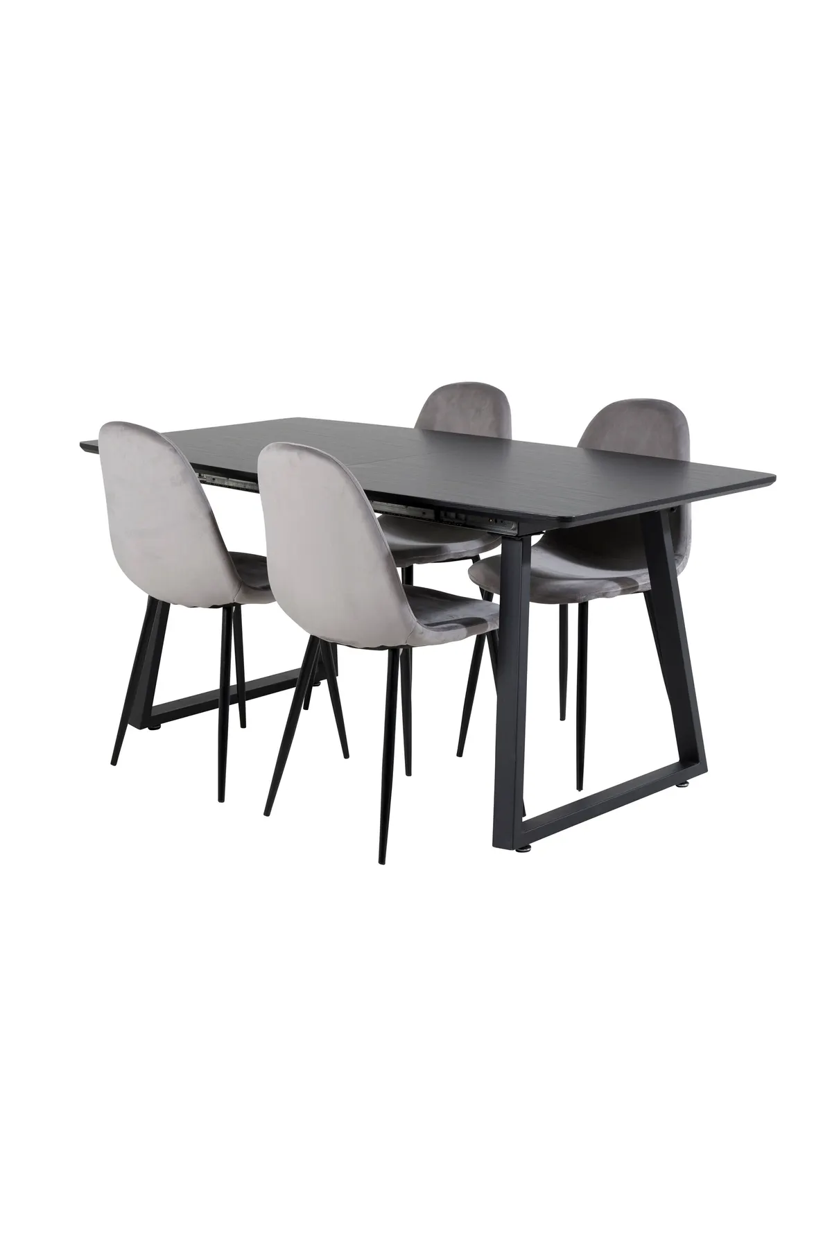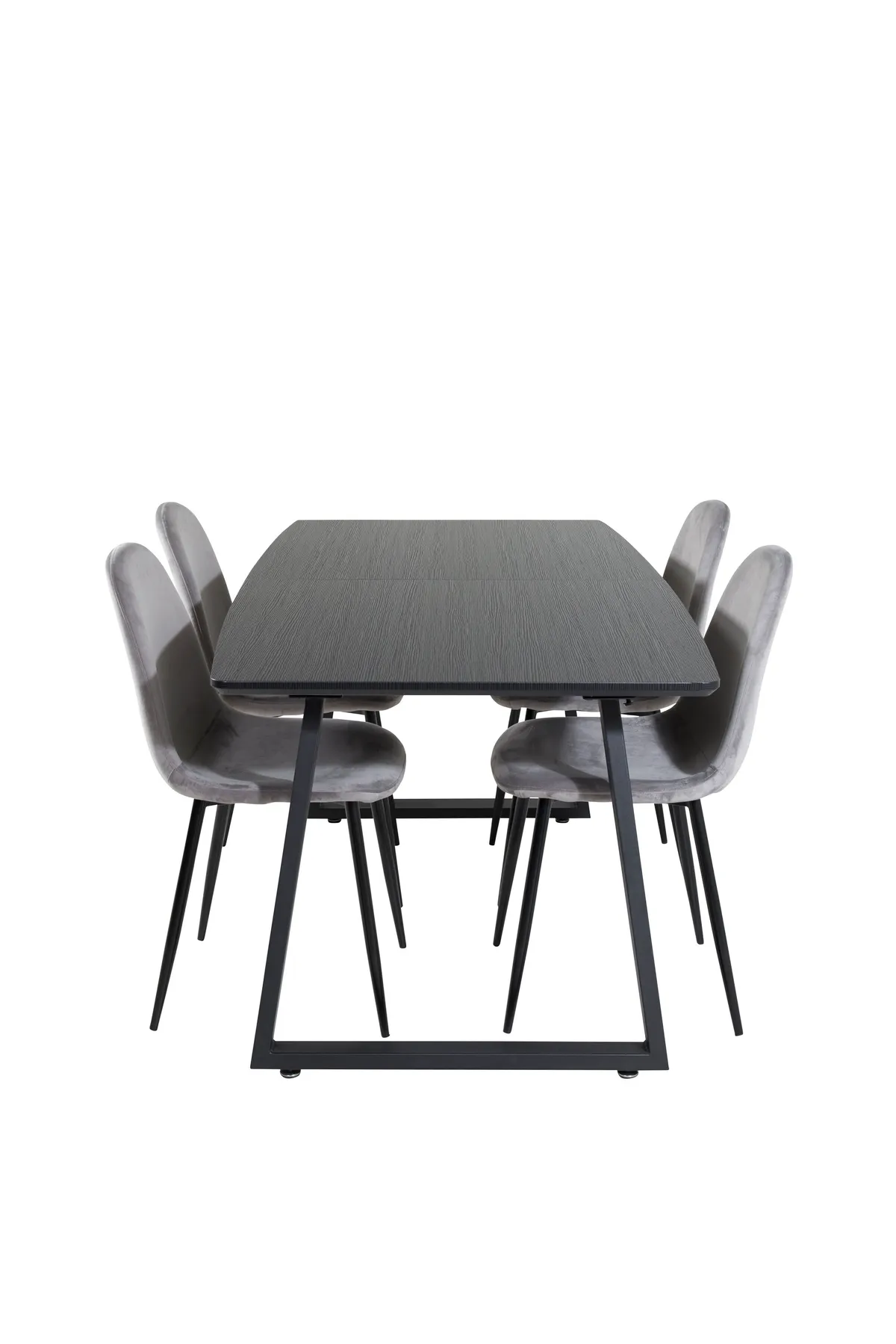 Elegant, stilvoll und modern – was kann man sich mehr wünschen? Inca, unser trendiger Esstisch aus schwarzem Holz Lokomotive wird mit grauen Samtstühlen der Serie Polar kombiniert. Der hohe Sitzkomfort der Stühle lädt zu langen und schönen Momenten der Geselligkeit ein!