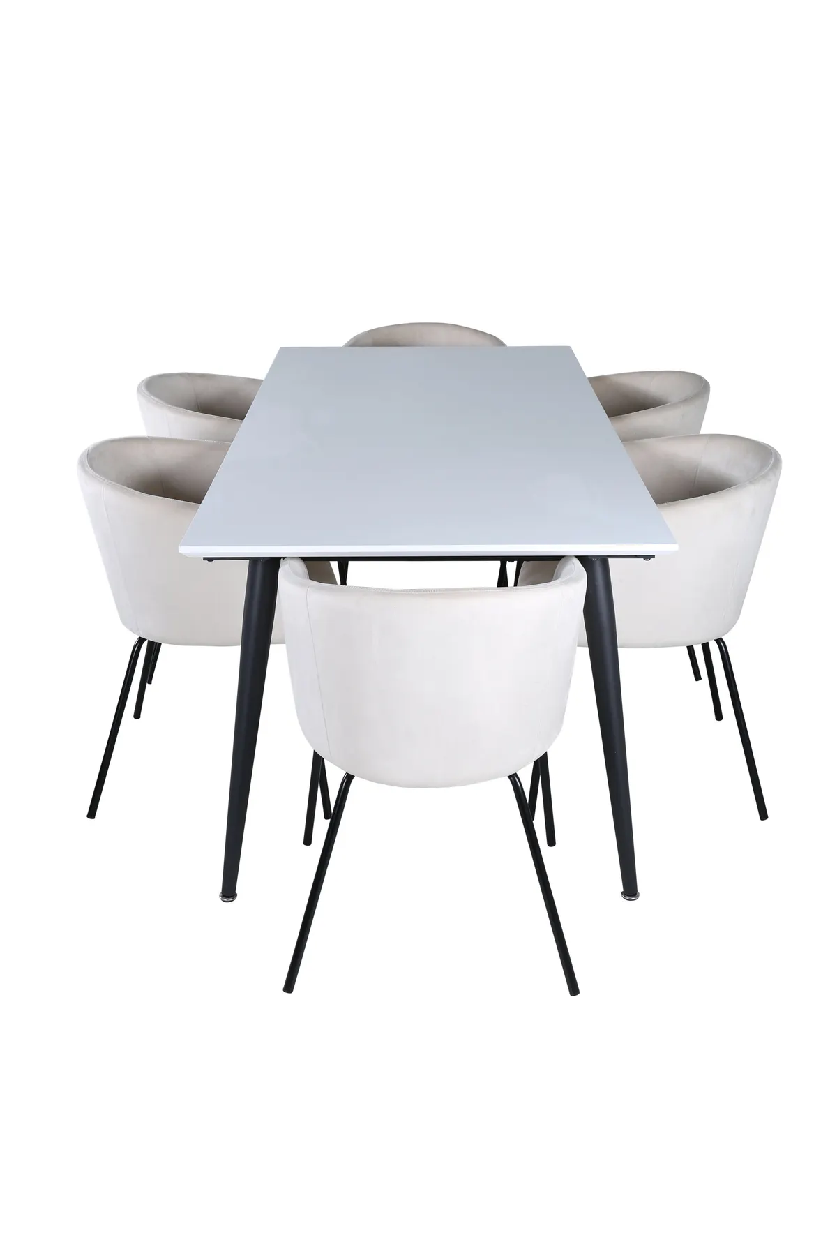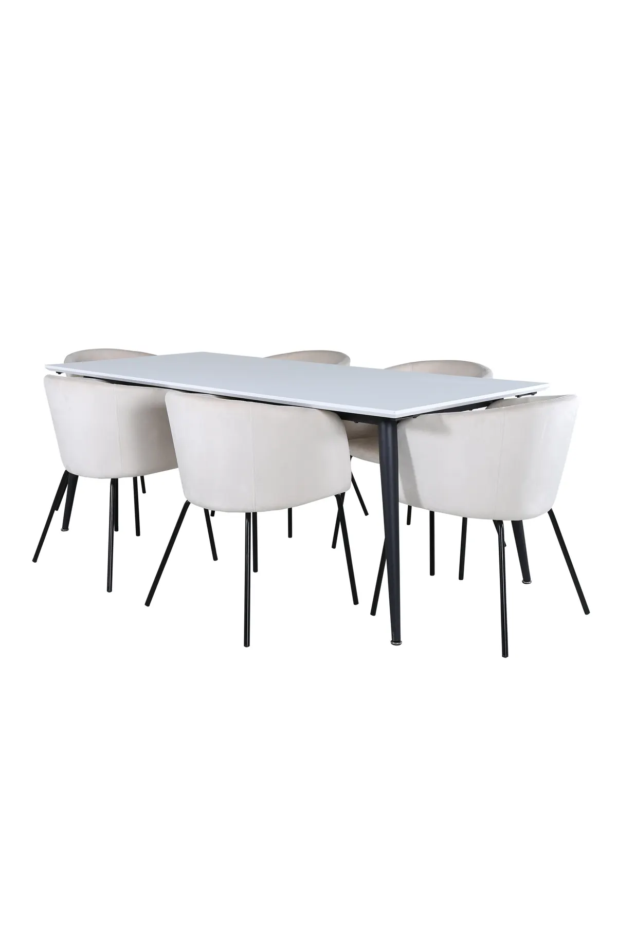 Unsere beliebten Esszimmerstühle Berit in luxuriösem Design verlängern die angenehmen Dinner-Momente! Der Stuhl hat eine großzügige Sitztiefe mit einer Sitzfläche aus beigem Samt und stilvolle schmale Stuhlbeine aus schwarzem Eisen. Stuhl Abmessungen: Höhe: 78cm, Sitzhöhe: 49cm, Breite: 55cm, Tiefe: 55cm. Hier werden 6 Esszimmerstühle mit dem klassischen Esstisch Jimmy kombiniert – eine sichere Karte für alle Gelegenheiten! Mit einer ausziehbaren Platte aus weißem HPL und MDF-Furnier und leicht ausgestellten Beinen aus schwarzem Metall passt dieser Tisch perfekt zu allen Einrichtungsstilen und Wohnungen. Abmessungen des Tisches: Länge ausziehbar zwischen: 195cm und 285cm, Breite: 90cm, Höhe: 76cm.