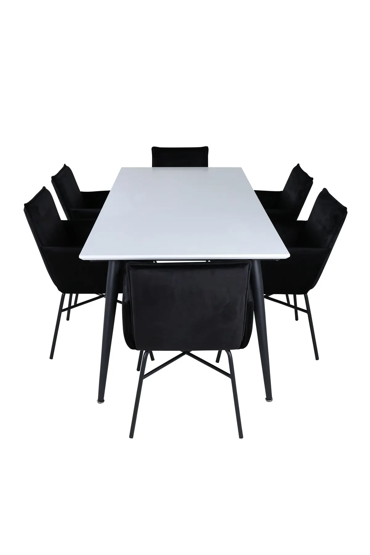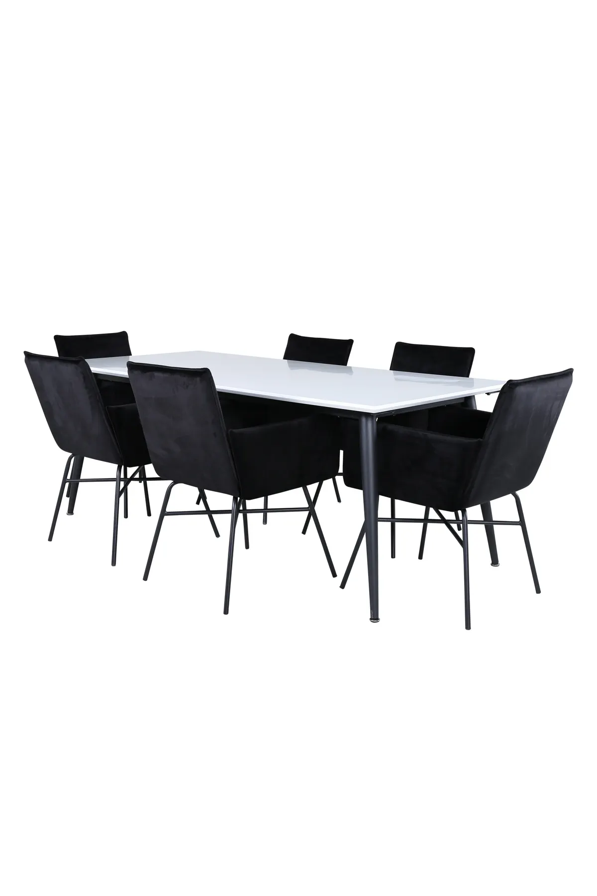 Klassisch, stilvoll und praktisch – Jimmy Esstisch ist eine sichere Karte für alle Gelegenheiten! Mit einer ausziehbaren Platte aus weißem HPL und MDF-Furnier und leicht ausgestellten Beinen aus schwarzem Metall passt dieser Tisch perfekt zu allen Einrichtungsstilen und Wohnungen. Abmessungen des Tisches: Länge ausziehbar zwischen: 195cm und 285cm, Breite: 90cm, Höhe: 76cm. Passend dazu gibt es 6 Petra-Esszimmerstühle in luxuriösem Design. Der einladende Sitz ist aus schwarzem Samtstoff und die Stuhlbeine aus schwarzem Eisen. Maße der Stühle: Höhe: 87cm, Sitzhöhe: 48cm, Breite: 57cm, Tiefe: 60cm. Hier sitzen Sie und Ihre Gäste bequem für Stunden!