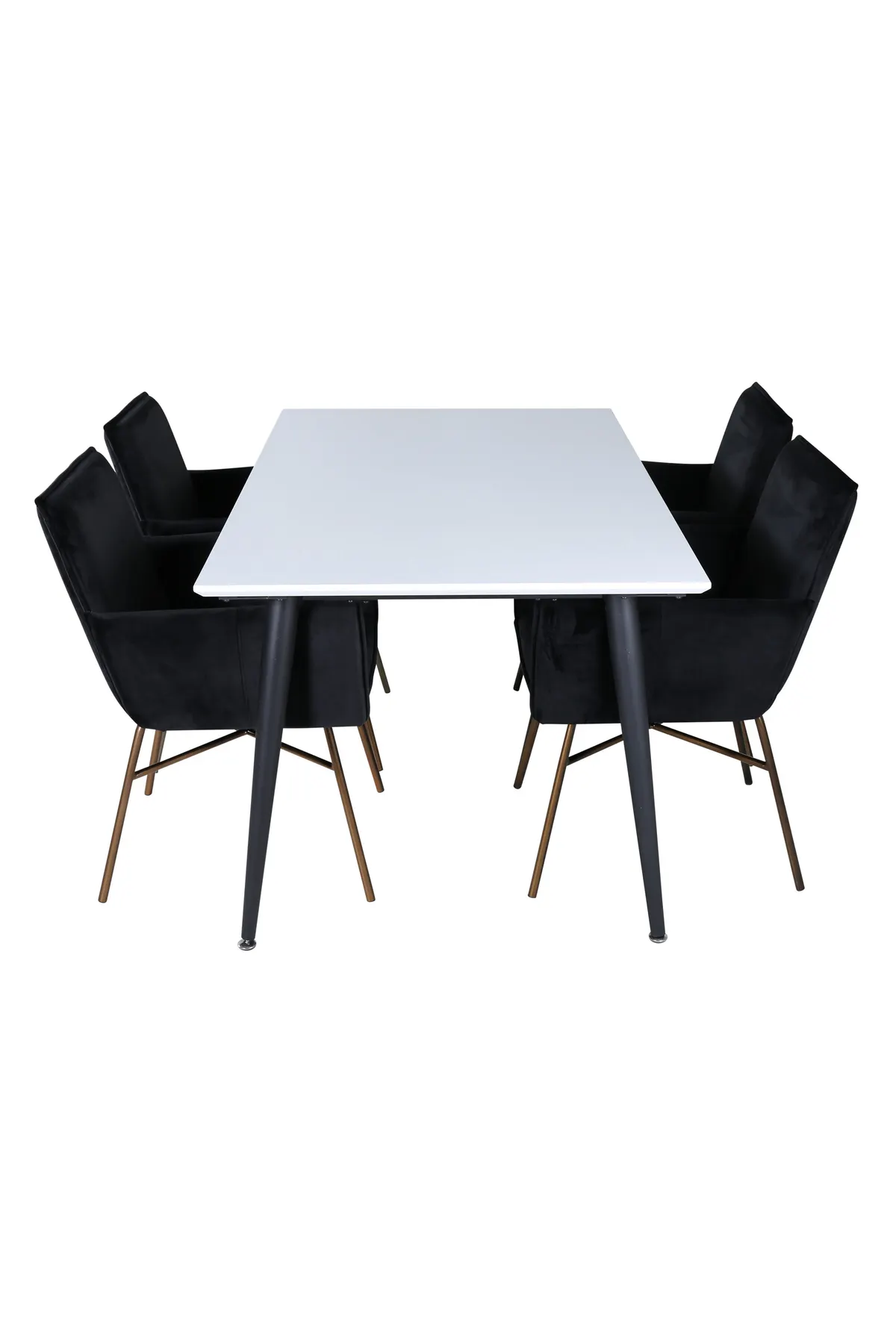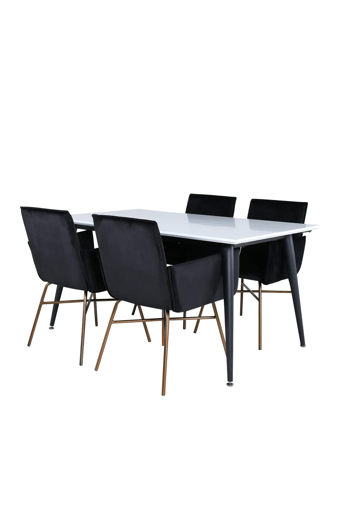 Klassisch, stilvoll und praktisch – Jimmy Esstisch ist eine sichere Karte für alle Gelegenheiten! Mit einer ausziehbaren Platte aus weißem HPL und MDF-Furnier und leicht ausgestellten Beinen aus schwarzem Metall passt dieser Tisch perfekt zu allen Einrichtungsstilen und Wohnungen. Abmessungen des Tisches: Länge ausziehbar zwischen: 150cm und 240cm, Breite: 90cm, Höhe: 76cm. Passend dazu gibt es 6 Petra-Esszimmerstühle in luxuriösem Design. Die einladende Sitzfläche ist aus schwarzem Samtstoff und die Stuhlbeine sind dekorativ aus kupferfarbenem Eisen. Maße der Stühle: Höhe: 87cm, Sitzhöhe: 48cm, Breite: 57cm, Tiefe: 60cm. Hier sitzen Sie und Ihre Gäste bequem für Stunden!