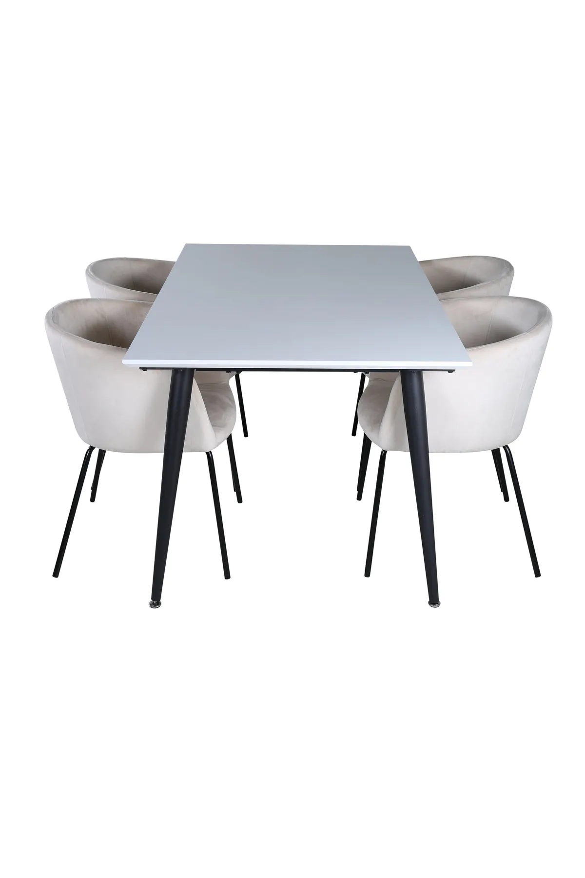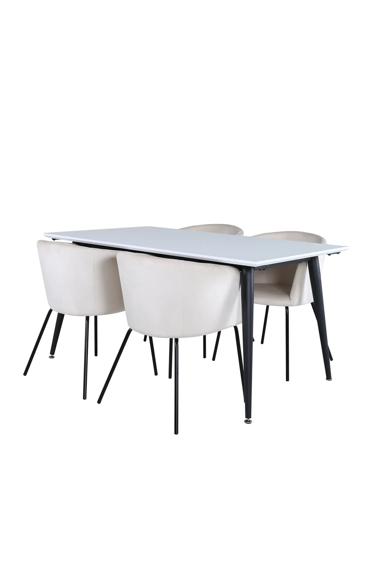 Unsere beliebten Esszimmerstühle Berit in luxuriösem Design verlängern die angenehmen Dinner-Momente! Der Stuhl hat eine großzügige Sitztiefe mit einer Sitzfläche aus beigem Samt und stilvolle schmale Stuhlbeine aus schwarzem Eisen. Stuhl Abmessungen: Höhe: 78cm, Sitzhöhe: 49cm, Breite: 55cm, Tiefe: 55cm. Hier werden 4 Esszimmerstühle mit dem klassischen Esstisch Jimmy kombiniert – eine sichere Karte für alle Gelegenheiten! Mit einer ausziehbaren Platte aus weißem HPL und MDF-Furnier und leicht ausgestellten Beinen aus schwarzem Metall passt dieser Tisch perfekt zu allen Einrichtungsstilen und Wohnungen. Abmessungen des Tisches: Länge ausziehbar zwischen: 150cm und 240cm, Breite: 90cm, Höhe: 76cm.