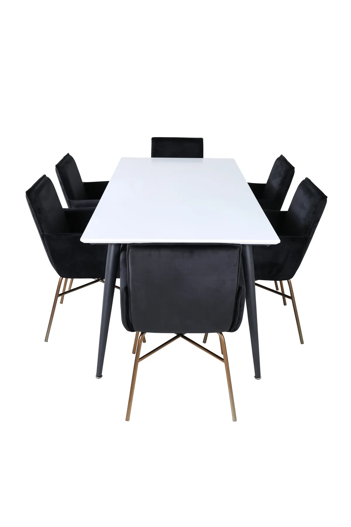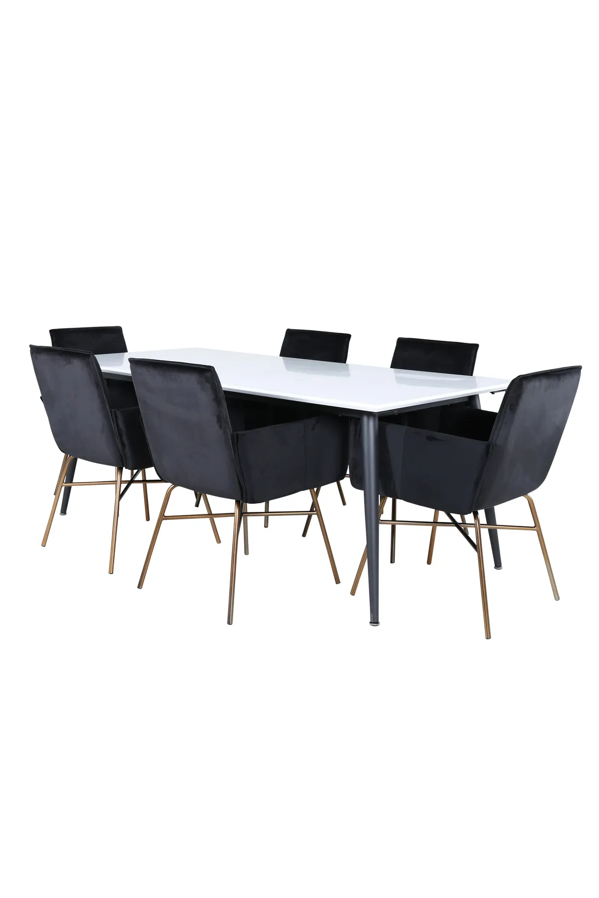 Klassisch, stilvoll und praktisch – Jimmy Esstisch ist eine sichere Karte für alle Gelegenheiten! Mit einer ausziehbaren Platte aus weißem HPL und MDF-Furnier und leicht ausgestellten Beinen aus schwarzem Metall passt dieser Tisch perfekt zu allen Einrichtungsstilen und Wohnungen. Abmessungen des Tisches: Länge ausziehbar zwischen: 195cm und 285cm, Breite: 90cm, Höhe: 76cm. Passend dazu gibt es 6 Petra-Esszimmerstühle in luxuriösem Design. Die einladende Sitzfläche ist aus schwarzem Samtstoff und die Stuhlbeine sind dekorativ aus kupferfarbenem Eisen. Maße der Stühle: Höhe: 87cm, Sitzhöhe: 48cm, Breite: 57cm, Tiefe: 60cm. Hier sitzen Sie und Ihre Gäste bequem für Stunden!