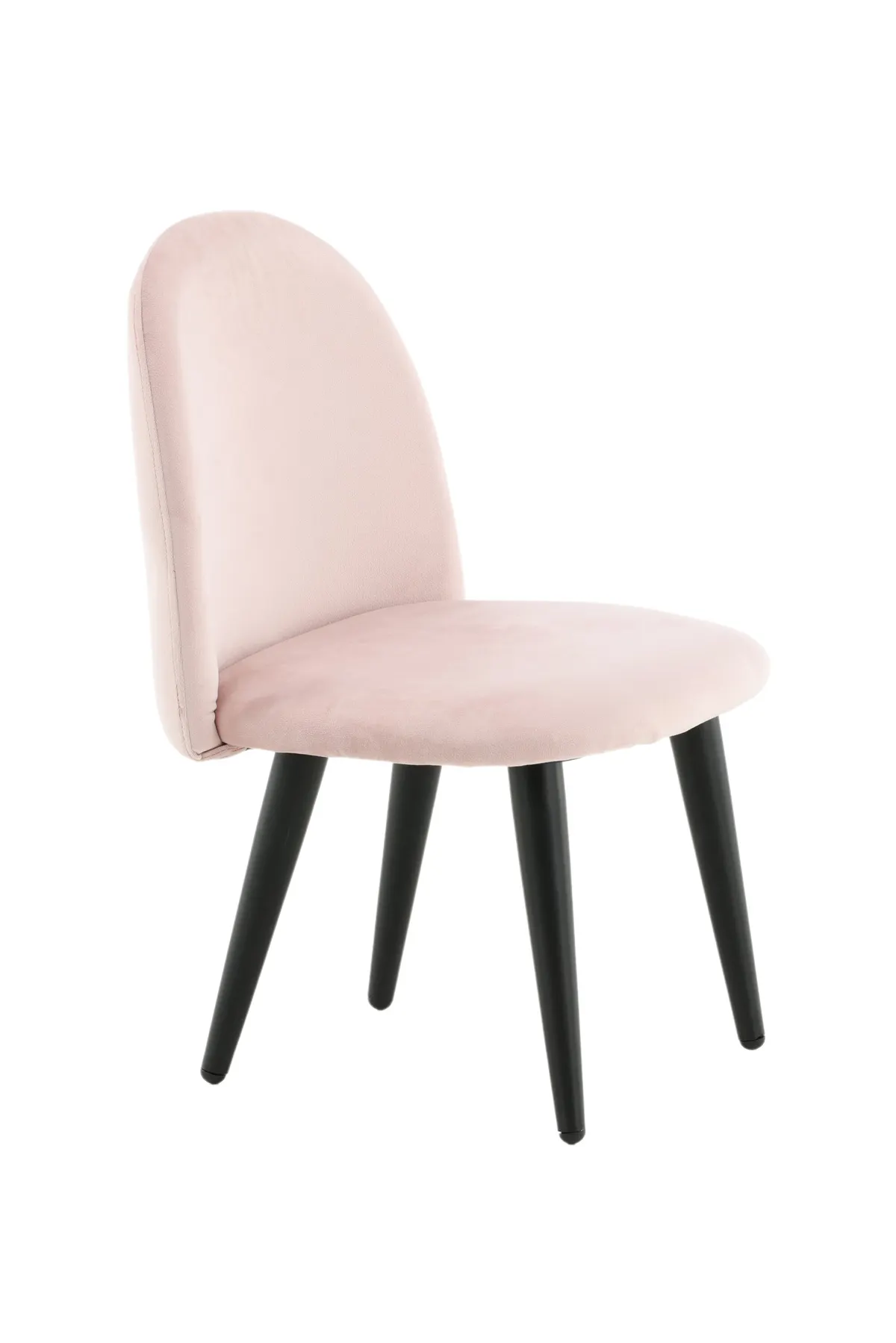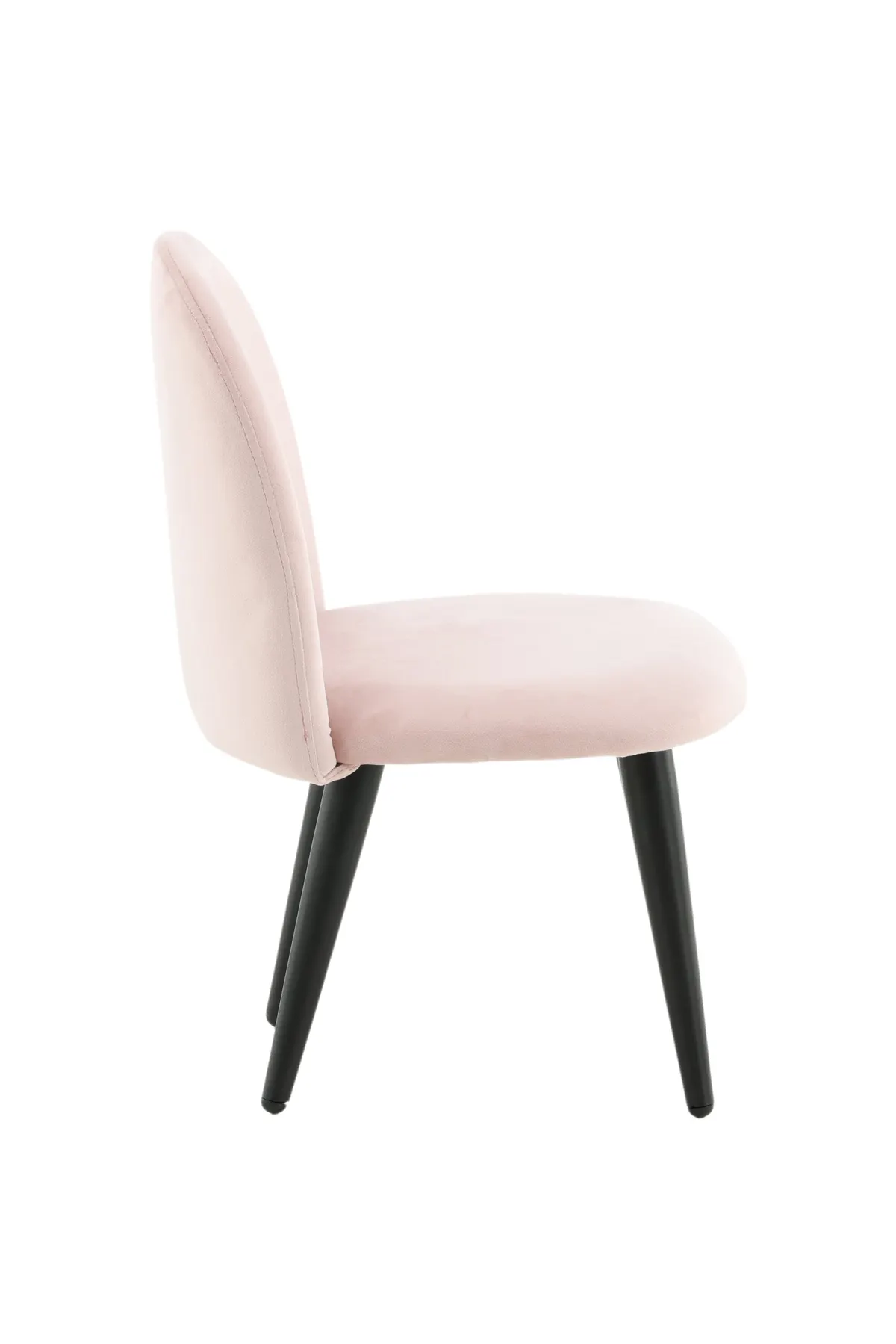 Esszimmerstuhl für Kinder in einem vollständig verkleideten Design mit Beinen aus weißem, pulverbeschichtetem Metall und mit einer leicht abgerundeten Rückenlehne und Sitzfläche aus gepolstertem rosa Samtstoff. Leichtere Montage ist erforderlich.