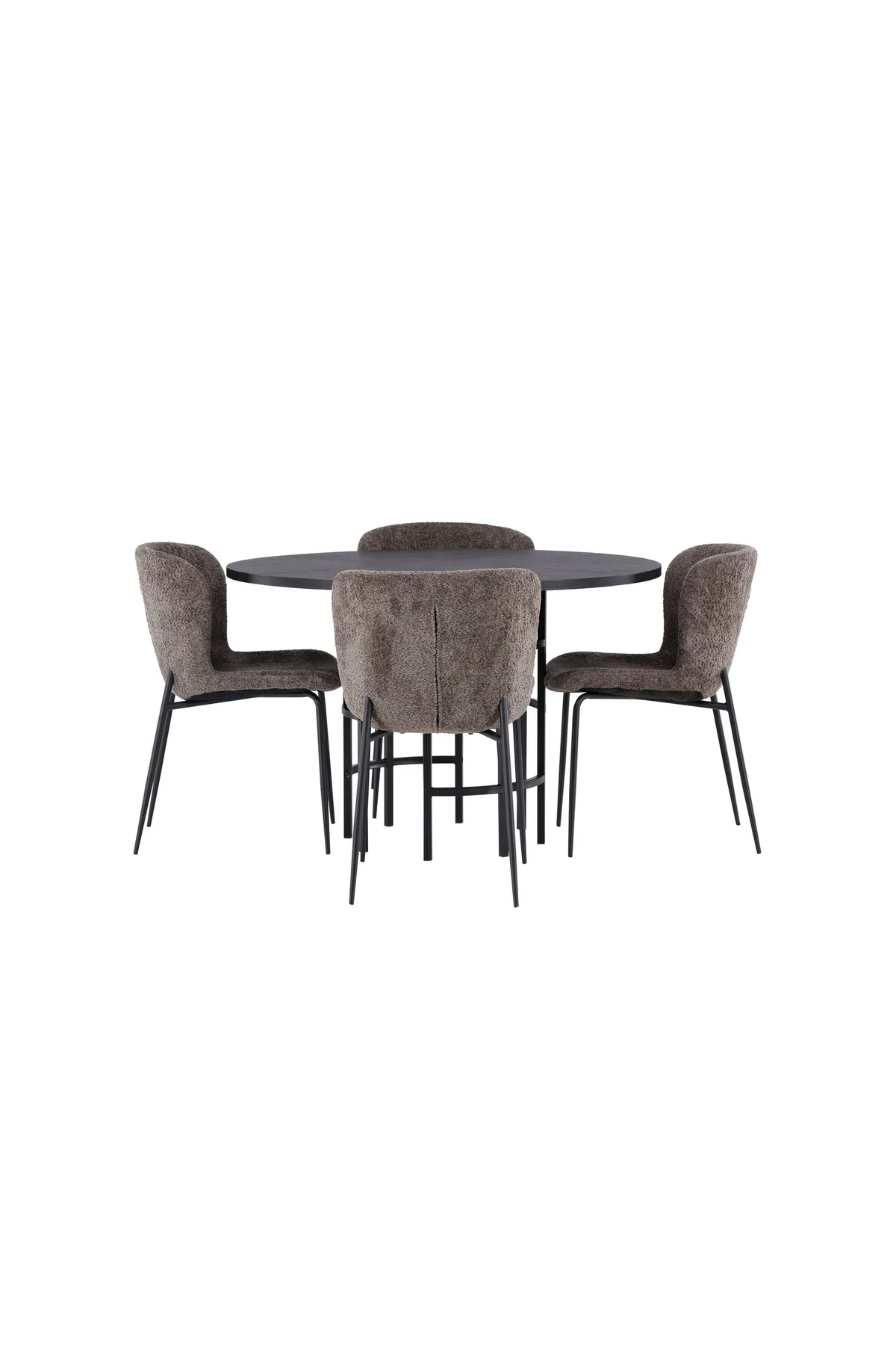 Hier trifft industrielles Design auf weiche Formen! Unser runder Esstisch Copenhagen hat eine elegante, schwarze Tischplatte aus MDF und einen dekorativen, zylinderförmigen Fuß aus schwarzem Metall. Hier in stilvoller Kombination mit unseren trendigen Esszimmerstühlen aus der Modesto-Serie. Der Stuhl ist komplett mit beigem Fellstoff gepolstert und hat stilvolle schmale Beine aus schwarzem Metall. Die leicht gerundete Rückenlehne und das gepolsterte Sitzkissen sorgen für zusätzlichen Komfort und verlängern angenehme Mahlzeiten rund um den Esstisch. Sitzen Sie bequem und trendig in die Zukunft! Abmessungen des Tisches: 115cm.