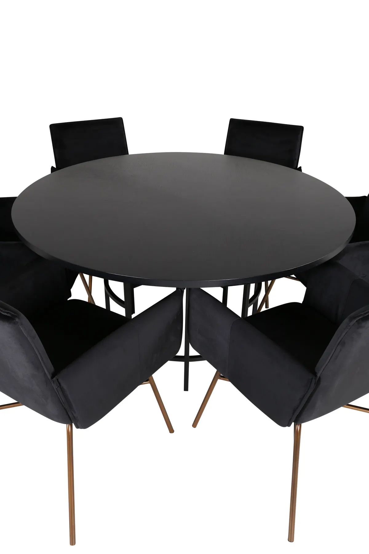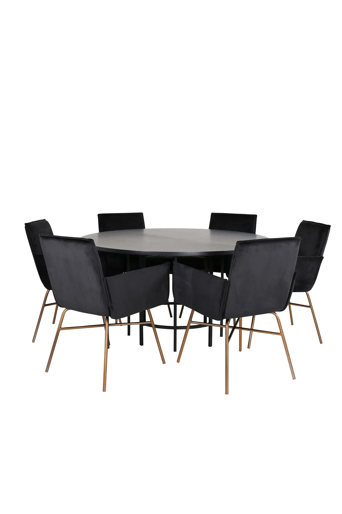 Copenhagen, unser beliebter runder Esstisch mit einer schönen Tischplatte aus schwarzem MDF mit Furnieren und einem dekorativen, zylinderförmigen Untergestell aus schwarzem Metall. Der Tisch ist durchgängig in elegantem Schwarz gehalten, was dem Raum einen pompösen und großspurigen Ausdruck verleiht, sich aber auch gut mit anderen Einrichtungen kombinieren lässt. Tischabmessungen: Durchmesser: 140cm, Höhe: 74cm. Dazu gibt es 6 Petra Esszimmerstühle in luxuriösem Design. Die Stühle haben eine bequeme Sitztiefe mit Sitz aus schwarzem Samt und schmale Stuhlbeine aus kupferfarbenem Eisen. Maße der Stühle: Höhe: 87cm, Sitzhöhe: 48cm, Breite: 57cm, Tiefe: 60cm. Eine angenehme Sitzgruppe für alle Gelegenheiten!
