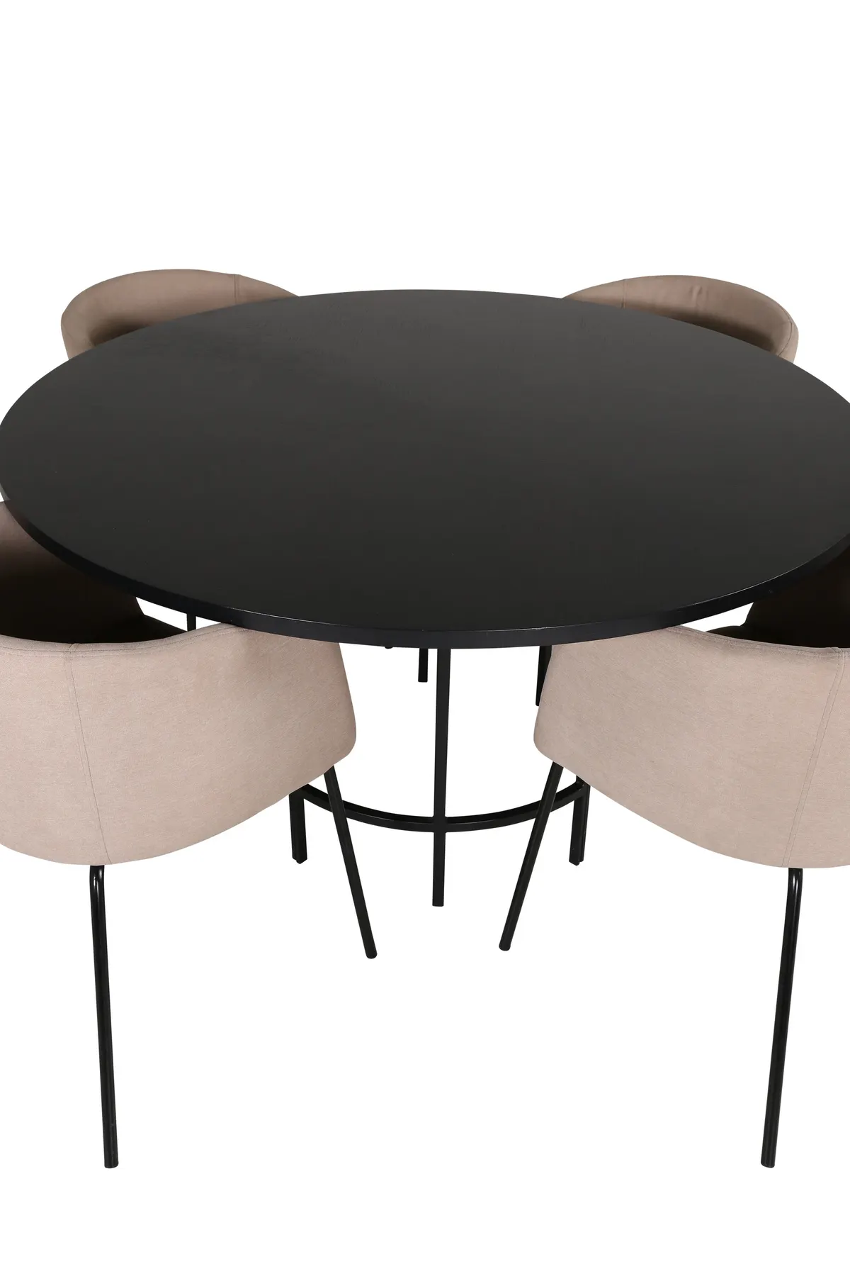 Schaffen Sie einen charmanten Mittelpunkt im Herzen Ihres Zuhauses mit einer runden Essgruppe im modernen Look! Der Esstisch Copenhagen hat ein trendbeständiges Design in einheitlich schwarzer Farbe mit einer Tischplatte aus MDF mit Furnier und einem dekorativen, zylinderförmigen Metalluntergestell. Tischabmessungen: Durchmesser: 140cm, Höhe: 74cm. Hier wird er mit 4 Berit Esszimmerstühlen in luxuriösem Design kombiniert. Die Stühle haben eine bequeme Sitzfläche aus beigem Polyesterleinen und stilvoll schmale Stangenbeine aus Eisen. Maße der Stühle: Höhe: 78cm, Sitzhöhe: 49cm, Breite: 55cm, Tiefe: 55cm. Richten Sie sich für eine angenehme Essenszeit ein!