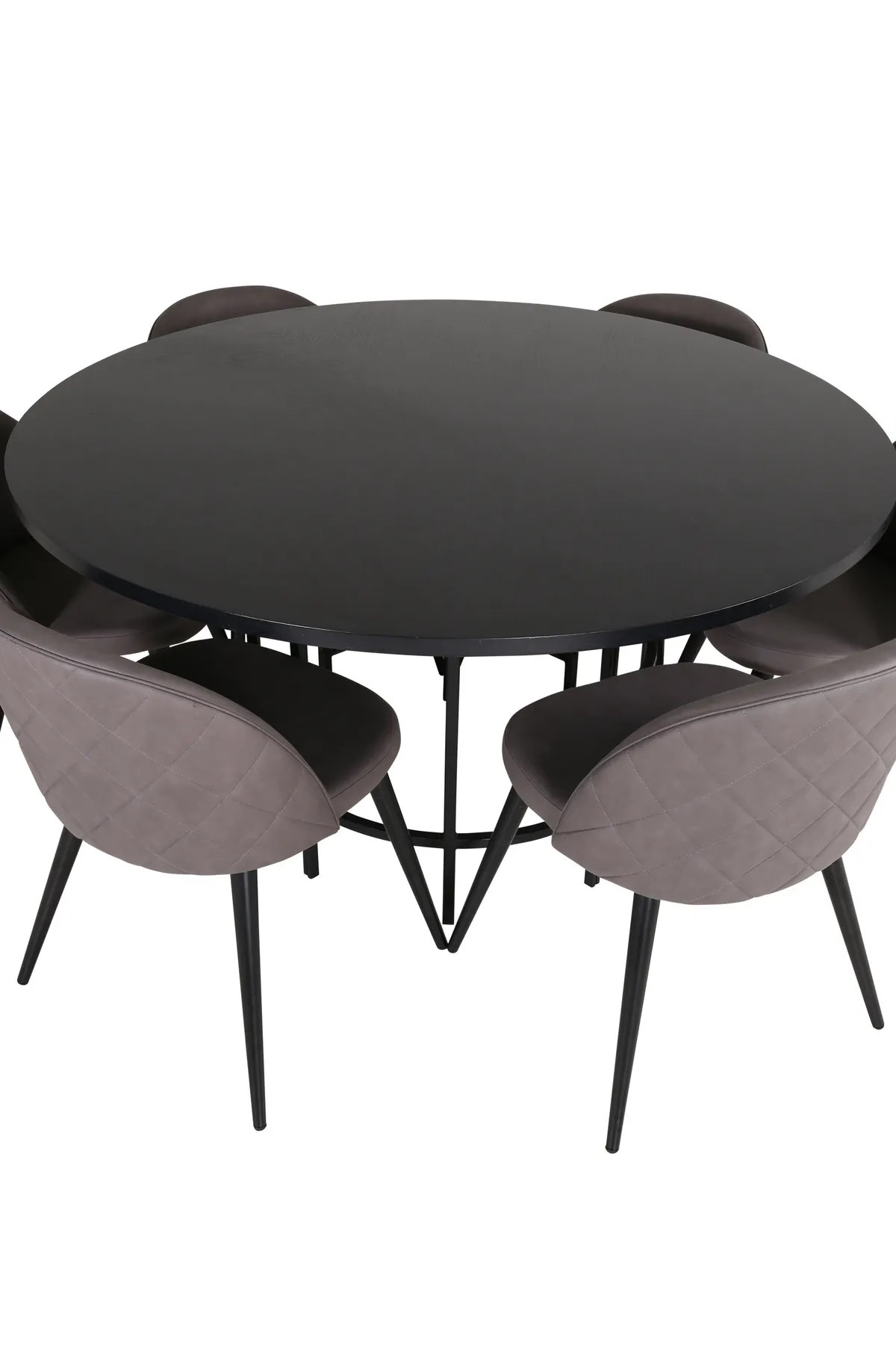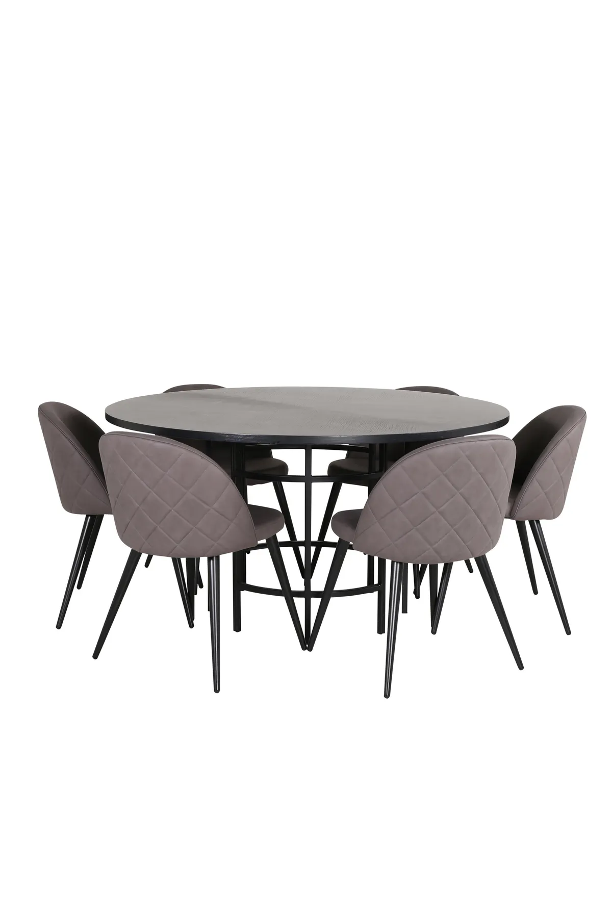 Richten Sie das Wohnzimmer einladend und trendbewusst ein! Der Esstisch Copenhagen hat ein trendbeständiges Design in einheitlich schwarzer Farbe mit einer Tischplatte aus MDF mit Furnier und einem dekorativen, zylinderförmigen Metalluntergestell. Tischabmessungen: Durchmesser: 140cm, Höhe: 74cm. Hier in köstlicher Kombination mit 6 Velvet Stitches Esszimmerstühlen. Die Stuhlbeine sind leicht ausgestellt in Eisen und die Sitze schwarz in Mikrofaser mit stilvollen Ziernähten. Stuhl Abmessungen: Höhe: 76,5cm, Sitzhöhe: 46,5cm, Breite: 50cm, Tiefe: 57cm. So schön für das Auge, so bequem zum Sitzen!