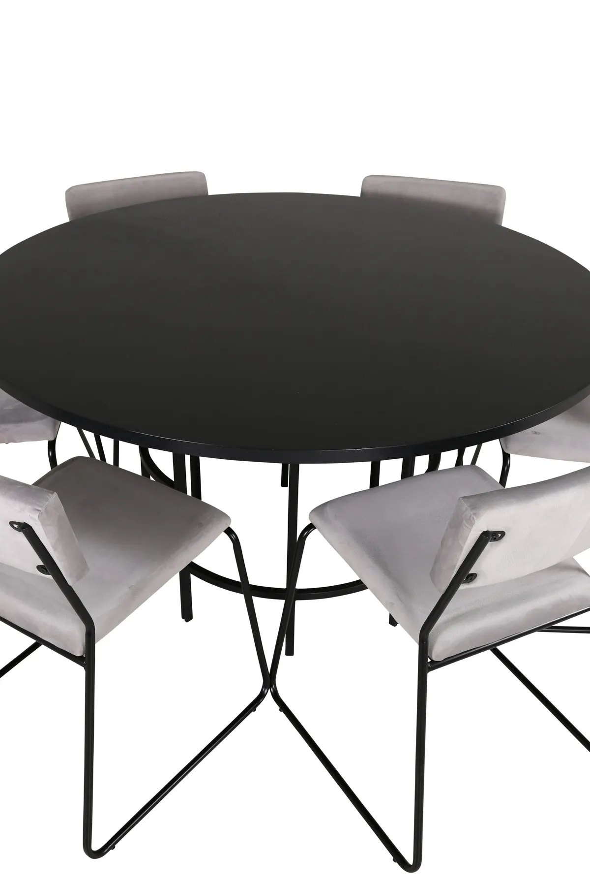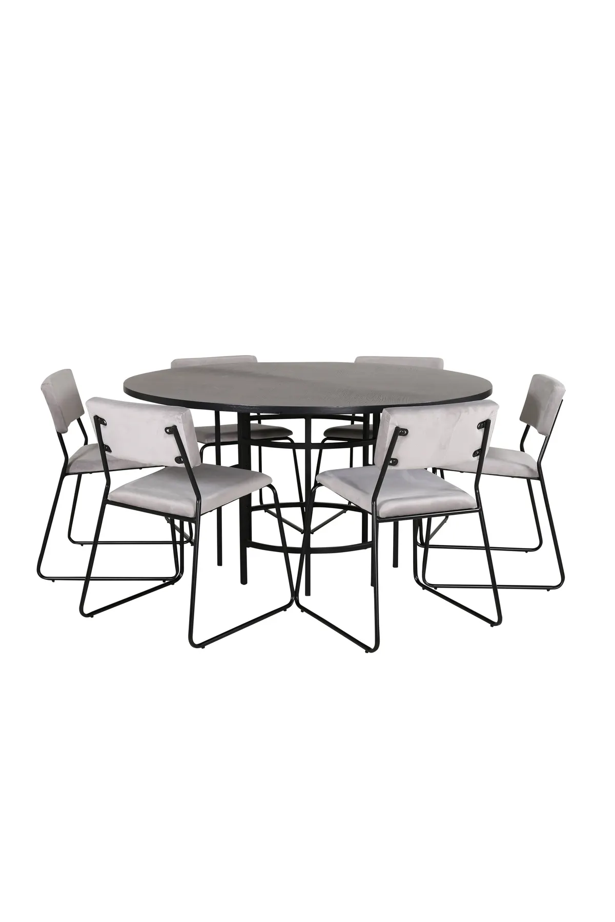 Kombinieren Sie den industriellen Look mit minimalistischem Dekor! Der Esstisch Copenhagen hat ein trendbeständiges Design in einheitlich schwarzer Farbe mit einer Tischplatte aus MDF mit Furnier und einem dekorativen, zylinderförmigen Metallgestell. Tischabmessungen: Durchmesser: 140cm, Höhe: 74cm. Dazu passen 6 stilvolle Esszimmerstühle aus der Serie Kenth. Die Stuhlbeine sind schmal in Eisen und die bequemen Sitze in hellgrauem Samtstoff. Abmessungen der Stühle: Höhe: 76cm, Sitzhöhe: 48,5cm, Breite: 40cm, Tiefe: 52cm. Schaffen Sie einen charmanten Mittelpunkt, um den Sie Familie und Freunde versammeln können!