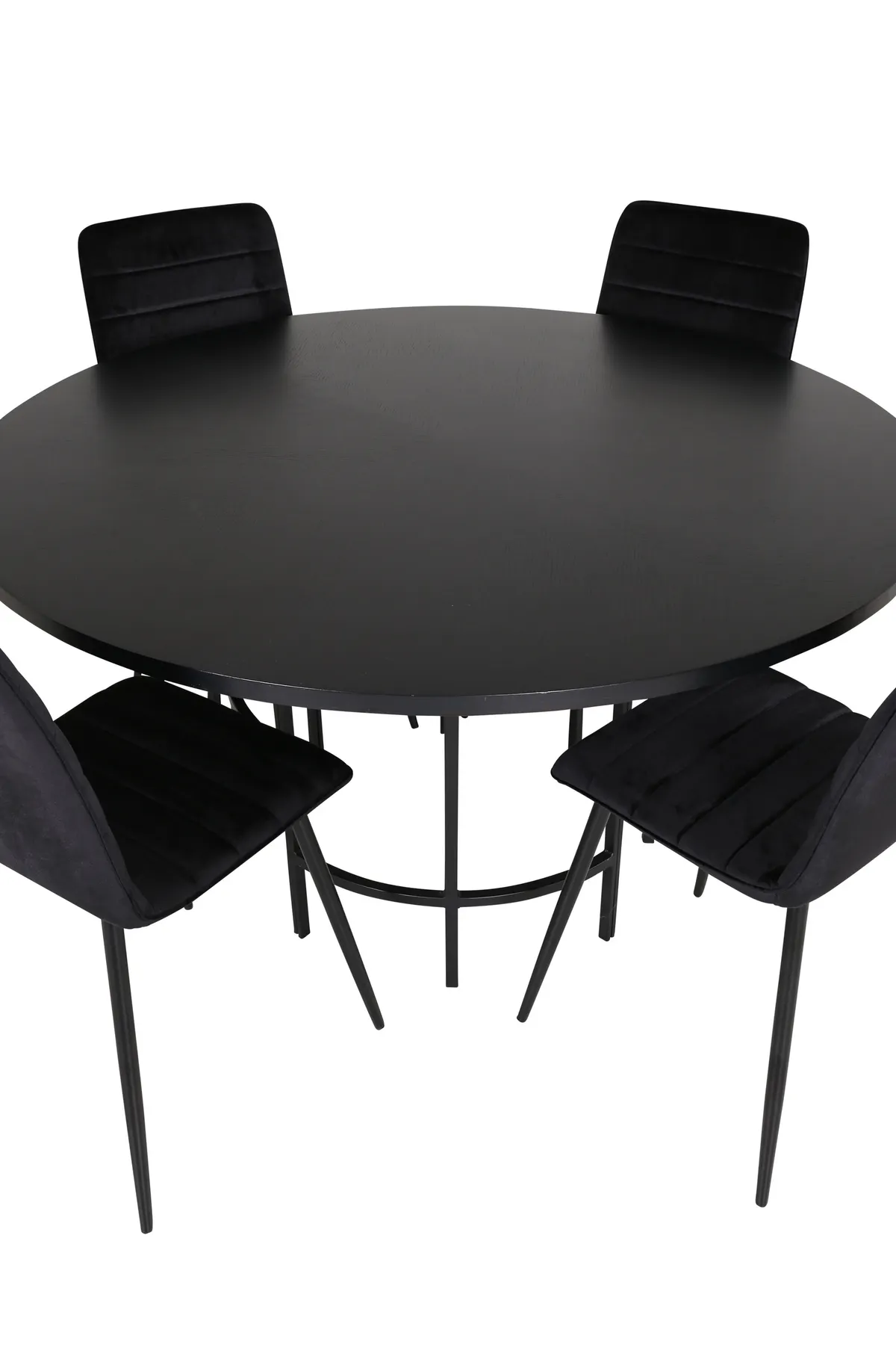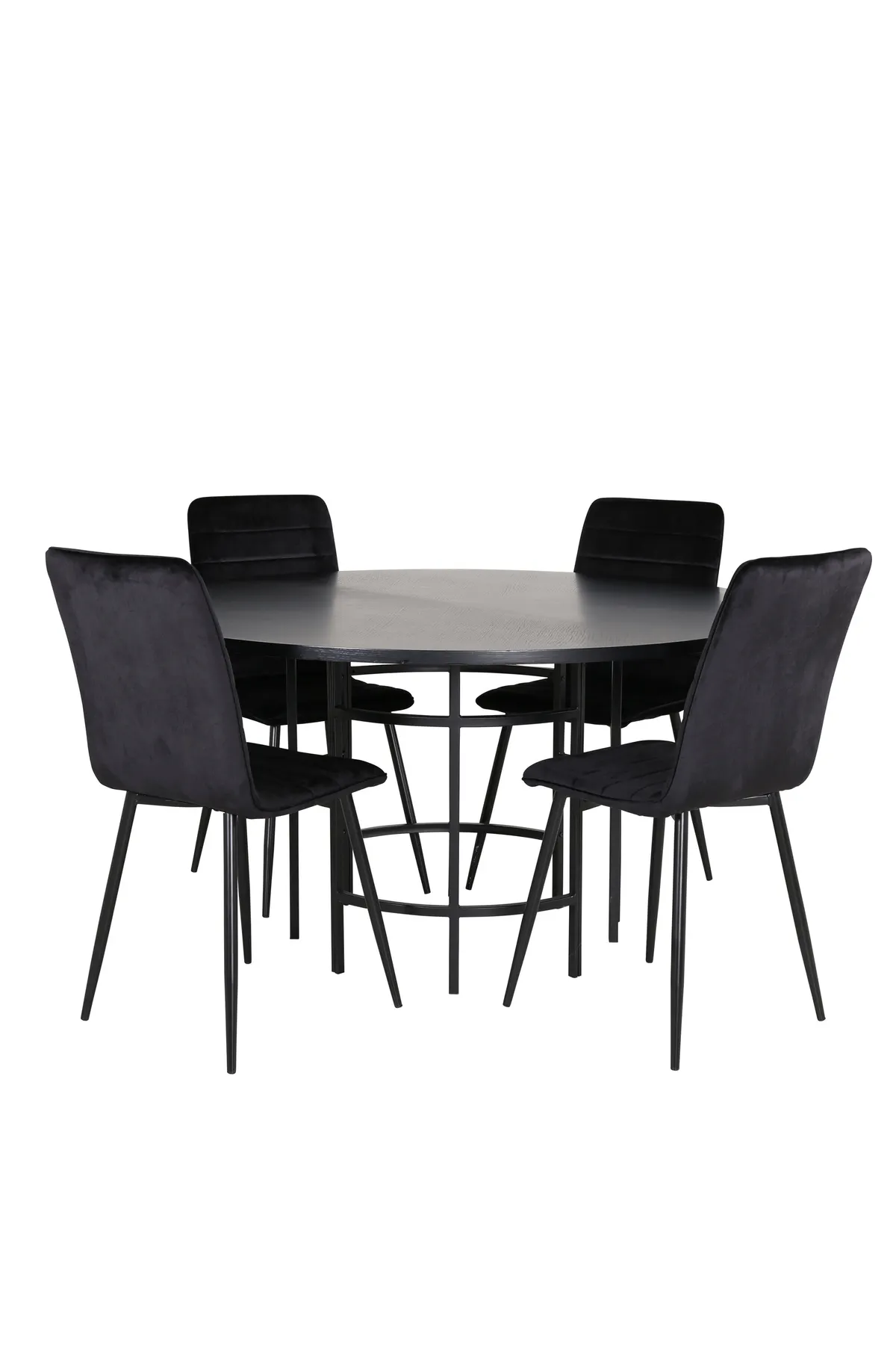 Stilvoll, pompös und einladend – eine Essgruppe bei der jeder richtig liegt! Copenhagen Esstisch hat ein trendtaugliches Design in konsequent schwarzer Farbe mit einer Tischplatte aus MDF mit Furnier und einem dekorativen, zylinderförmigen Metalluntergestell. Tischabmessungen: Durchmesser: 140cm, Höhe: 74cm. Hier zusammen mit 4 Windu Luxus Esszimmerstühlen in geradem Design. Die Stuhlbeine sind aus schwarzem Eisen und die Sitze aus feinem schwarzem Samtstoff. Stuhl Abmessungen: Höhe: 94cm, Sitzhöhe: 47cm, Breite: 43cm, Tiefe: 49cm. Sitzen Sie bequem und laden Sie zu vielen angenehmen Mahlzeiten ein!