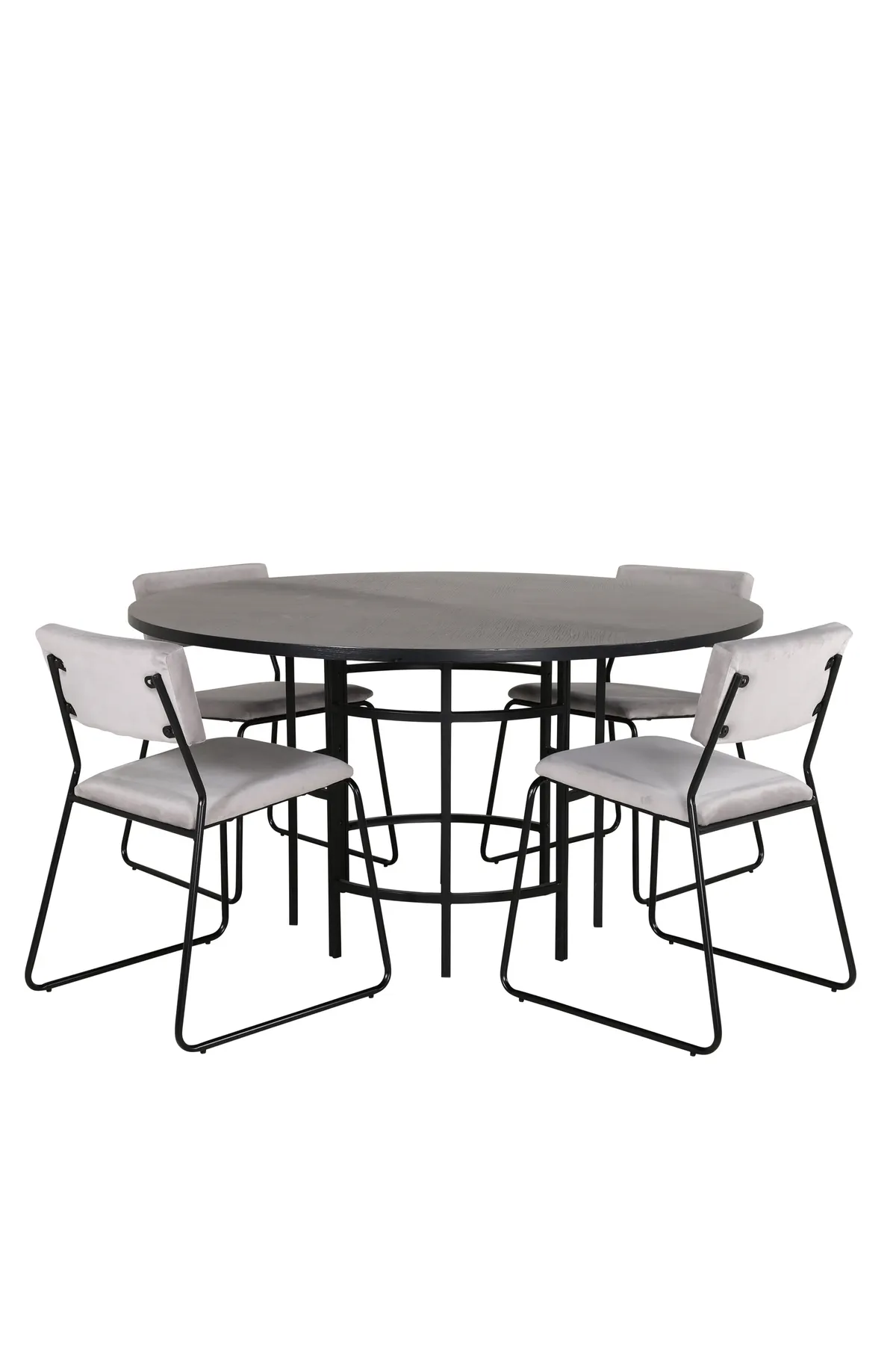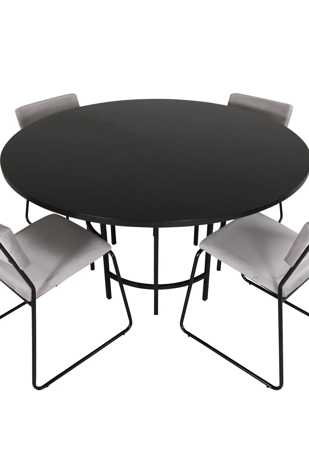 Kombinieren Sie den industriellen Look mit minimalistischem Dekor! Der Esstisch Copenhagen hat ein trendbeständiges Design in einheitlich schwarzer Farbe mit einer Tischplatte aus MDF mit Furnier und einem dekorativen, zylinderförmigen Metallgestell. Tischabmessungen: Durchmesser: 140cm, Höhe: 74cm. Dazu passen 4 stilvolle Esszimmerstühle aus der Serie Kenth. Die Stuhlbeine sind schmal in Eisen und die bequemen Sitze in hellgrauem Samtstoff. Abmessungen der Stühle: Höhe: 76cm, Sitzhöhe: 48,5cm, Breite: 40cm, Tiefe: 52cm. Schaffen Sie einen charmanten Mittelpunkt, um den Sie Familie und Freunde versammeln können!