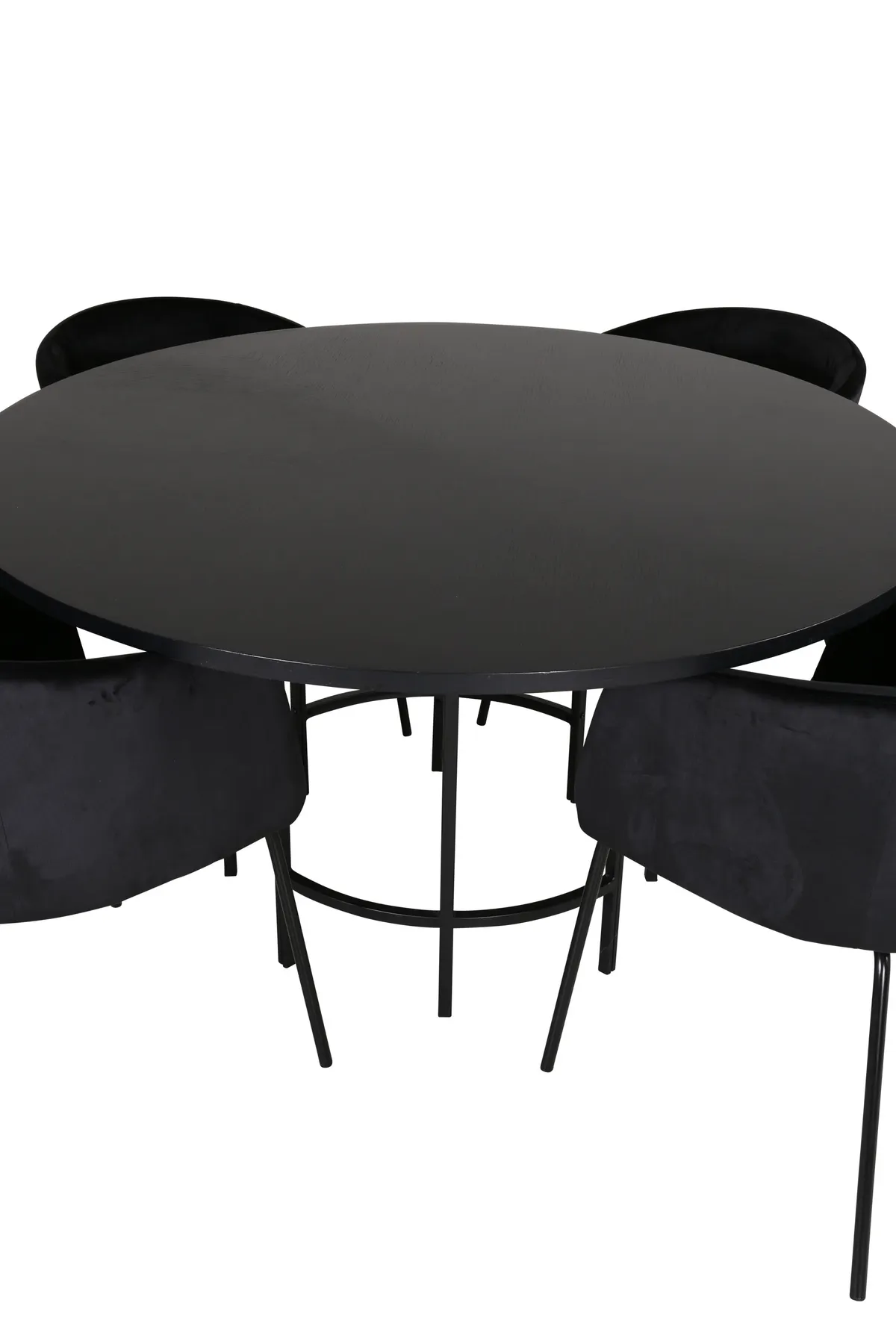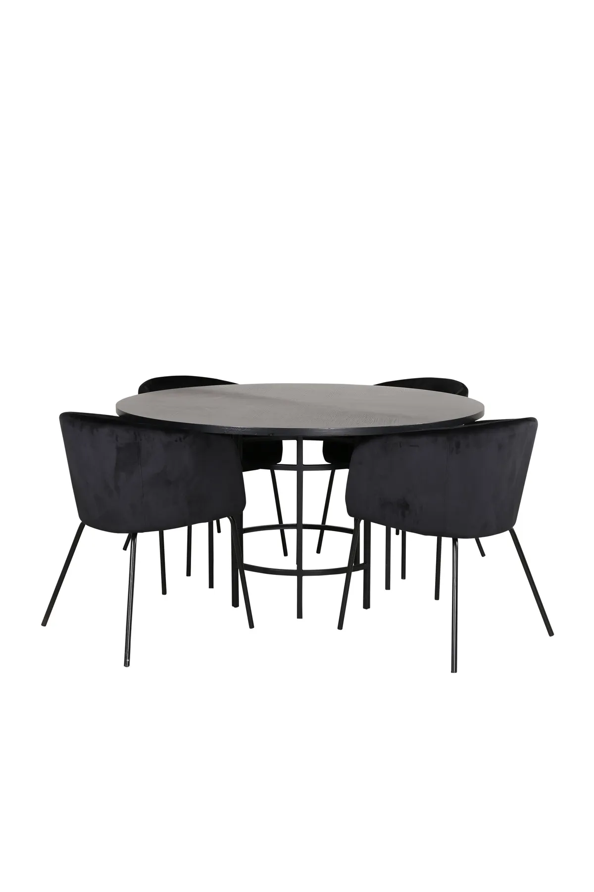 Schaffen Sie einen charmanten Mittelpunkt im Herzen Ihres Zuhauses mit einer runden Essgruppe im modernen Look! Der Esstisch Copenhagen hat ein trendbeständiges Design in einheitlich schwarzer Farbe mit einer Tischplatte aus MDF mit Furnier und einem dekorativen, zylinderförmigen Metalluntergestell. Tischabmessungen: Durchmesser: 140cm, Höhe: 74cm. Hier wird er mit 4 Berit Esszimmerstühlen in luxuriösem Design kombiniert. Die Stühle haben einen bequemen Sitz aus schwarzem Samt und stilvoll schmale Hockerbeine aus Eisen. Maße der Stühle: Höhe: 78cm, Sitzhöhe: 49cm, Breite: 55cm, Tiefe: 55cm. Richten Sie sich für eine angenehme Essenszeit ein!