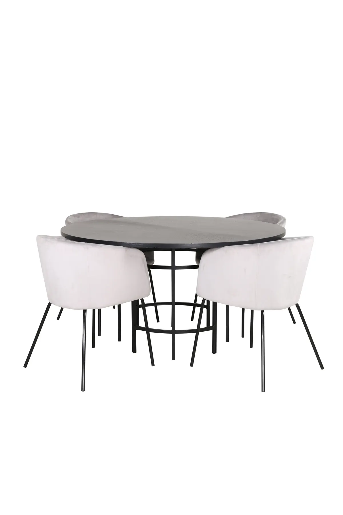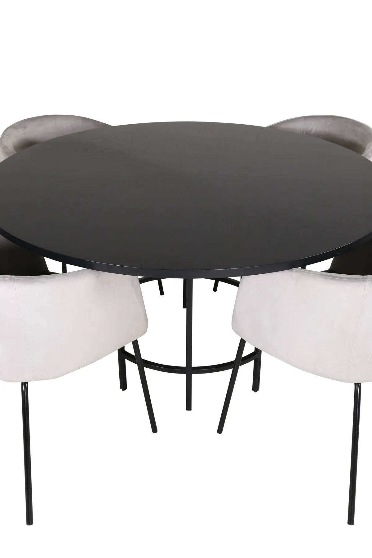 Schaffen Sie einen charmanten Mittelpunkt im Herzen Ihres Zuhauses mit einer runden Essgruppe im modernen Look! Der Esstisch Copenhagen hat ein trendbeständiges Design in einheitlich schwarzer Farbe mit einer Tischplatte aus MDF mit Furnier und einem dekorativen, zylinderförmigen Metalluntergestell. Tischabmessungen: Durchmesser: 140cm, Höhe: 74cm. Hier wird er mit 4 Berit Esszimmerstühlen in luxuriösem Design kombiniert. Die Stühle haben eine bequeme Sitzfläche aus hellgrauem Samt und stilvoll schmale Hockerbeine aus Eisen. Maße der Stühle: Höhe: 78cm, Sitzhöhe: 49cm, Breite: 55cm, Tiefe: 55cm. Richten Sie sich für eine angenehme Essenszeit ein!