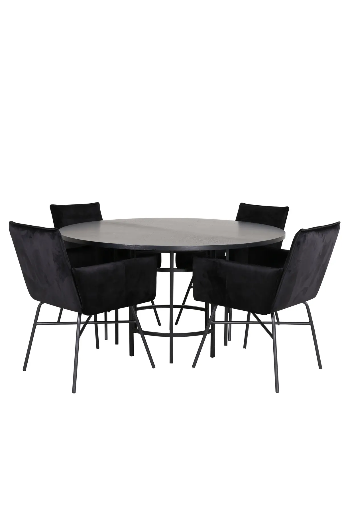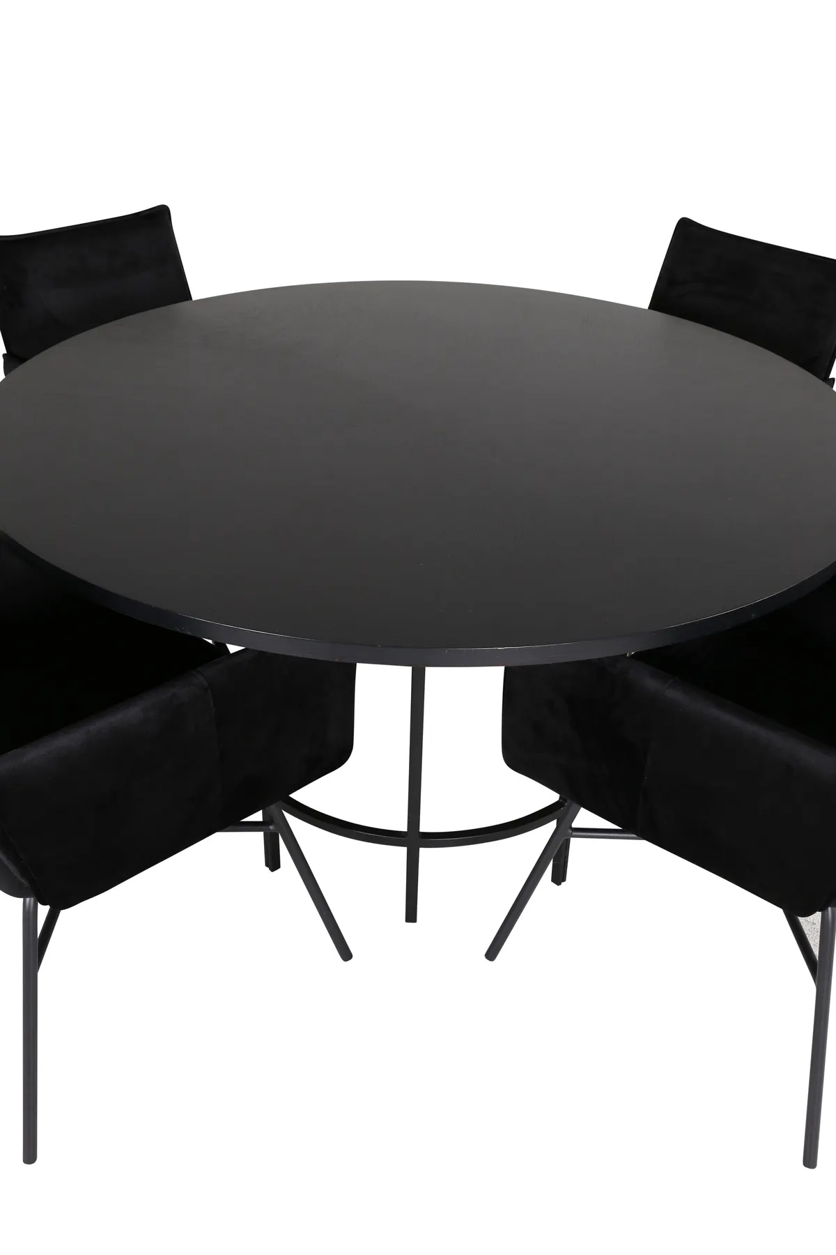 Copenhagen, unser beliebter runder Esstisch mit einer schönen Tischplatte aus schwarzem MDF mit Furnieren und einem dekorativen, zylinderförmigen Untergestell aus schwarzem Metall. Der Tisch ist durchgängig in elegantem Schwarz gehalten, was dem Raum einen pompösen und großspurigen Ausdruck verleiht, aber auch leicht mit anderen Einrichtungen zu kombinieren ist. Tischabmessungen: Durchmesser: 140cm, Höhe: 74cm. Dazu gibt es 4 Petra Esszimmerstühle in luxuriösem Design. Die Stühle haben eine bequeme Sitztiefe mit Sitz aus schwarzem Samt und schmale Stuhlbeine aus Eisen. Maße der Stühle: Höhe: 87cm, Sitzhöhe: 48cm, Breite: 57cm, Tiefe: 60cm. Eine angenehme Essgruppe für alle Gelegenheiten!