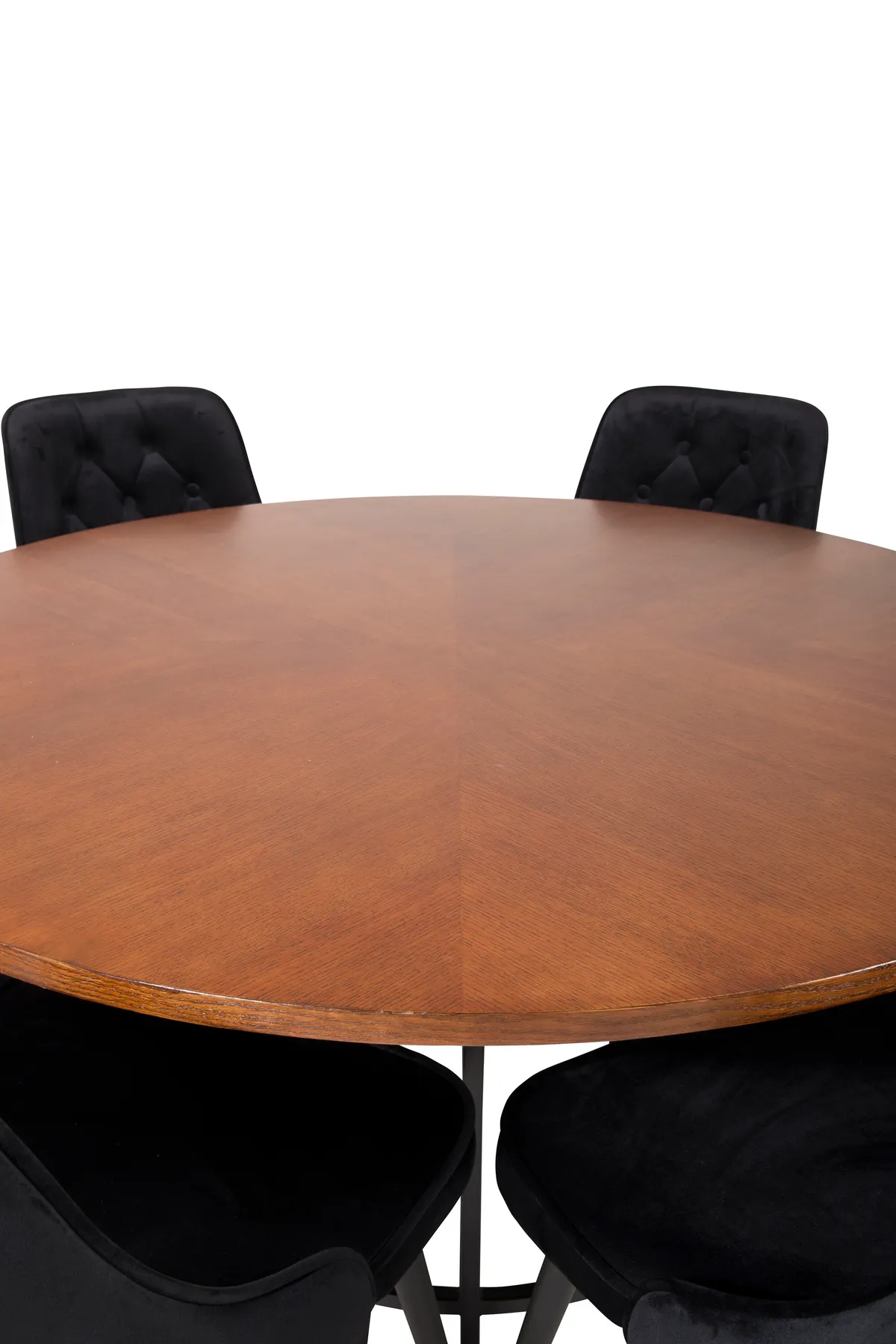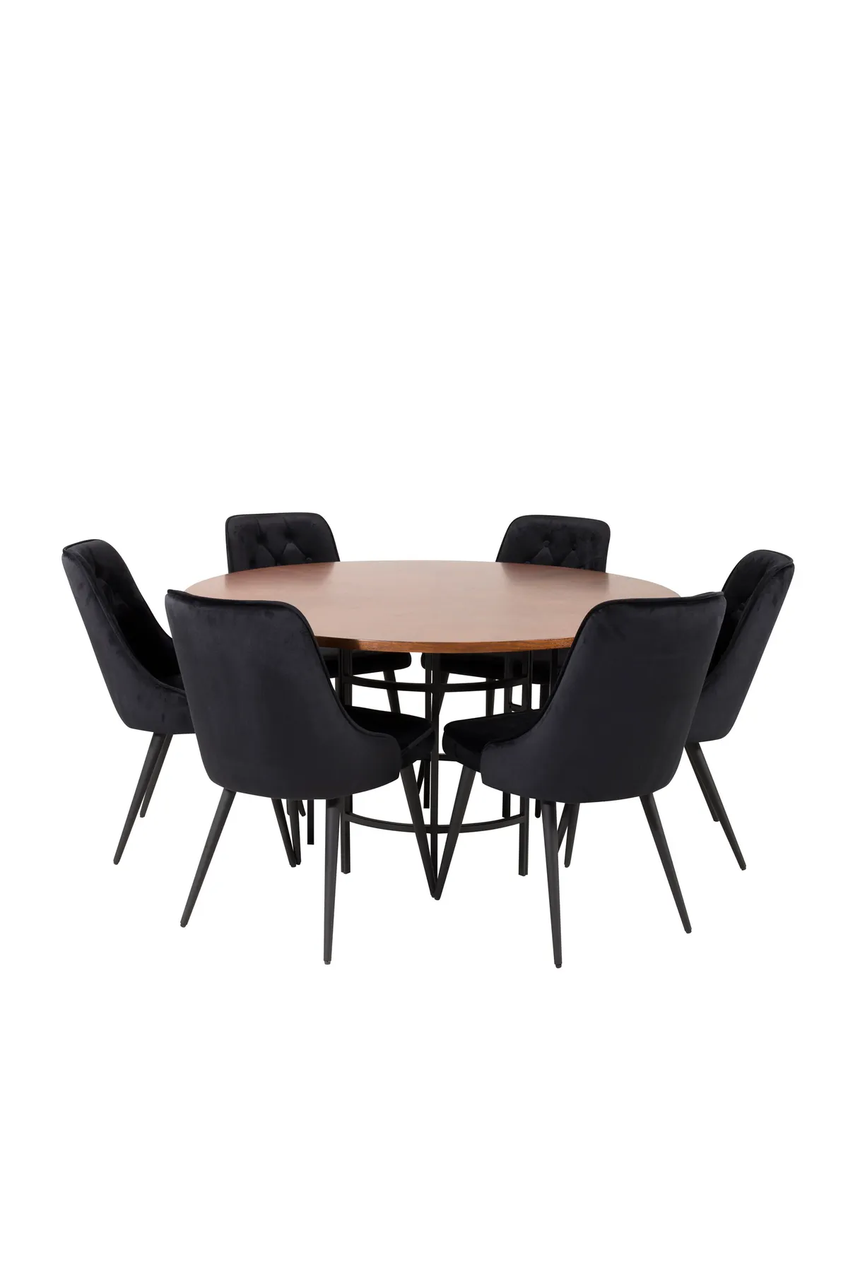 Esstisch Copenhagen mit einer schönen braunen Tischplatte und einem dekorativen Untergestell aus schwarzem Metall zusammen mit unseren bequemen Esszimmerstühlen aus der Velvet-Serie ergibt eine Kombination – modern, gemütlich und luxuriös!