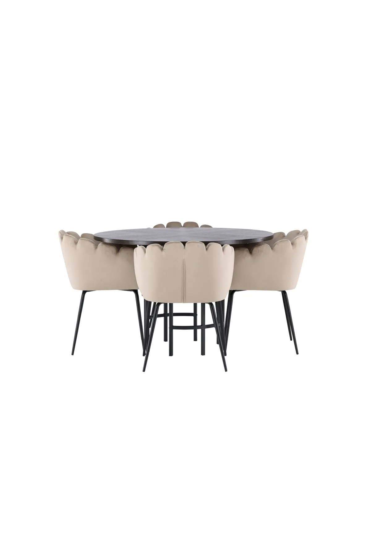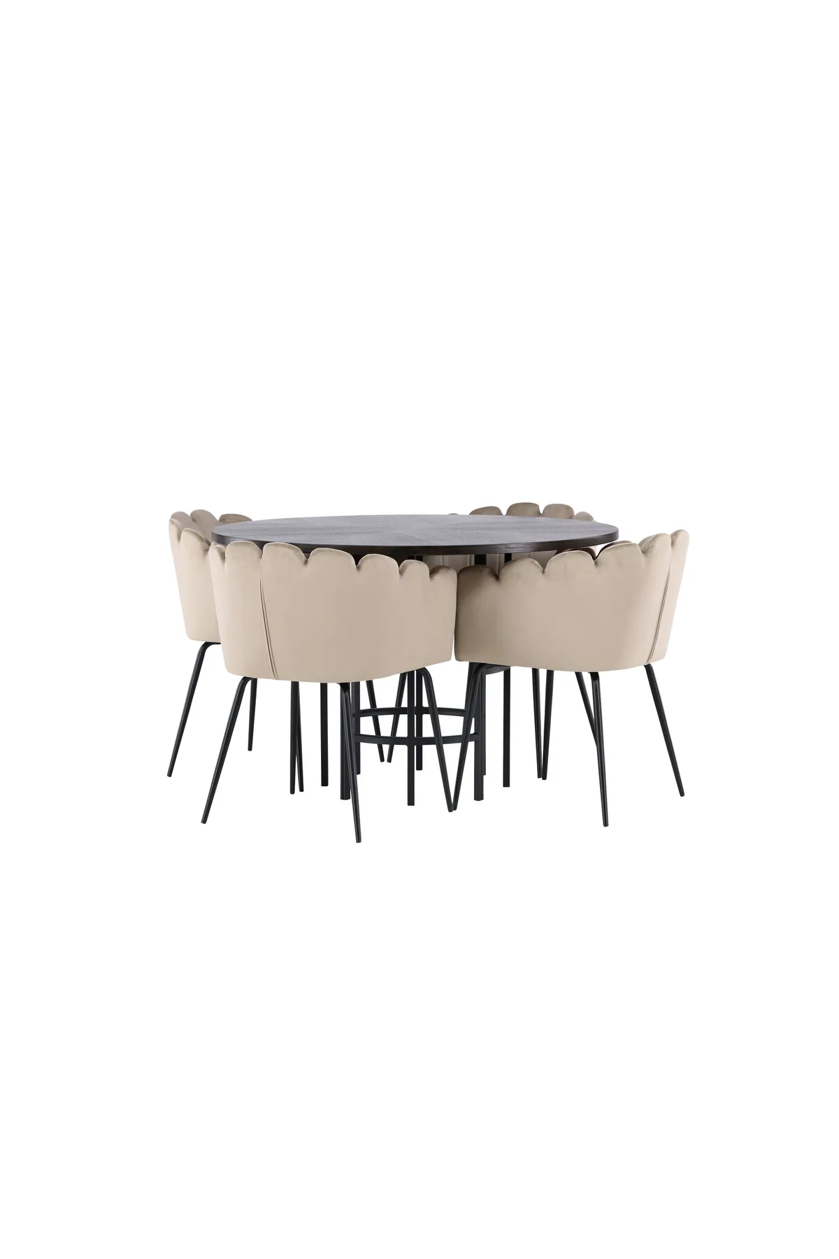 Schaffen Sie einen luxuriösen Blickfang! Unser runder Esstisch Copenhagen hat eine schöne braune Tischplatte aus MDF mit Furnier und einen dekorativen, zylinderförmigen Fuß aus schwarzem Metall. Hier zusammen mit unseren beliebten Esszimmerstühlen Limhamn. Der Stuhl hat ein einladendes Design mit dekorativer muschelförmiger Rückenlehne mit Ziernähten und einem runden Sitz aus geschmackvollem beigem Samtstoff. Die Beine sind aus schwarz pulverbeschichtetem Metall. Sitzen Sie bequem und elegant in die Zukunft! Abmessungen des Tisches: 115cm.