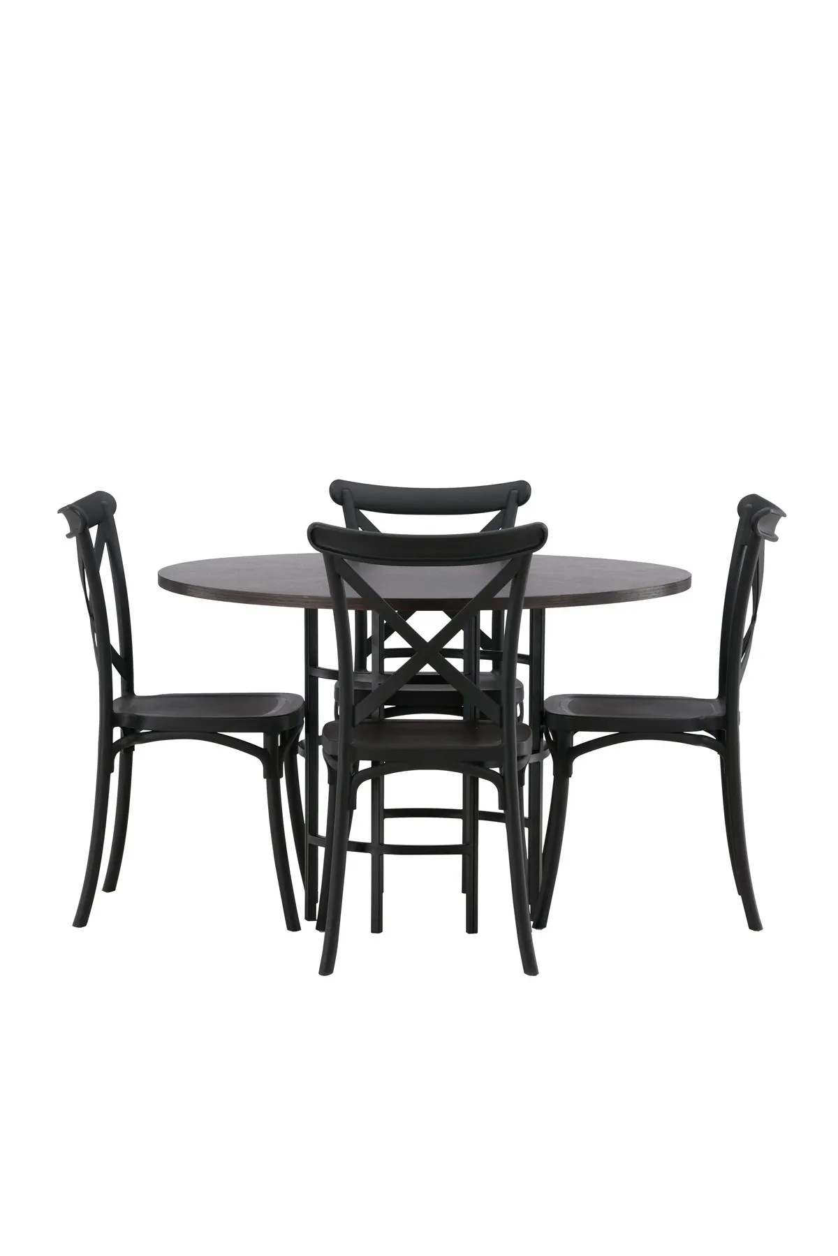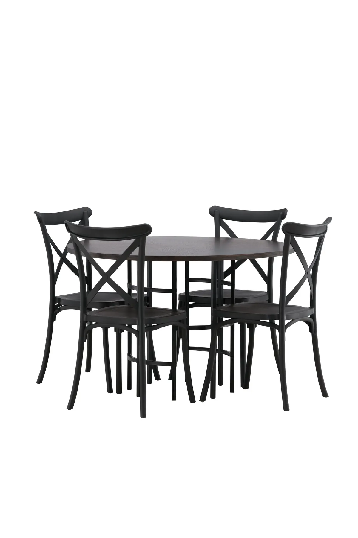 Eine Essgruppe, die klassisches Design und moderne Formen kombiniert! Der runde Esstisch der Serie Copenhagen gehört zur Kollektion Furniture Fashion und hat eine schöne braune Tischplatte aus MDF mit Furnier und ein dekoratives, zylinderförmiges Untergestell aus schwarzem Metall. Hier zusammen mit den Esszimmerstühlen aus der Serie Crosett. Die Stühle haben ein nostalgisches Design mit einer gekreuzten Rückenlehne und geraden Linien, durchweg aus schwarzem Kunststoff. Hier erhalten Sie eine stilvolle Essgruppe, mit der Sie Ihr Zuhause dekorieren können!