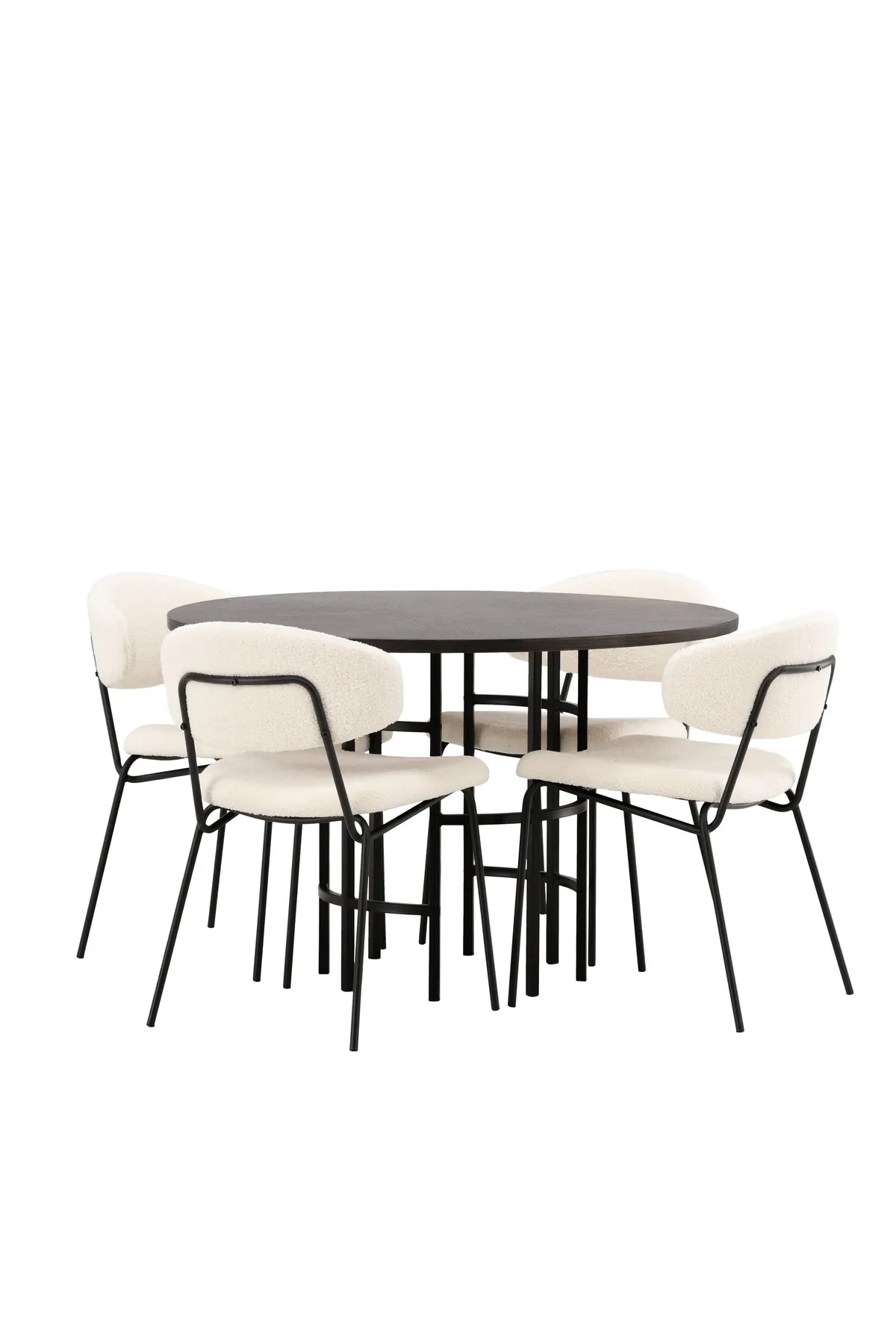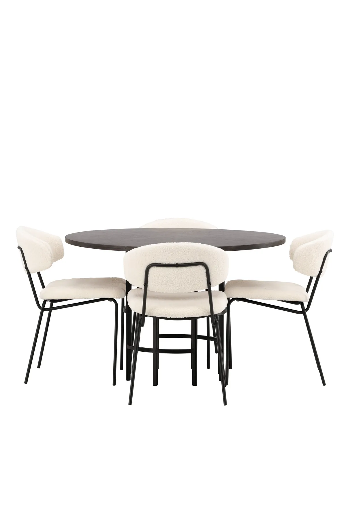 Eine gemütliche und einladende Essgruppe, die schnell ein modernes Gefühl in Ihrem Zuhause schafft! Der runde Esstisch aus der Serie Copenhagen gehört zur Furniture Fashion Kollektion und hat eine schöne braune Tischplatte aus MDF mit Furnier und ein dekoratives, zylinderförmiges Untergestell aus schwarzem Metall. Hier zusammen mit unseren schönen Esszimmerstühlen aus der Chico-Serie. Die Stühle haben ein minimalistisches und komfortables Design mit einer Rückenlehne und Sitzfläche aus weißem Bouclestoff und einem schmalen Gestell aus schwarzem Stahl. Hier erhalten Sie ein Mittelstück, das Ihre Gäste beeindruckt!
