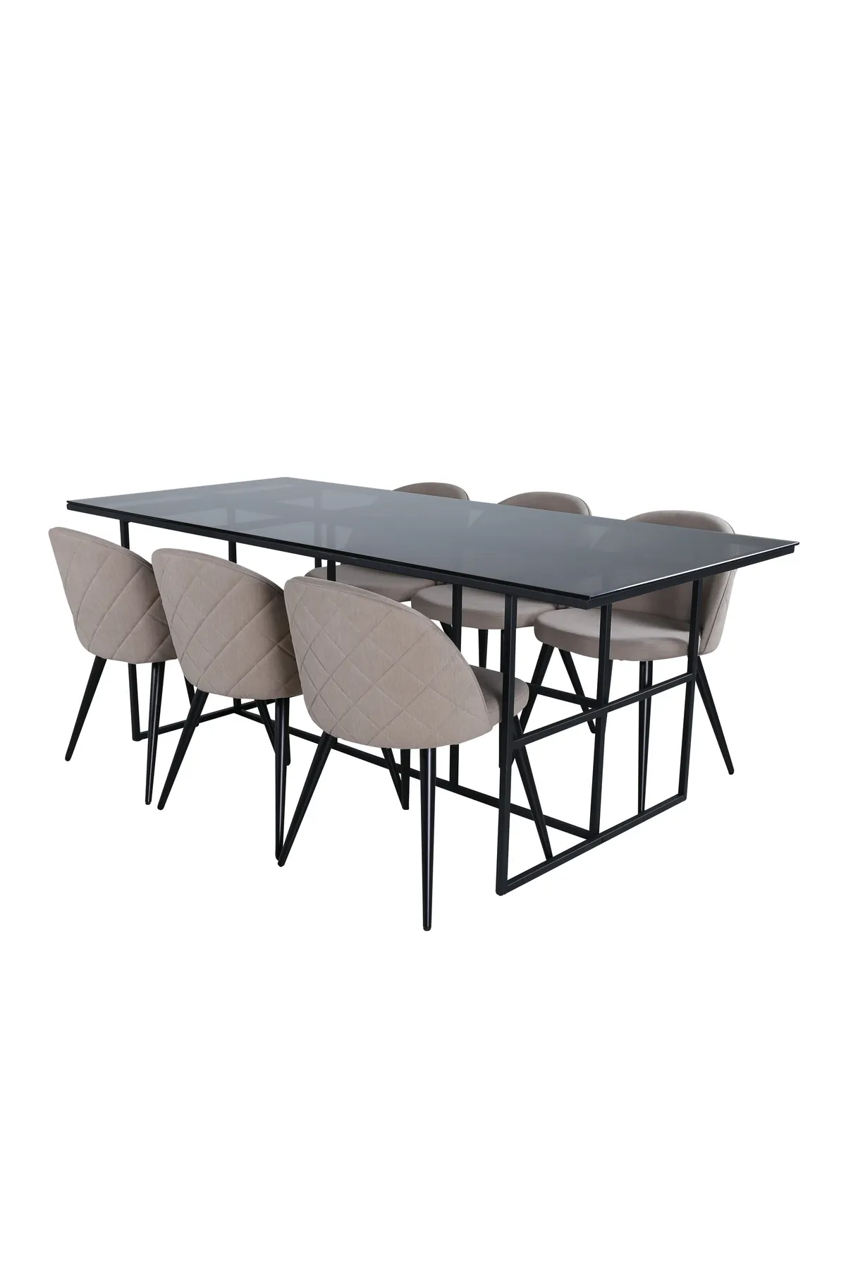 Dekorieren Sie Ihr Wohnzimmer modern und stilvoll! Der Esstisch Leif hat ein auffälliges Design mit einer eleganten Platte aus schwarzem Rauchglas und einem Gestell aus schwarzem Metall – inspiriert von den Industriewänden, die die Trendlisten anführen. Tisch-Abmessungen: Länge: 200cm, Breite: 90cm, Höhe: 74cm. Passend dazu 6 Samt-Esszimmerstühle mit Ziernähten im beigen Sitz aus Polyesterleinen und schwarzen Stuhlbeinen aus Eisen. Stuhl Abmessungen: Höhe: 76,5cm, Sitzhöhe: 46,5cm, Breite: 50cm, Tiefe: 57cm. Laden Sie zu vielen angenehmen Mahlzeiten ein!