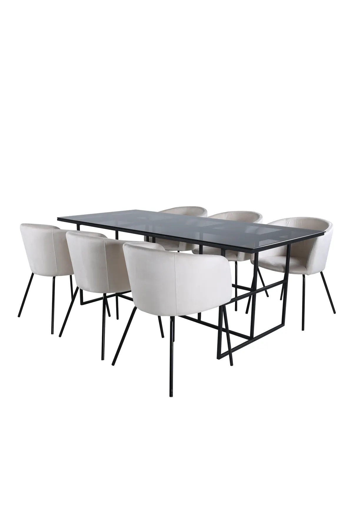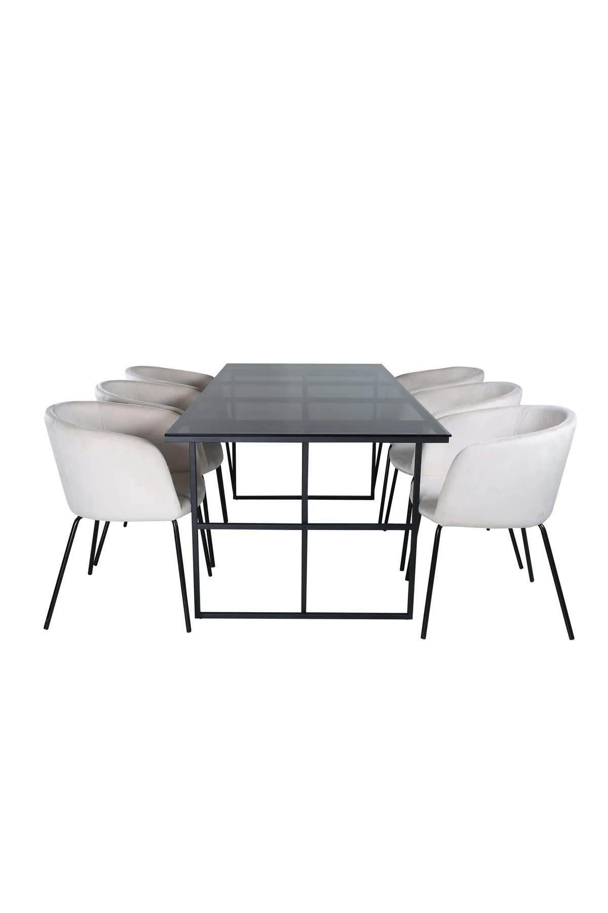 Eine Lebensmittelgruppe, die auf Komfort und Eleganz setzt! Esstisch Leif schafft schnell einen Blickfang, der durch seinen industriellen Look und seine geraden, minimalistischen Formen besticht. Die Platte ist aus schwarzem Rauchglas und der Korpus aus schwarzem Metall. Tisch-Abmessungen: Länge: 200cm, Breite: 90cm, Höhe: 74cm. Hier in perfekter Kombination mit 4 Berit Esszimmerstühlen in beigem Samtbezug und schmalen Stuhlbeinen aus schwarzem Eisen. Stuhl Maße: Höhe: 78cm, Sitzhöhe: 49cm, Breite: 55cm, Tiefe: 55cm. Bringen Sie Ihre Einrichtung auf die nächste Stufe mit einer modernen Essgruppe in einem schlanken Design!