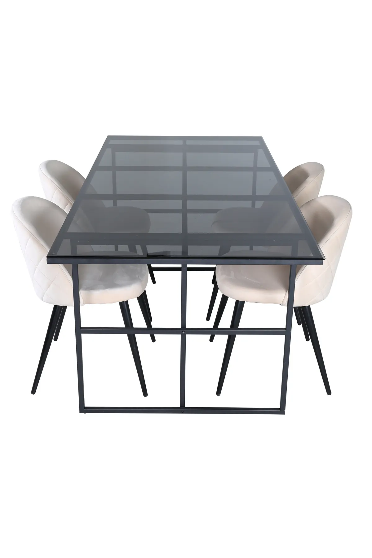 Dekorieren Sie Ihr Wohnzimmer modern und stilvoll! Der Esstisch Leif hat ein auffälliges Design mit einer eleganten Platte aus schwarzem Rauchglas und einem Gestell aus schwarzem Metall – inspiriert von den Industriewänden, die die Trendlisten anführen. Tisch-Abmessungen: Länge: 200cm, Breite: 90cm, Höhe: 74cm. Passend dazu 4 Velvet Stitches Esszimmerstühle mit einem weichen Sitz aus beigem Samt mit Ziernähten und schwarzen Stuhlbeinen aus Eisen. Abmessungen der Stühle: Höhe: 76,5cm, Sitzhöhe: 46,5cm, Breite: 50cm, Tiefe: 57cm. Laden Sie zu vielen angenehmen Mahlzeiten ein!